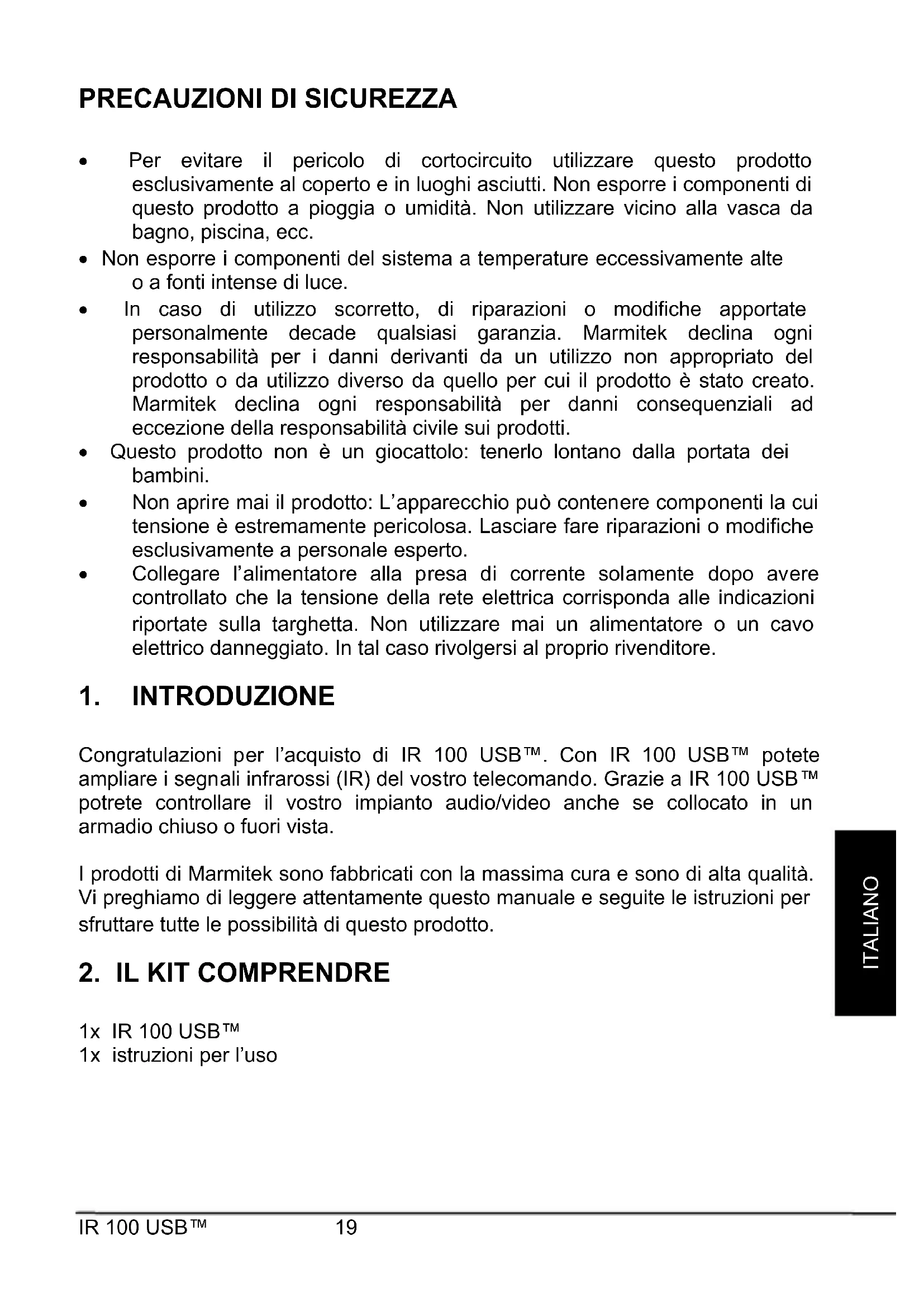 Congratulazioni per l’acquisto di IR 100 USB™. Con IR 100 USB™ potete ampliare i segnali infrarossi (IR) del vostro telecomando. Grazie a IR 100 USB™ potrete controllare il vostro impianto audio/video anche se collocato in un armadio chiuso o fuori vista. I prodotti di Marmitek sono fabbricati con la massima cura e sono di alta qualità. Vi preghiamo di leggere attentamente questo manuale e seguite le istruzioni per sfruttare tutte le possibilità di questo prodotto.