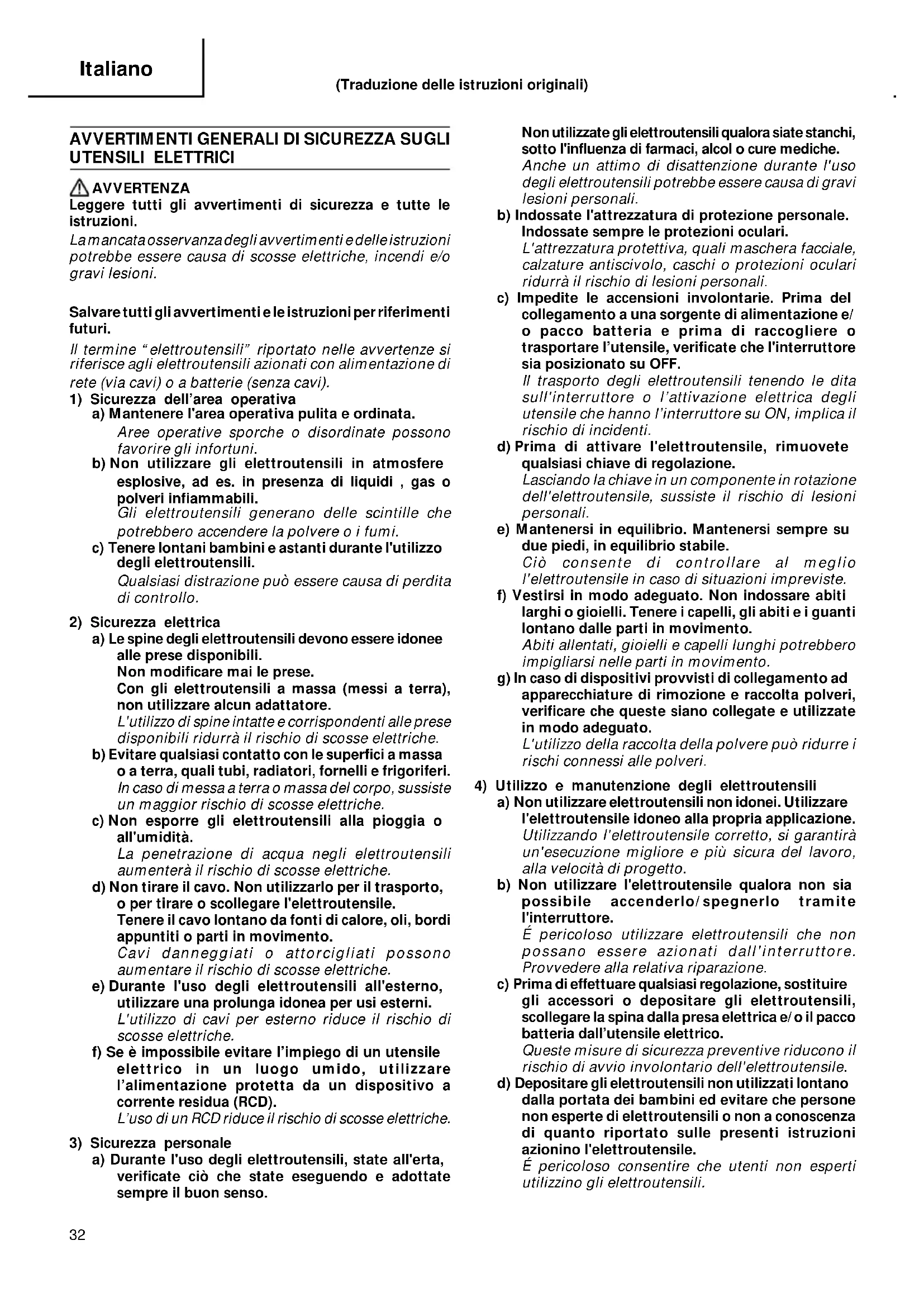 | Sicurezza | Indossare occhiali protettivi durante l'uso. Non utilizzare in ambienti umidi. Rispettare le istruzioni di sicurezza fornite nel manuale. |