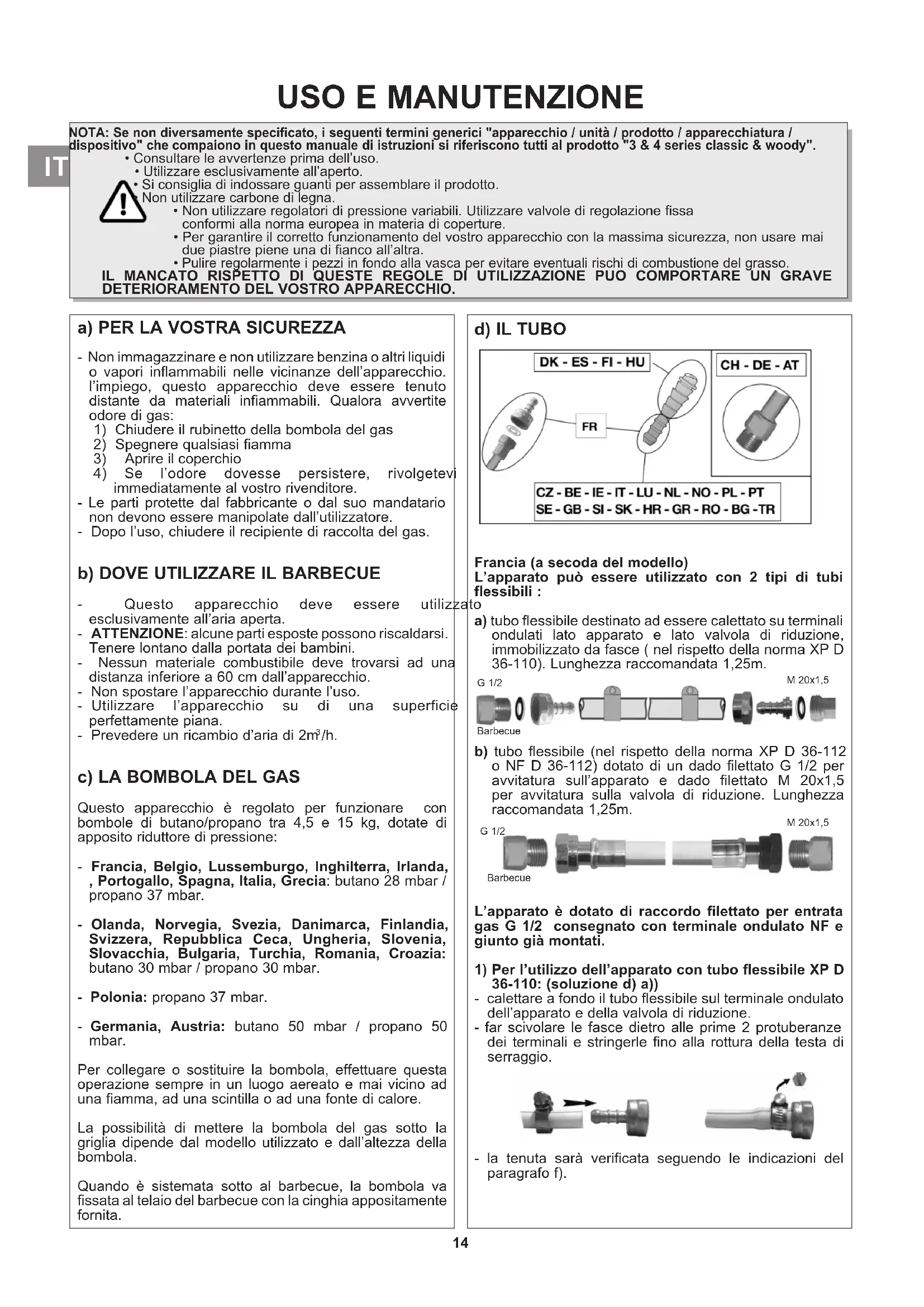 IT2) Per l’utilizzo dell’apparato con tubo flessibile XP D 36-112 o NF D 36-112, dadi G 1/2 e M 20x1,5 : (soluzione d) b)) - svitare e rimuovere il terminale ondulato NF per liberare il raccordo d’entrata G1/2. - rimuovere il giunto - svitare il dado filettato G 1/2 del tubo sul raccordo d’entrata dell’apparato ed il dado filettato M20x1,5 sul raccordo d’uscita della valvola di riduzione seguendo le indicazioni fornite assieme al tubo flessibile. - utilizzare una chiave per immobilizzare il raccordo d’entrata dell’apparato e stringere o allentare il dado filettato con un’altra chiave. - utilizzare una chiave per immobilizzare il raccordo d’uscita della valvola di riduzione - la tenuta sarà verificata seguendo le indicazioni del paragrafo f). Verificare che il tubo flessibile si sviluppi normalmente, senza torsioni o trazioni, né contatto con le pareti calde dell’apparato. Esso dovrà essere sostituito al sopraggiungere della data di scadenza, o in caso di danno e presenza di screpolature. Belgio, Lussemburgo, Inghilterra, Irlanda, Portogallo, Spagna, Italia, Croazia, Grecia, Olanda, Norvegia, Danimarca, Finlandia, Repubblica Ceca, Ungheria, Slovenia, Slovacchia, Bulgaria, Turchia, Romania, Polonia: L’apparecchio è dotato di un’estremità anellata: deve essere utilizzato con un tubo flessibile di qualità adatta all’uso del butano e del propano. La sua lunghezza non dovrà essere superiore a 1,20 m. Dovrà essere sostituito se è danneggiato, se presenta delle crepe, quando le condizioni nazionali lo impongono o a seconda della sua validità. Non tirare il tubo e non perforarlo. Tenerlo lontano dagli elementi che possono diventare caldi. Verificare che il tubo flessibile si sviluppi normalmente, senza torsioni o trazioni. Germania, Austria, Svizzera: Questo apparecchio deve essere utilizzato con un tubo flessibile di qualità adatta all’uso del butano e del propano. La sua lunghezza non dovrà superare 1,50 m. Dovrà essere sostituito se è danneggiato, se presenta delle crepe, quando le condizioni nazionali lo impongono o a seconda della sua validità. Non tirare il tubo e non perforarlo. Tenerlo lontano dagli elementi che possono diventare caldi. Verificare che il tubo flessibile si sviluppi normalmente, senza torsioni o trazioni. Collegamento del tubo flessibile: per collegare il tubo all’estremità dell’apparecchio, stringere forte il dado del tubo, senza esagerare, con le 2 chiavi previste: - chiave 14 per bloccare l’estremità - chiave 17 per avvitare il dado del tubo e) IL COPERCHIO Maneggiare il coperchio con precauzione, in particolare durante l’uso. Non sporgersi sul focolare. f) PROVE DI TENUTA