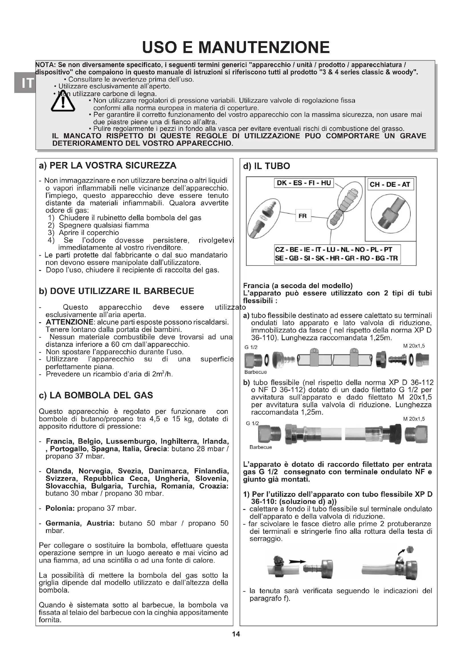 IT2) Per l’utilizzo dell’apparato con tubo flessibile XP D 36-112 o NF D 36-112, dadi G 1/2 e M 20x1,5 : (soluzione d) b)) - svitare e rimuovere il terminale ondulato NF per liberare il raccordo d’entrata G1/2. - rimuovere il giunto - svitare il dado filettato G 1/2 del tubo sul raccordo d’entrata dell’apparato ed il dado filettato M20x1,5 sul raccordo d’uscita della valvola di riduzione seguendo le indicazioni fornite assieme al tubo flessibile. - utilizzare una chiave per immobilizzare il raccordo d’entrata dell’apparato e stringere o allentare il dado filettato con un’altra chiave. - utilizzare una chiave per immobilizzare il raccordo d’uscita della valvola di riduzione - la tenuta sarà verificata seguendo le indicazioni del paragrafo f). Verificare che il tubo flessibile si sviluppi normalmente, senza torsioni o trazioni, né contatto con le pareti calde dell’apparato. Esso dovrà essere sostituito al sopraggiungere della data di scadenza, o in caso di danno e presenza di screpolature. Belgio, Lussemburgo, Inghilterra, Irlanda, Portogallo, Spagna, Italia, Croazia, Grecia, Olanda, Norvegia, Danimarca, Finlandia, Repubblica Ceca, Ungheria, Slovenia, Slovacchia, Bulgaria, Turchia, Romania, Polonia: L’apparecchio è dotato di un’estremità anellata: deve essere utilizzato con un tubo flessibile di qualità adatta all’uso del butano e del propano. La sua lunghezza non dovrà essere superiore a 1,20 m. Dovrà essere sostituito se è danneggiato, se presenta delle crepe, quando le condizioni nazionali lo impongono o a seconda della sua validità. Non tirare il tubo e non perforarlo. Tenerlo lontano dagli elementi che possono diventare caldi. Verificare che il tubo flessibile si sviluppi normalmente, senza torsioni o trazioni. Germania, Austria, Svizzera: Questo apparecchio deve essere utilizzato con un tubo flessibile di qualità adatta all’uso del butano e del propano. La sua lunghezza non dovrà superare 1,50 m. Dovrà essere sostituito se è danneggiato, se presenta delle crepe, quando le condizioni nazionali lo impongono o a seconda della sua validità. Non tirare il tubo e non perforarlo. Tenerlo lontano dagli elementi che possono diventare caldi. Verificare che il tubo flessibile si sviluppi normalmente, senza torsioni o trazioni. Collegamento del tubo flessibile: per collegare il tubo all’estremità dell’apparecchio, stringere forte il dado del tubo, senza esagerare, con le 2 chiavi previste: - chiave 14 per bloccare l’estremità - chiave 17 per avvitare il dado del tubo e) IL COPERCHIO Maneggiare il coperchio con precauzione, in particolare durante l’uso. Non sporgersi sul focolare. f) PROVE DI TENUTA