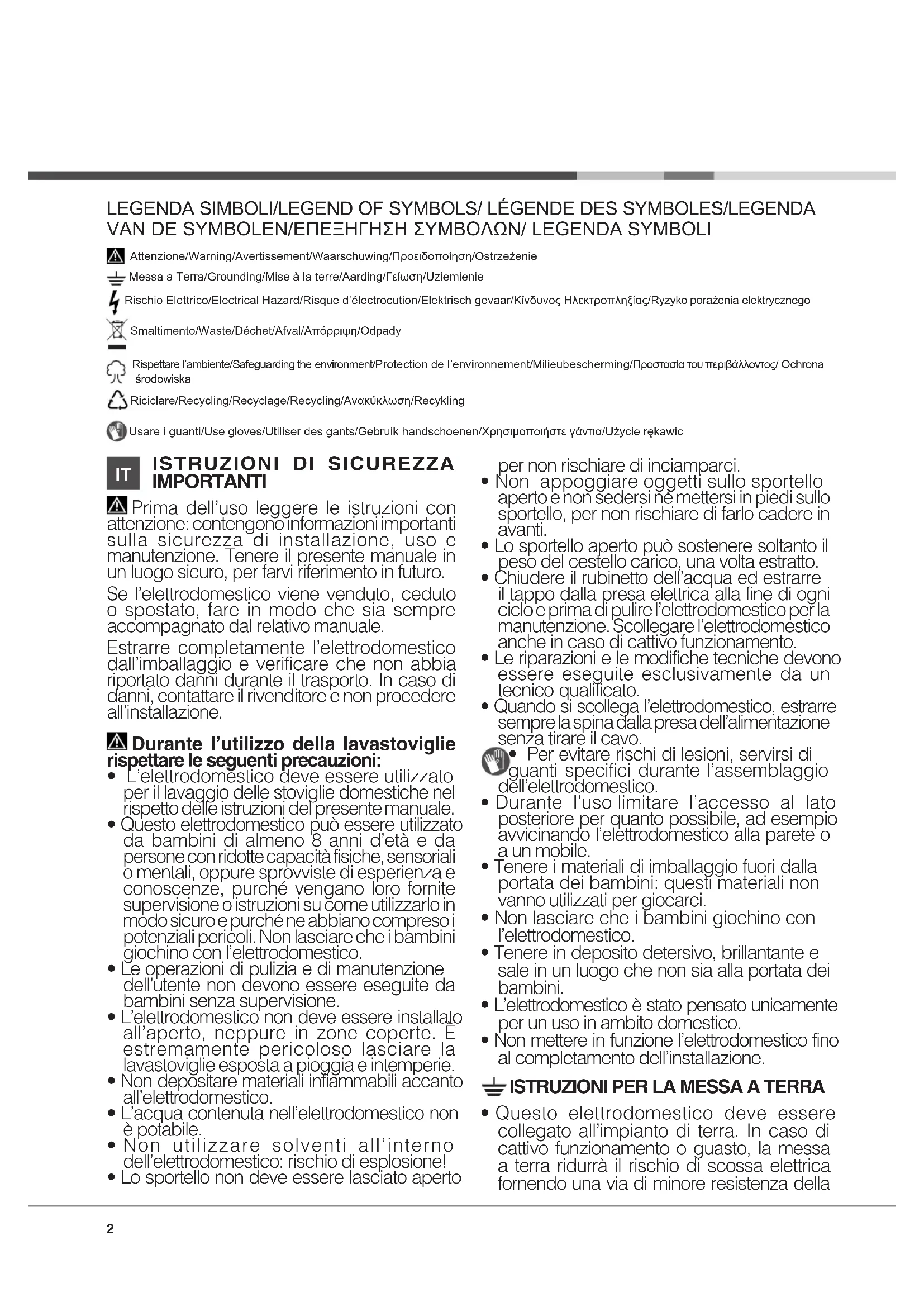 IMPORTANTI Prima dell’uso leggere le istruzioni con attenzione: contengono informazioni importanti sulla sicurezza di installazione, uso e manutenzione. Tenere il presente manuale in un luogo sicuro, per farvi riferimento in futuro. Se l’elettrodomestico viene venduto, ceduto o spostato, fare in modo che sia sempre accompagnato dal relativo manuale. Estrarre completamente l’elettrodomestico dall’imballaggio e verificare che non abbia riportato danni durante il trasporto. In caso di danni, contattare il rivenditore e non procedere all’installazione. Durante l’utilizzo della lavastoviglie rispettare le seguenti precauzioni: