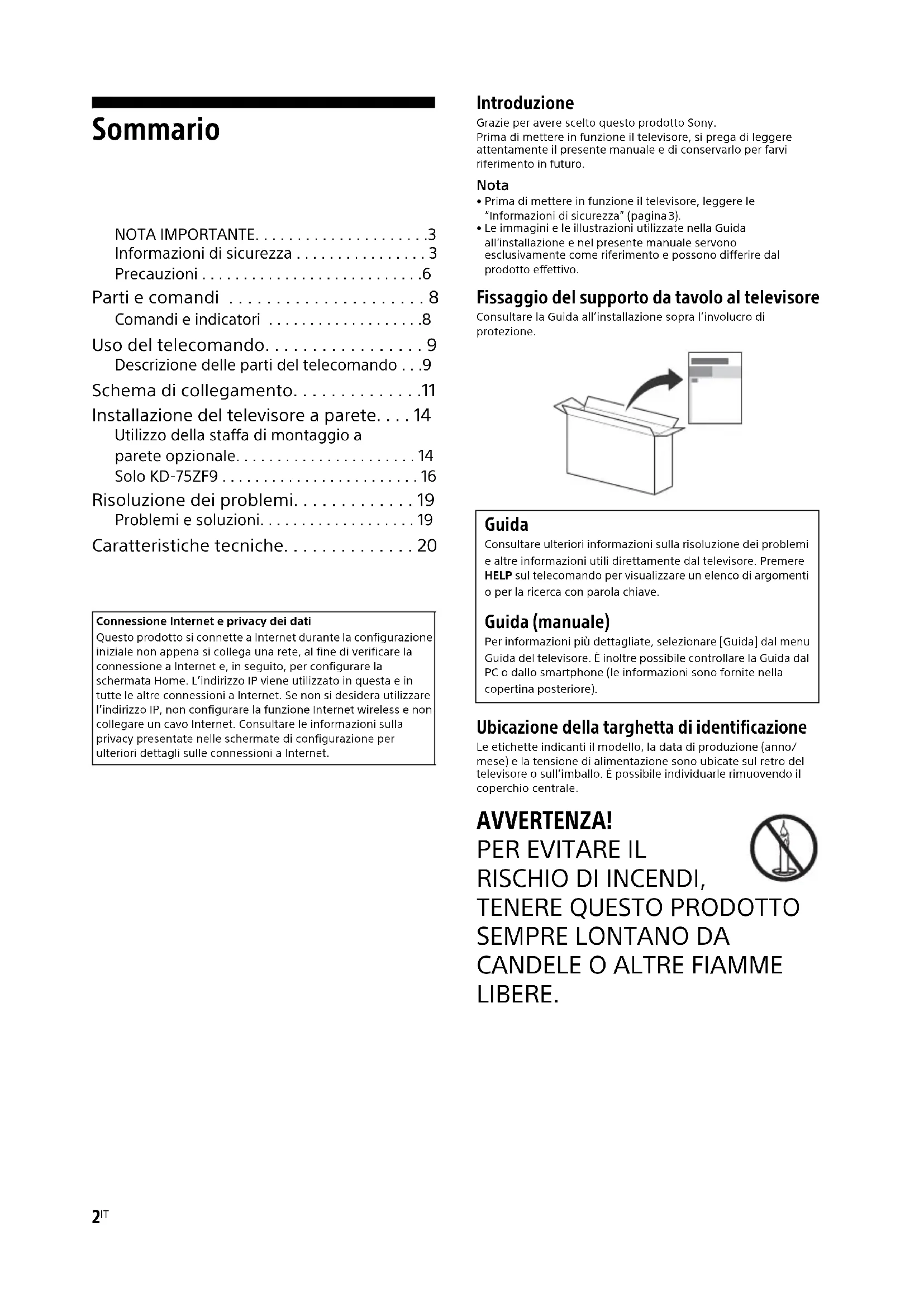 LIBERE. Connessione Internet e privacy dei datiQuesto prodotto si connette a Internet durante la configurazione iziale non appena si collega una rete, al fine di verificare la connessione a Internet e, in seguito, per configurare la schermata Home. L’indirizzo IP viene utilizzato in questa e in tutte le altre connessioni a Internet. Se non si desidera utilizzare l’indirizzo IP, non configurare la funzione Internet wireless e non collegare un cavo Internet. Consultare le informazioni sulla privacy presentate nelle schermate di configurazione per ulteriori dettagli sulle connessioni a Internet. Guida Consultare ulteriori informazioni sulla risoluzione dei problemi e altre informazioni utili direttamente dal televisore. Premere HELP sul telecomando per visualizzare un elenco di argomenti o per la ricerca con parola chiave. Guida (manuale) Per informazioni più dettagliate, selezionare [Guida] dal menu Guida del televisore. È inoltre possibile controllare la Guida dal PC o dallo smartphone (le informazioni sono fornite nella copertina posteriore).3