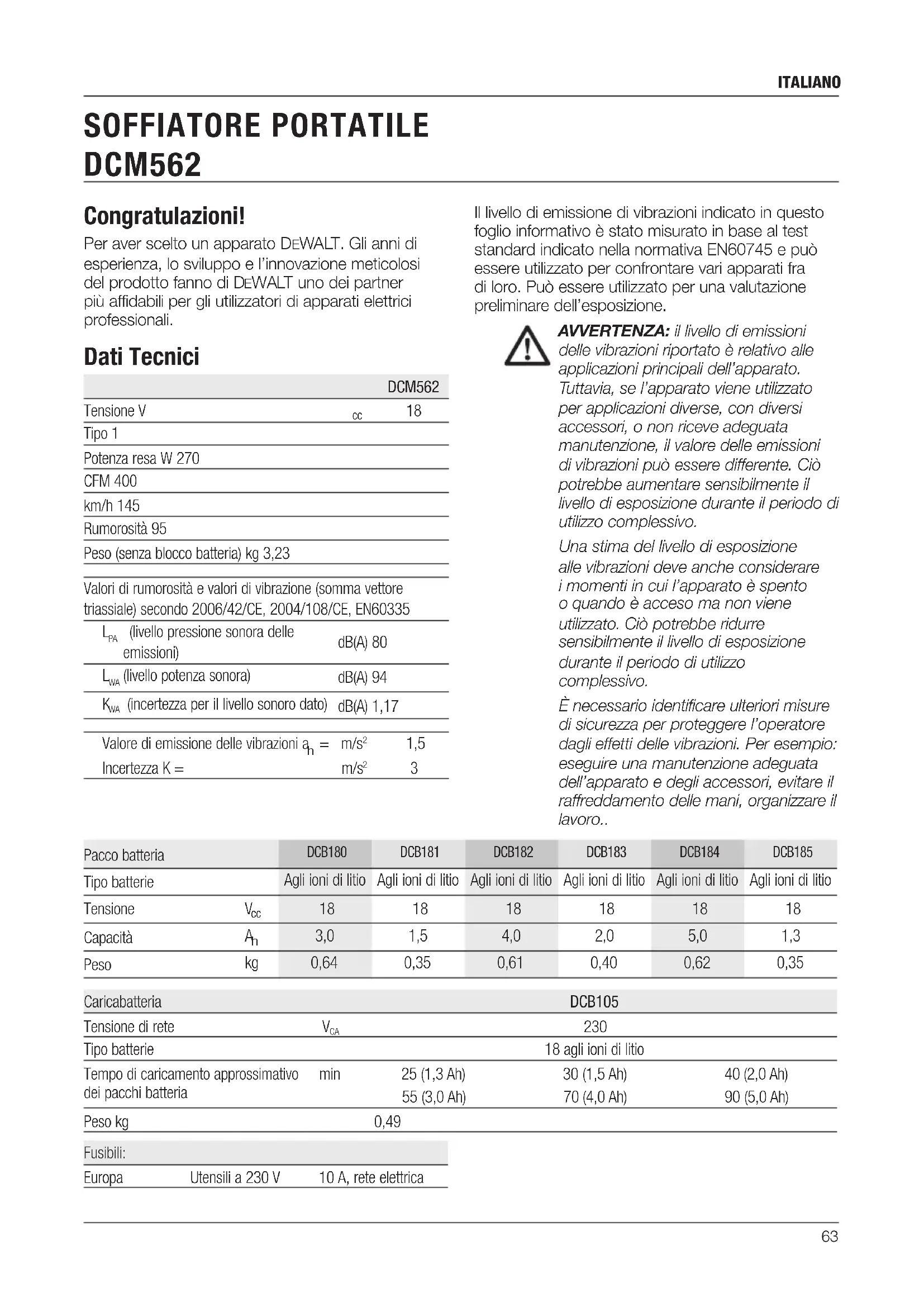 Tipo batterie 18 agli ioni di litio Tempo di caricamento approssimativo dei pacchi batteria min 25 (1,3 Ah) 30 (1,5 Ah) 40 (2,0 Ah) 55 (3,0 Ah) 70 (4,0 Ah) 90 (5,0 Ah) Peso kg 0,49 Fusibili: Europa Utensili a 230V 10A, rete elettrica Il livello di emissione di vibrazioni indicato in questo foglio informativo è stato misurato in base al test standard indicato nella normativa EN60745 e può essere utilizzato per confrontare vari apparati fra di loro. Può essere utilizzato per una valutazione preliminare dell’esposizione. AVVERTENZA: il livello di emissioni delle vibrazioni riportato è relativo alle applicazioni principali dell’apparato. Tuttavia,sel’apparatovieneutilizzato per applicazioni diverse, con diversi accessori, o non riceve adeguata manutenzione, il valore delle emissioni divibrazionipuòesseredifferente.Ciò potrebbe aumentare sensibilmente il livello di esposizione durante il periodo di utilizzo complessivo. Una stima del livello di esposizione alle vibrazioni deve anche considerare i momenti in cui l’apparato è spento oquandoèaccesomanonviene utilizzato.Ciòpotrebberidurre sensibilmente il livello di esposizione durante il periodo di utilizzo complessivo. È necessario identificare ulteriori misure di sicurezza per proteggere l’operatore daglieffettidellevibrazioni.Peresempio: eseguire una manutenzione adeguata dell’apparato e degli accessori, evitare il raffreddamento delle mani, organizzare il lavoro..64 italiano Il firmatario è responsabile della compilazione del documento tecnico e rende questa dichiarazione per conto di DeWALT. Markus Rompel Directeur Engineering DeWALT, Richard-Klinger-Strase 11, D-65510, Idstein, Germania