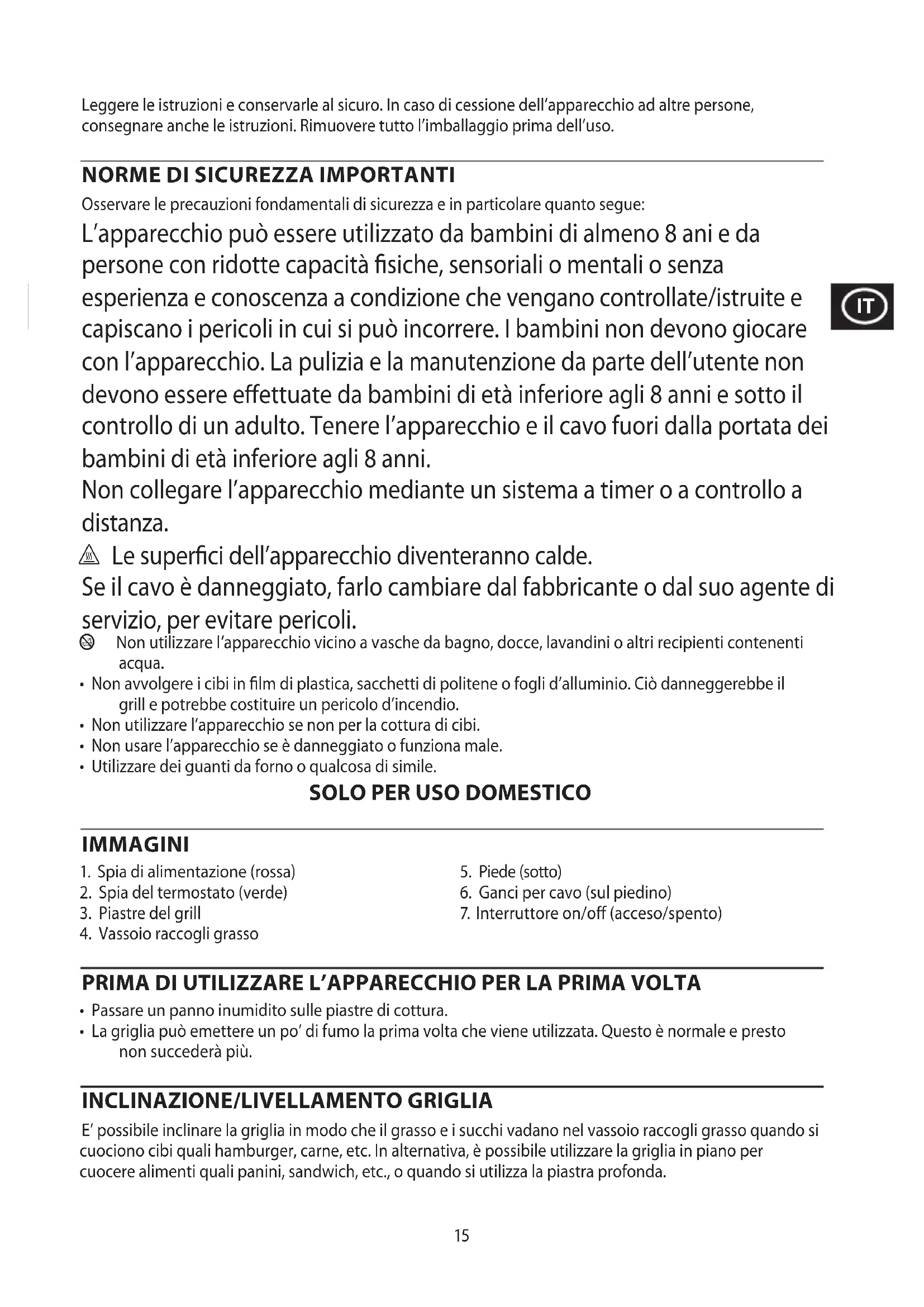 - La griglia può emettere un po’ di fumo la prima volta che viene utilizzata. Questo è normale e presto non succederà più.