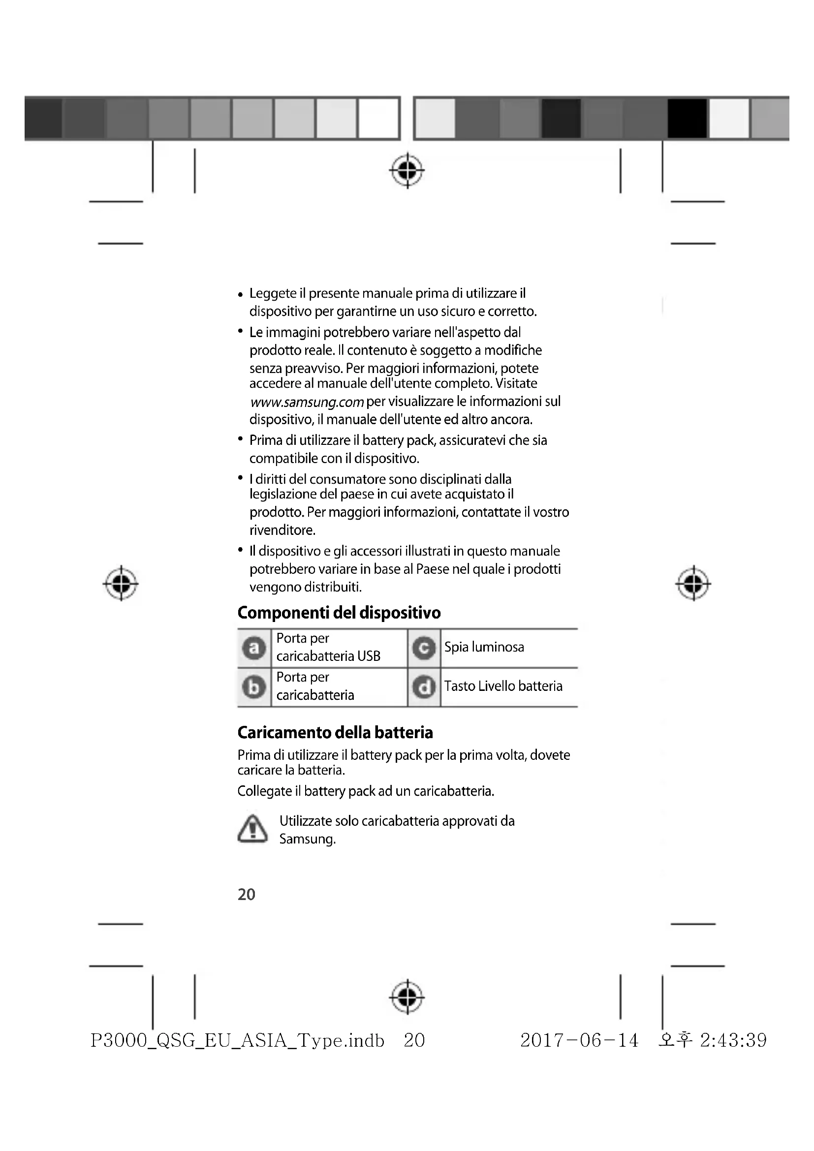 Il dispositivo e gli accessori illustrati in questo manuale potrebbero variare in base al Paese nel quale i prodotti vengono distribuiti. Componenti del dispositivo Porta per caricabatteria USB Spia luminosa Porta per caricabatteria Tasto Livello batteria Caricamento della batteria Prima di utilizzare il battery pack per la prima volta, dovete caricare la batteria. Collegate il battery pack ad un caricabatteria. Utilizzate solo caricabatteria approvati da Samsung. Italiano P3000_QSG_EU_ASIA_Type.indb 20P3000_QSG_EU_ASIA_Type.indb 20 2017-06-14 오후 2:43:392017-06-14 오후 2:43:3921 Italiano