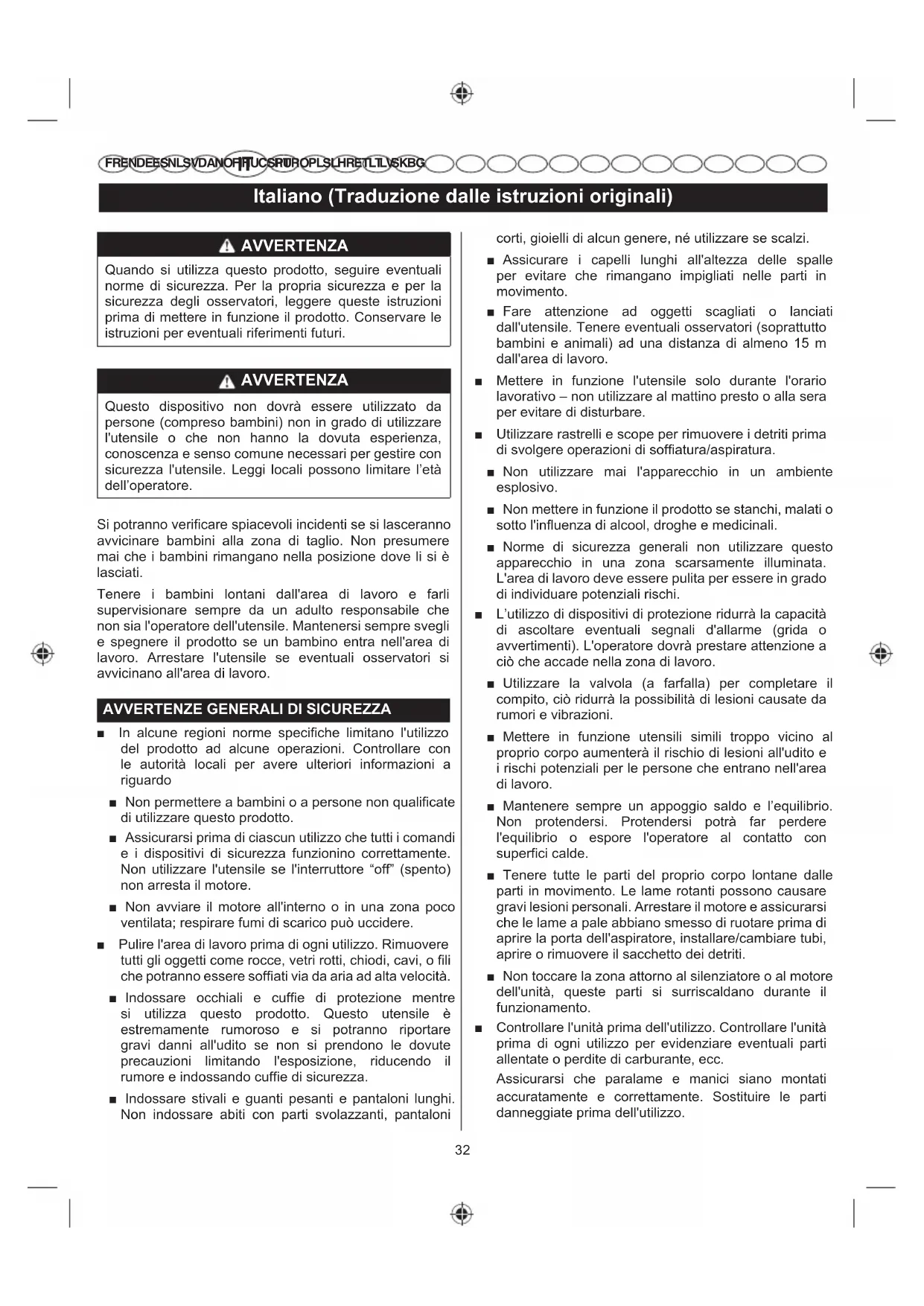FR EN DE ES NL SV DA NO FI HU CS RU RO PL SL HR ET LT LV SK BG AVVERTENZA Quando si utilizza questo prodotto, seguire eventuali norme di sicurezza. Per la propria sicurezza e per la sicurezza degli osservatori, leggere queste istruzioni prima di mettere in funzione il prodotto. Conservare le istruzioni per eventuali riferimenti futuri. AVVERTENZA Questo dispositivo non dovrà essere utilizzato da persone (compreso bambini) non in grado di utilizzare l'utensile o che non hanno la dovuta esperienza, conoscenza e senso comune necessari per gestire con sicurezza l'utensile. Leggi locali possono limitare l’età dell’operatore. 6LSRWUDQQRYHUL¿FDUHVSLDFHYROLLQFLGHQWLVHVLODVFHUDQQR avvicinare bambini alla zona di taglio. Non presumere mai che i bambini rimangano nella posizione dove li si è lasciati. Tenere i bambini lontani dall'area di lavoro e farli supervisionare sempre da un adulto responsabile che non sia l'operatore dell'utensile. Mantenersi sempre svegli e spegnere il prodotto se un bambino entra nell'area di lavoro. Arrestare l'utensile se eventuali osservatori si avvicinano all'area di lavoro.