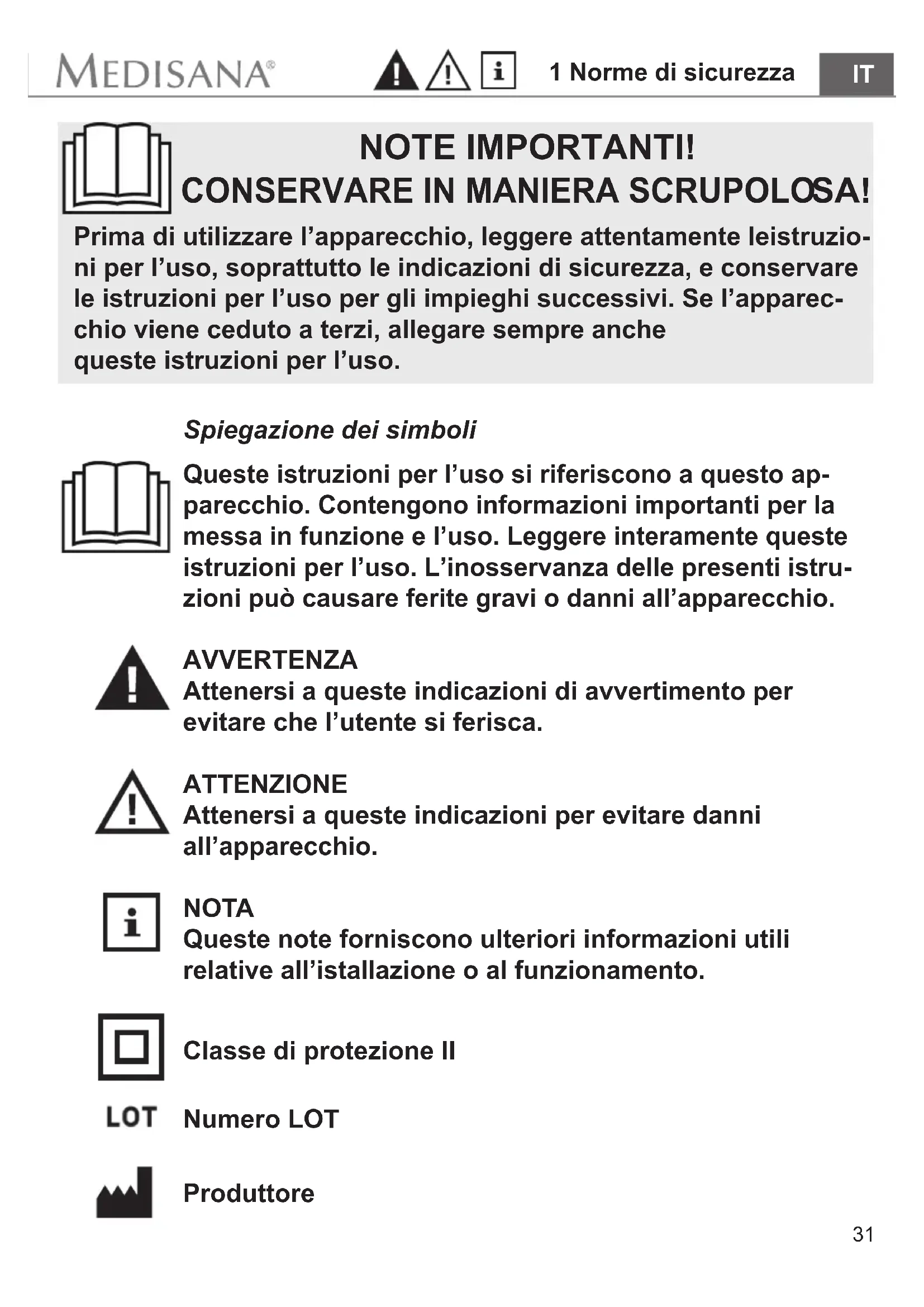SA! Prima di utilizzare l’apparecchio, leggere attentamente leistruzio- ni per l’uso, soprattutto le indicazioni di sicurezza, e conservare le istruzioni per l’uso per gli impieghi successivi. Se l’apparec- chio viene ceduto a terzi, allegare sempre anche queste istruzioni per l’uso. Spiegazione dei simboli Queste istruzioni per l’uso si riferiscono a questo ap- parecchio. Contengono informazioni importanti per la messa in funzione e l’uso. Leggere interamente queste istruzioni per l’uso. L’inosservanza delle presenti istru- zioni può causare ferite gravi o danni all’apparecchio. AVVERTENZA Attenersi a queste indicazioni di avvertimento per evitare che l’utente si ferisca. ATTENZIONE Attenersi a queste indicazioni per evitare danni all’apparecchio. NOTA Queste note forniscono ulteriori informazioni utili relative all’istallazione o al funzionamento. Numero LOT Produttore Classe di protezione II32 1 Norme di sicurezza