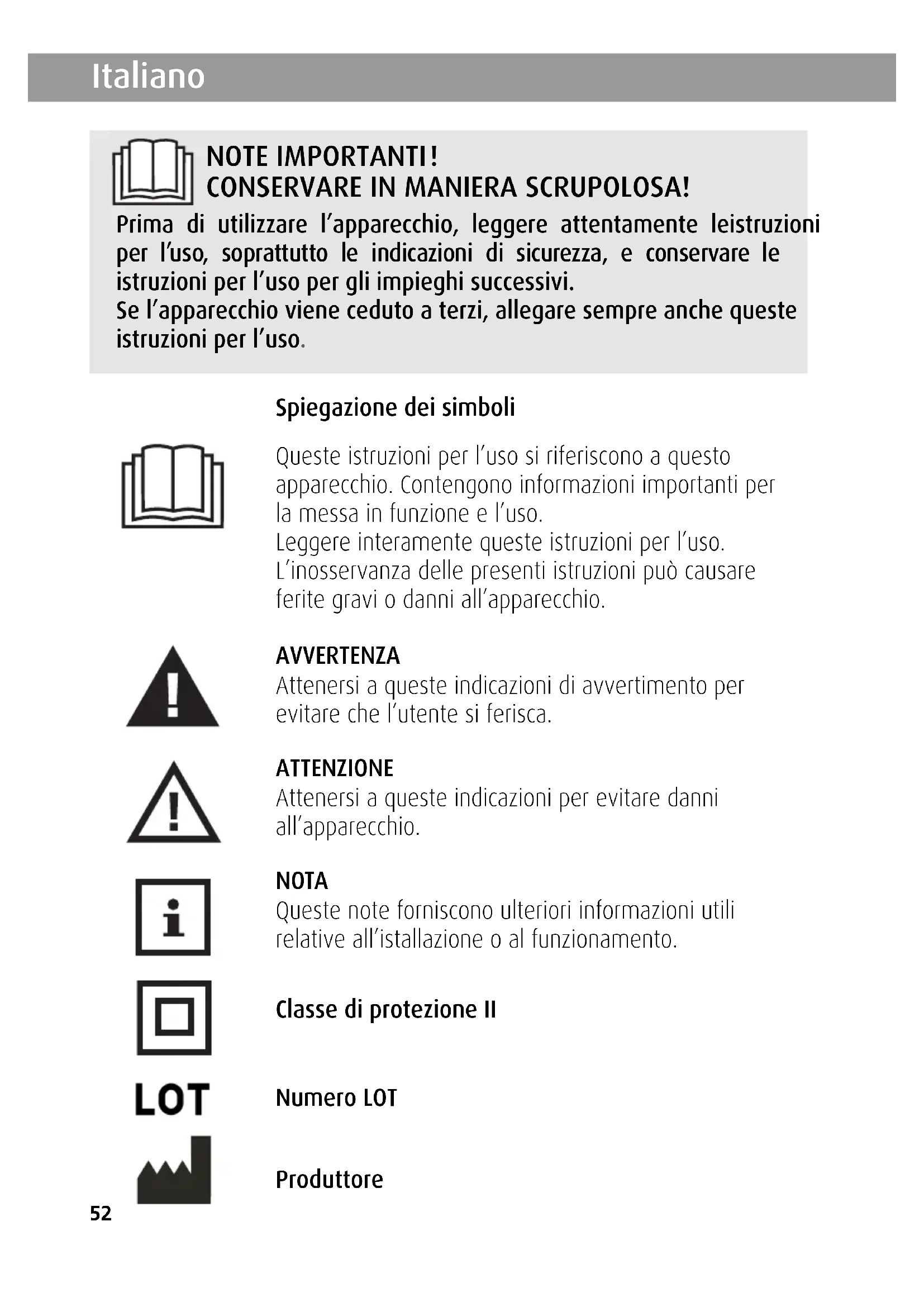 Spiegazione dei simboli Queste istruzioni per l’uso si riferiscono a questo apparecchio. Contengono informazioni importanti per la messa in funzione e l’uso. Leggere interamente queste istruzioni per l’uso. L’inosservanza delle presenti istruzioni può causare ferite gravi o danni all’apparecchio. AVVERTENZA Attenersi a queste indicazioni di avvertimento per evitare che l’utente si ferisca. ATTENZIONE Attenersi a queste indicazioni per evitare danni all’apparecchio. NOTA Queste note forniscono ulteriori informazioni utili relative all’istallazione o al funzionamento. Classe di protezione II Numero LOT Produttore 88830_PR-H90_DE-GB_NL_FR_ES_GR_IT_01072016_Kompakt-GA 01.07.16 17:13 Seite 5253 Italiano 1 Norme di sicurezza! Informazioni sull’alimentazione di corrente