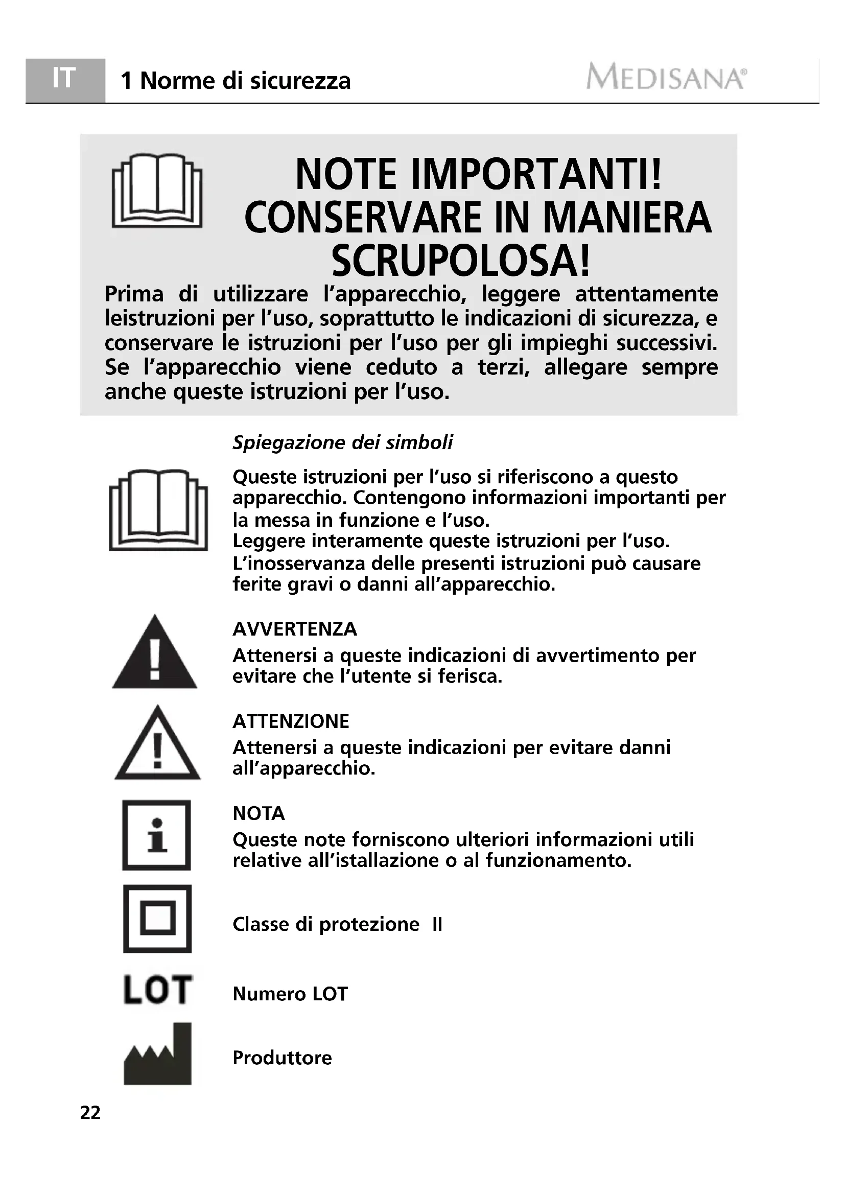 - L'utilizzatore può effettuare solo interventi di pulizia sull'appa- recchio. In caso di guasti, non riparare l'apparecchio personal- mente, pena l'estinzione di qualsiasi diritto a garanzia. Consultare il proprio rivenditore specializzato e fare eseguire le riparazioni esclusivamente dal servizio di assistenza MEDISANA.