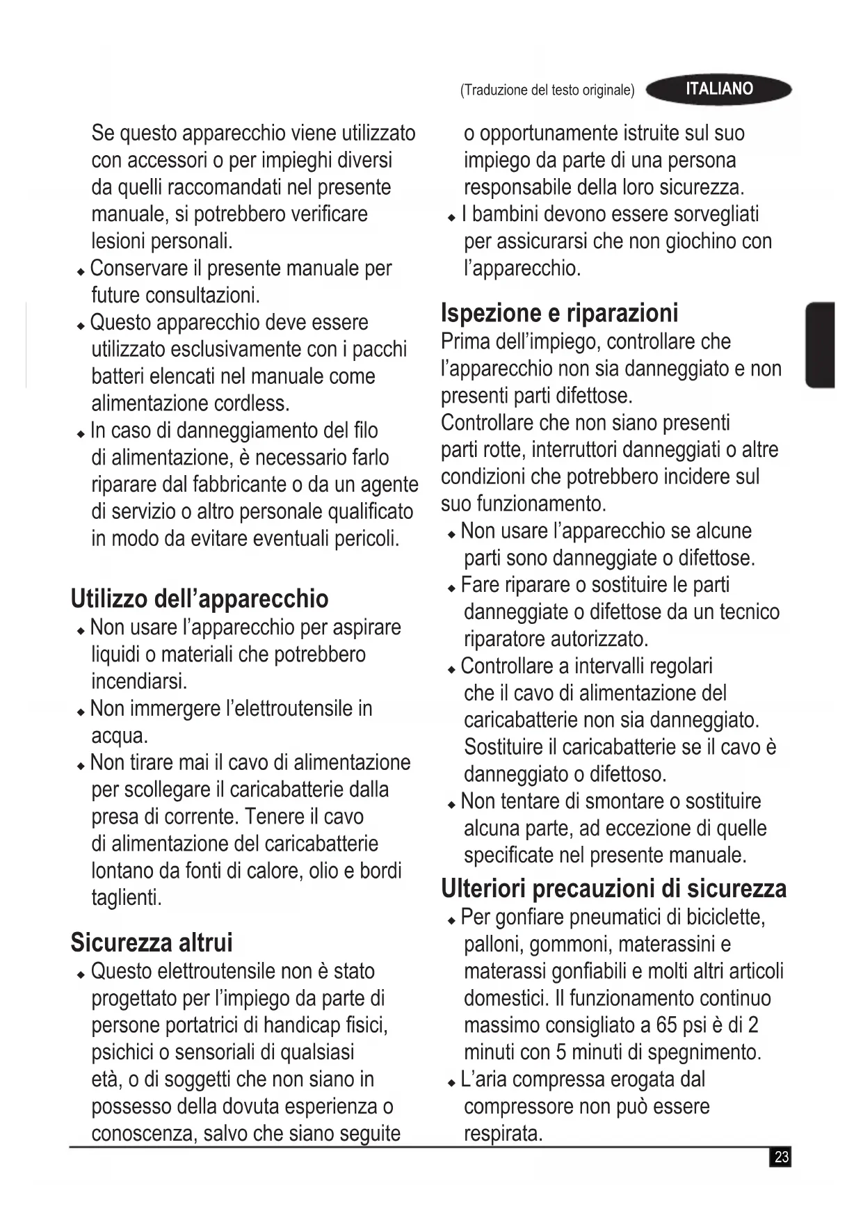 - Questo elettroutensile non è stato progettato per l'impiego da parte di persone portatrici di handicap fisici, psichici o sensoriali di qualsiasi età, o di soggetti che non siano in possesso della dovuta esperienza o conoscenza, salvo che siano seguite