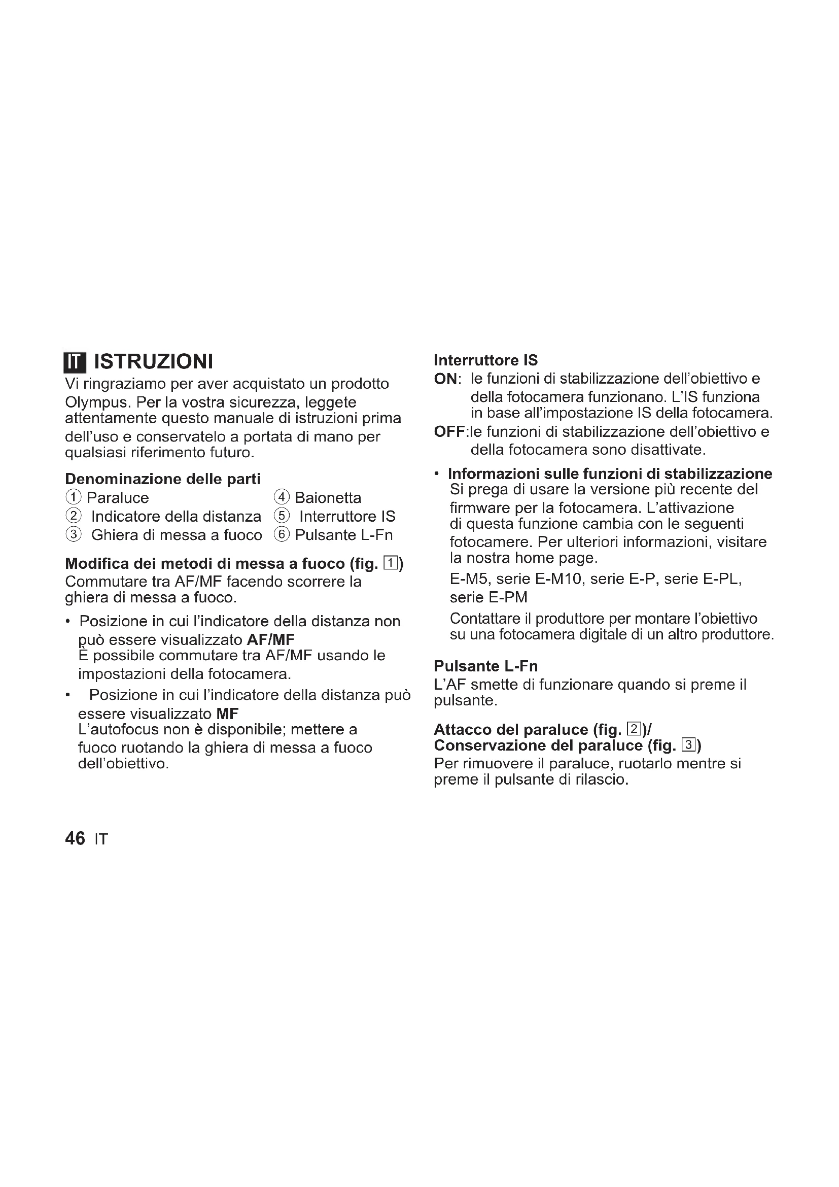 - Informazioni sulle funzioni di stabilizzazione Si prega di usare la versione più recente del firmware per la fotocamera. L’attivazione di questa funzione cambia con le seguenti fotocamere. Per ulteriori informazioni, visitare la nostra home page. E-M5, serie E-M10, serie E-P, serie E-PL, serie E-PM Contattare il produttore per montare l’obiettivo su una fotocamera digitale di un altro produttore. Pulsante L-Fn L’AF smette di funzionare quando si preme il pulsante. Attacco del paraluce (fig. 2)/ Conservazione del paraluce (fig. 3) Per rimuovere il paraluce, ruotarlo mentre si preme il pulsante di rilascio. ITIT 47 Note sulla ripresa