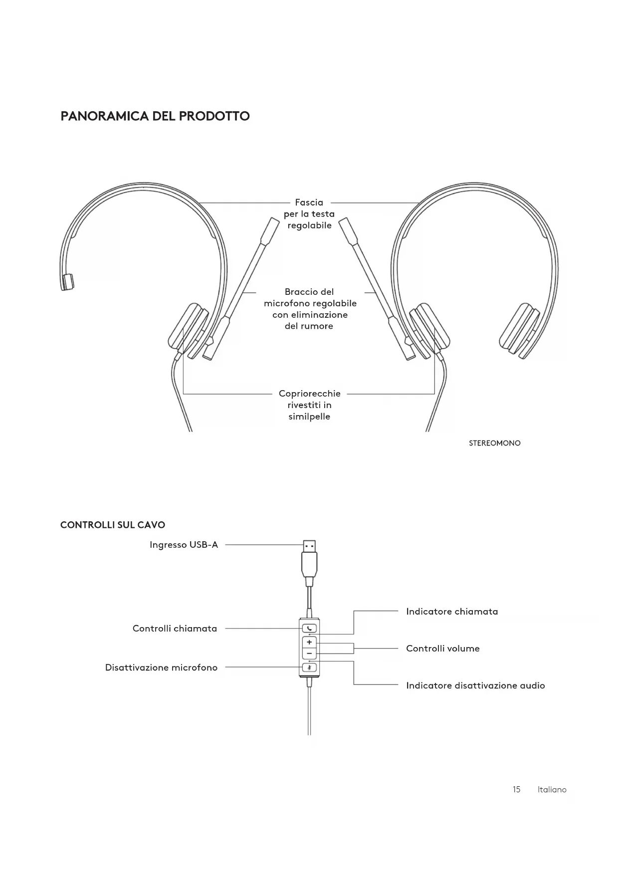 MONO 1 Cua con microfono dotata di controlli sul cavo econnettore USB-A 2 Documentazione per l'utente STEREO 1 Cua con microfono dotata di controlli sul cavo econnettore USB-A 2 Documentazione per l'utente USB-A USB-A