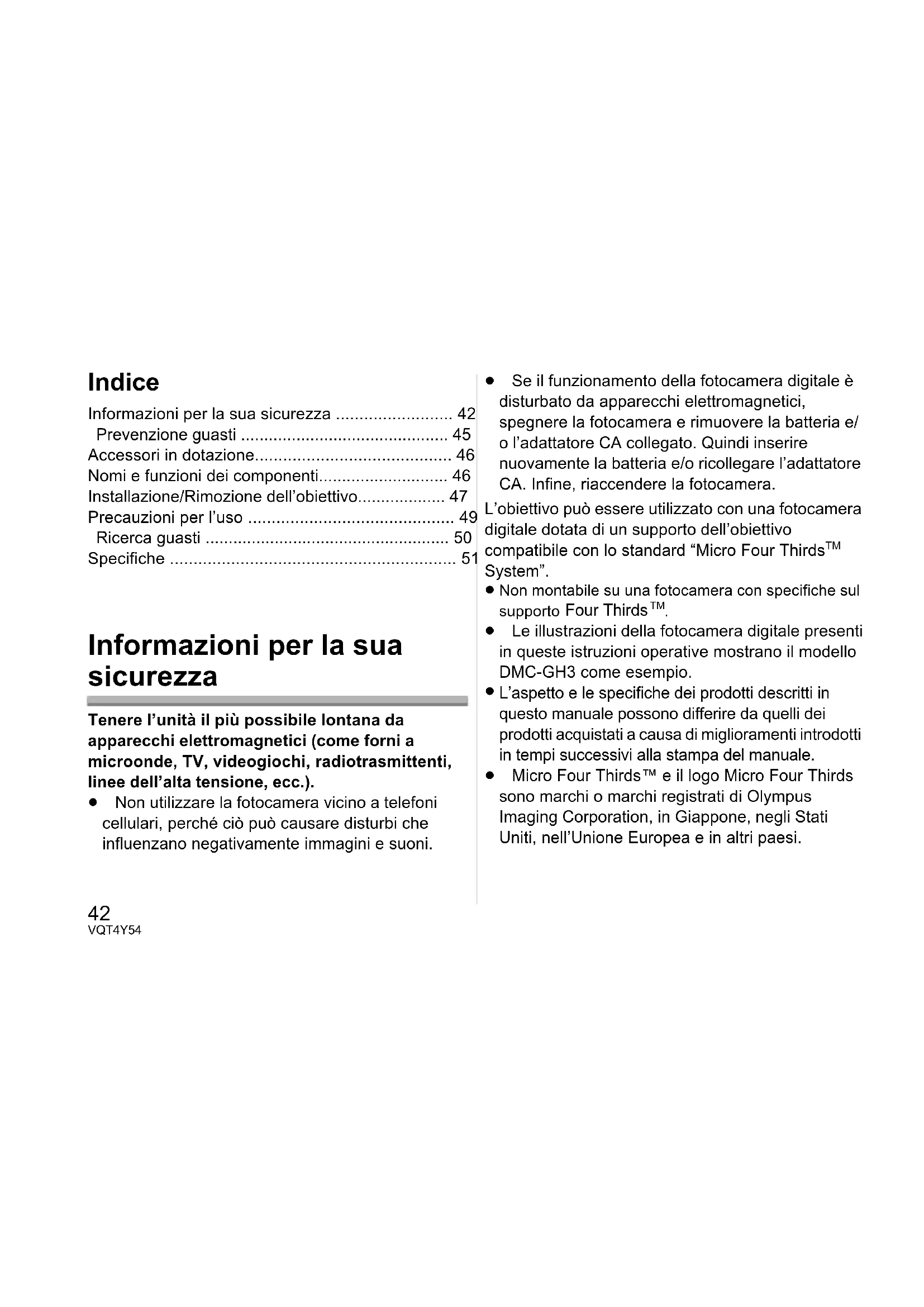 Se tali sostanze vengono a contatto con l’obiettivo possono danneggiarlo o provocare il distacco di vernice. Non lasciare l’unità installata sulla fotocamera mentre la si trasporta. ≥ Non utilizzare e non lasciare mai l’unità nelle seguenti condizioni, per evitare problemi di funzionamento. – Esposta alla luce del sole, o in spiaggia d’estate – Temperatura e umidità elevate o soggette a grossi sbalzi – Elevate concentrazioni di sabbia, polvere o sporco – Dove sono presenti fiamme – Vicino a caloriferi, condizionatori o umidificatori – Dove l’unità può venire a contatto con l’acqua – Dove sono presenti vibrazioni – All’interno di un’auto ≥ Vedere anche le istruzioni per l’uso della fotocamera digitale. ≥ Quando si prevede di non utilizzare l’unità per un periodo prolungato, si consiglia di porvi accanto un disseccante (silica gel). In caso contrario potrebbero verificarsi dei malfunzionamenti dovuti alla presenza di muffe ecc. Si consiglia di controllare il funzionamento dell’unità prima dell’uso. ≥ Non lasciare l’obiettivo a contatto per lungo tempo con prodotti in gomma o in plastica. ≥ Non toccare i contatti elettrici dell’unità. In caso contrario l’unità può guastarsi. ≥ Non smontare o alterare l’unità. Non utilizzare benzina, diluenti, alcol o prodotti simili per pulire l’unità. ≥ L’utilizzo di solventi può danneggiare l’obiettivo o provocare il distacco di vernice. ≥ Rimuovere la polvere o le impronte digitali eventualmente presenti con un panno morbido e asciutto. ≥ Usare un panno asciutto per rimuovere sporco e polvere sulla ghiera dello zoom e sulla ghiera della messa a fuoco. ≥ Non utilizzare un detergente da cucina o un panno chimico. Quando la fotocamera viene accesa o spenta, si sente un suono. ≥ È il suono provocato dal movimento dell’obiettivo o dell’apertura, e non si tratta di un malfunzionamento. Ricerca guasti VQT4Y54_E.book 50 ページ 2013年4月12日 金曜日 午後2時2分51 VQT4Y54 Specifiche È possibile che le specifiche subiscano delle modifiche senza preavviso.