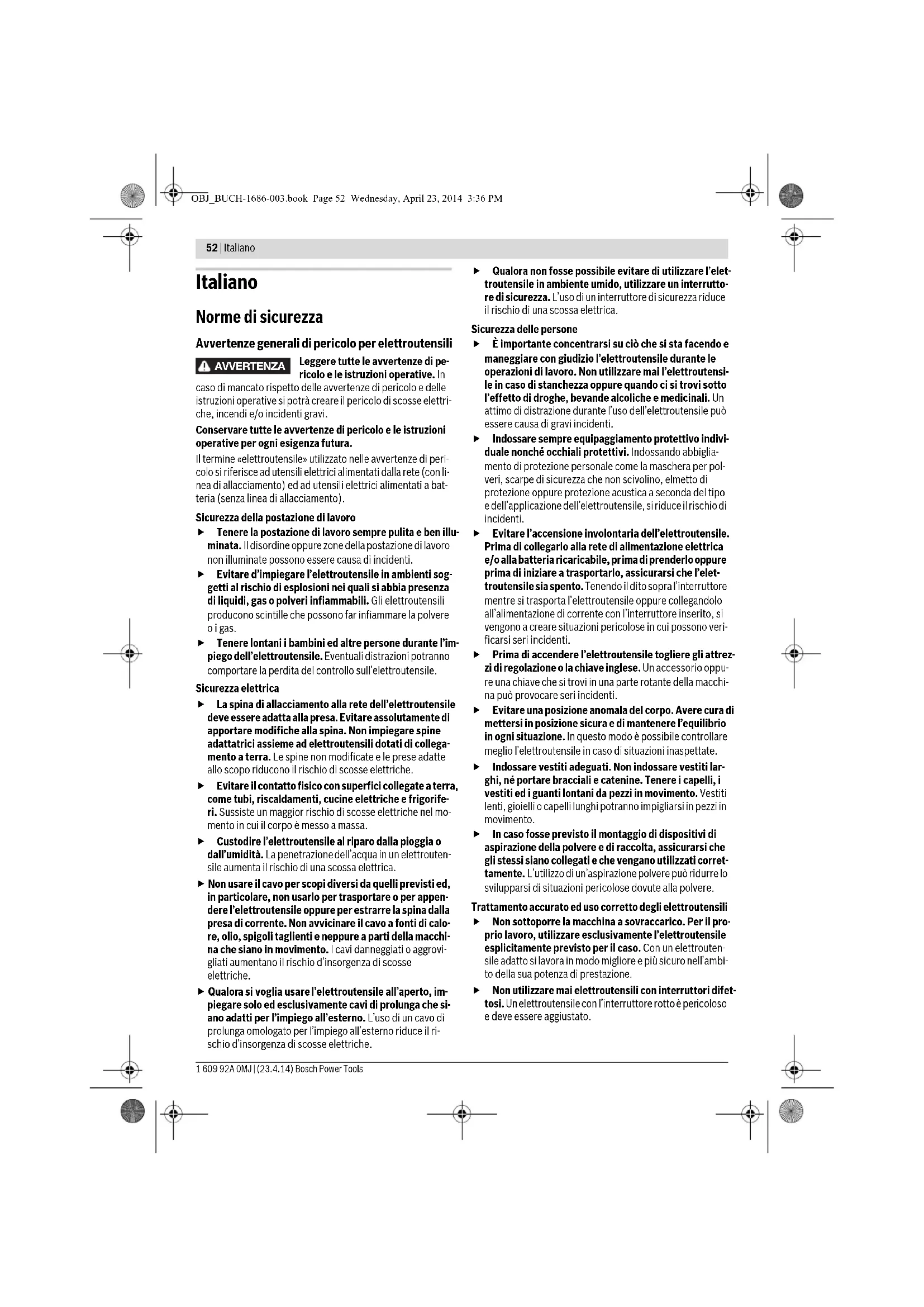 5,2 5,1 5,2 5,1 Classe di sicurezza /II /II I dati sono validi per una tensione nominale [U] di 230 V. In caso di ten-sioni differenti e di modelli specifici dei paesi di impiego, questi dati possono variare.Esclusivamente per elettroutensili senza limitazione di corrente di av-viamento: Le operazioni di accensione producono temporanei abbassa-menti di tensione. In caso di reti di alimentazioni che non siano in condi-zioni ottimali può capitare che altri apparecchi possono subire dei disturbi. In caso di impedenze di rete minori di 0,25 Ohm non ci si aspetta nessuna disfunzione. OBJ_BUCH-1686-003.book Page 56 Wednesday, April 23, 2014 3:36 PMItaliano | 57 Bosch Power Tools 1 609 92A 0MJ | (23.4.14) Il livello di vibrazioni indicato rappresenta gli impieghi princi- pali dell’elettroutensile. Qualora l’elettroutensile venisse uti- lizzato tuttavia per altri impieghi, con accessori e utensili da innesto differenti oppure con manutenzione insufficiente, il li- vello di vibrazioni può differire. Questo può aumentare sensi- bilmente la sollecitazione da vibrazioni per l’intero periodo di tempo operativo. Per una valutazione precisa della sollecitazione da vibrazioni bisognerebbe considerare anche i tempi in cui l’apparecchio è spento oppure è acceso ma non è utilizzato effettivamente. Questo può ridurre chiaramente la sollecitazione da vibrazio- ni per l’intero periodo operativo. Adottare misure di sicurezza supplementari per la protezione dell’operatore dall’effetto delle vibrazioni come p.es.: manu- tenzione dell’elettroutensile e degli accessori, mani calde, or- ganizzazione dello svolgimento del lavoro. Dichiarazione di conformità Assumendone la piena responsabilità, dichiariamo che il pro- dotto descritto nei «Dati tecnici» è conforme alle seguenti nor- mative ed ai relativi documenti: EN 60745 in base alle pre- scrizioni delle direttive 2011/65/UE, 2004/108/CE, 2006/42/CE. Fascicolo tecnico (2006/42/CE) presso: Robert Bosch GmbH, PT/ETM9 D-70745 Leinfelden-Echterdingen Robert Bosch GmbH, Power Tools Division D-70745 Leinfelden-Echterdingen