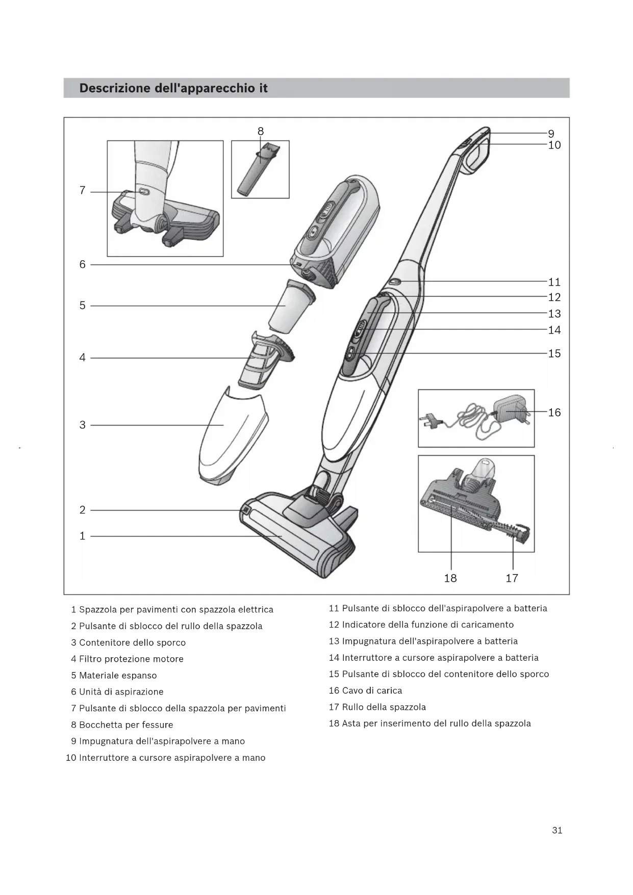 fr31 Descrizione dell'apparecchio it 1 Spazzola per pavimenti con spazzola elettrica 2 Pulsante di sblocco del rullo della spazzola 3 Contenitore dello sporco 4 Filtro protezione motore 5 Materiale espanso 6 Unità di aspirazione 7 Pulsante di sblocco della spazzola per pavimenti 8 Bocchetta per fessure 9 Impugnatura dell'aspirapolvere a mano 10 Interruttore a cursore aspirapolvere a mano 11 Pulsante di sblocco dell'aspirapolvere a batteria 12 Indicatore della funzione di caricamento 13 Impugnatura dell'aspirapolvere a batteria 14 Interruttore a cursore aspirapolvere a batteria 15 Pulsante di sblocco del contenitore dello sporco 16 Cavo di carica 17 Rullo della spazzola 18 Asta per inserimento del rullo della spazzola