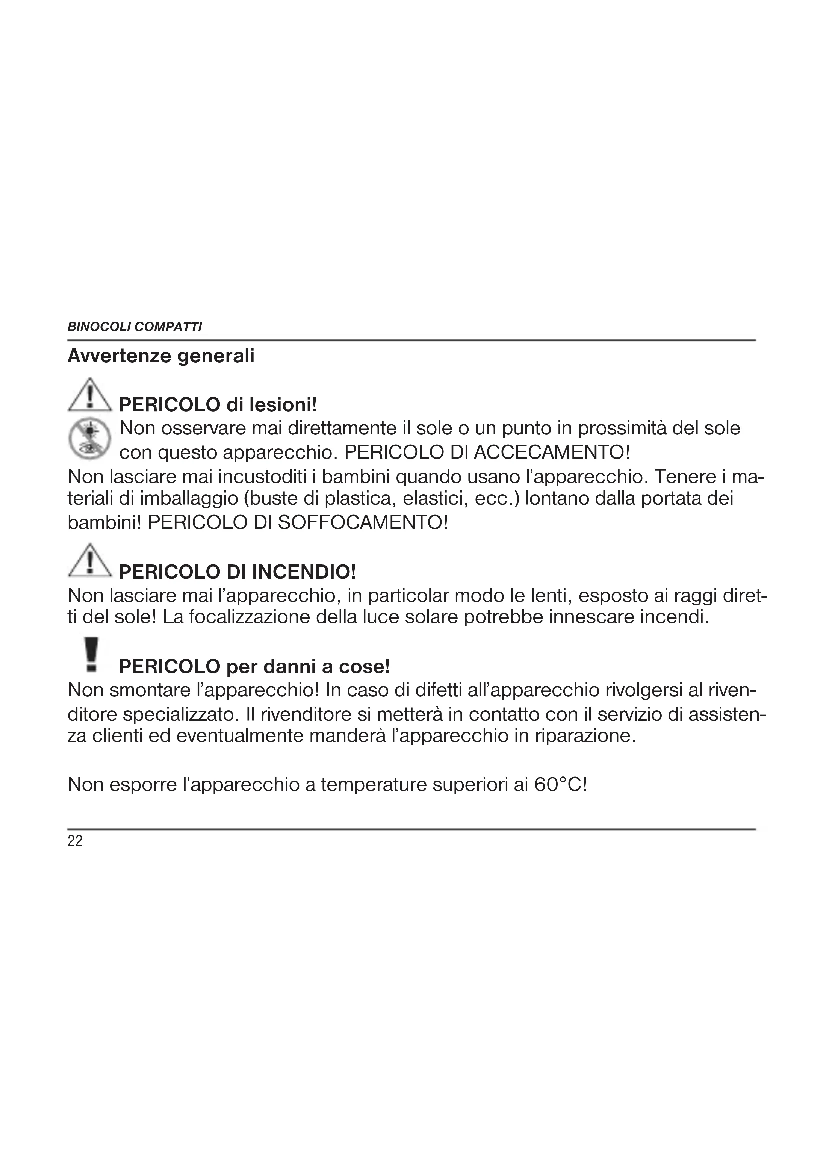 Elenco delle parti componenti B Asse centrale del binocolo Ca Conchiglie oculari twist up oppure Cb Conchiglie oculari in gomma D Regolazione delle diottrie E Corpo del binocolo F Tubo dell’obbiettivo G Vite (messa a fuoco) H Oculare I Lente obbiettivo j Cerchio di immagine con distan- za interpupillare correttamente regolata Oculare per portatori di occhiali A seconda del modello, il binocolo è dotato di conchiglie oculari twist up (2a) o conchiglie oculari in gomma (2b). Poiché nel caso dei portatori di occhiali, in linea di principio, la distanza tra l’oculare del binocolo e la pupilla è maggiore, entrambi i tipi di conchiglie oculari possono essere regolati in base alle esigenze individuali. Conchiglie oculari twist up (2a) Se si utilizza il binocolo con indosso gli occhiali, avvitare le conchiglie oculari twist up (2a). Se invece non si indossano gli occhiali, svitare le conchiglie oculari per ottenere la distanza interpupillare necessaria. OPPURE24 Conchiglie oculari in gomma (2b) Se si utilizza il binocolo con indosso gli occhiali, ribaltare le conchiglie oculari in gomma (2b) lateralmente verso il basso. Se invece non si indossano gli oc- chiali, lasciare le conchiglie oculari in posizione diritta per ottenere la distanza interpupillare necessaria. Regolazione della distanza interoculare La distanza tra gli occhi varia da persona a persona. Per raggiungere un perfetto allineamento tra gli occhi e l’oculare del binocolo agire sui cannocchiali incli- nandoli rispetto all’asse centrale (1) finché, guardandovi dentro, non si vedrà un unico campo circolare (9). RicordateVi della regolazione impostata per ogni uso successivo del binocolo. Regolazione della messa a fuoco Guardate attraverso il binocolo e chiudete l’occhio destro. Mettete ora a fuoco l’immagine per l’occhio sinistro agendo sul sistema di messa a fuoco centrale (6). Chiudete l’occhio sinistro e mettete a fuoco l’immagine per l’occhio destro agendo sulla ghiera di regolazione diottrica (3). BINOCOLI COMPATTI25 AVVERTENZA per la pulizia Pulire le lenti (oculare e obiettivo) solo con un panno morbido che non lasci peli (per es. in microfibra). Non premere con il panno sulle lenti per evitare che si graffino. Per rimuovere i residui di sporco più ostinati inumidire il panno con un liquido detergente per occhiali e pulire le lenti esercitando solo una lieve pressione. Proteggere l’apparecchio da polvere e umidità! Dopo l’utilizzo, in particolare in condizioni di elevata umidità atmosferica, lasciare l’apparecchio a temperatura ambiente per alcuni minuti in modo tale che l’umidità residua venga completa- mente eliminata. Inserire i coperchi di protezione antipolvere sulle lenti e conser- vare l’apparecchio nell’apposita custodia in dotazione. IT26 ¡Advertencias generales de seguridad! ¡PELIGRO de lesiones corporales! No mire nunca con este aparato directamente hacia el sol o hacia sus inmediaciones. ¡Existe PELIGRO DE CEGUERA! Los niños sólo deben utilizar el aparato bajo la supervisión de un adulto. ¡Man- tener fuera del alcance de los niños los materiales de embalaje (bolsas de plás- tico, cintas de goma, etc.)! ¡Existe PELIGRO DE ASFIXIA! ¡PELIGRO DE INCENDIO! ¡No exponga el aparato (especialmente las lentes) a la radiación directa del sol! La concentración de luz podría provocar incendios. ¡PELIGRO de daños materiales! ¡No desmonte el aparato! En caso de que perciba un defecto, diríjase a su tienda especializada. En ella se pondrán en contacto con el centro de servicio técnico y, si procede, enviarán el aparato para que sea reparado. ¡No exponga el aparato a temperaturas superiores a 60° C! PRISMáTICOS COMPACTOS27