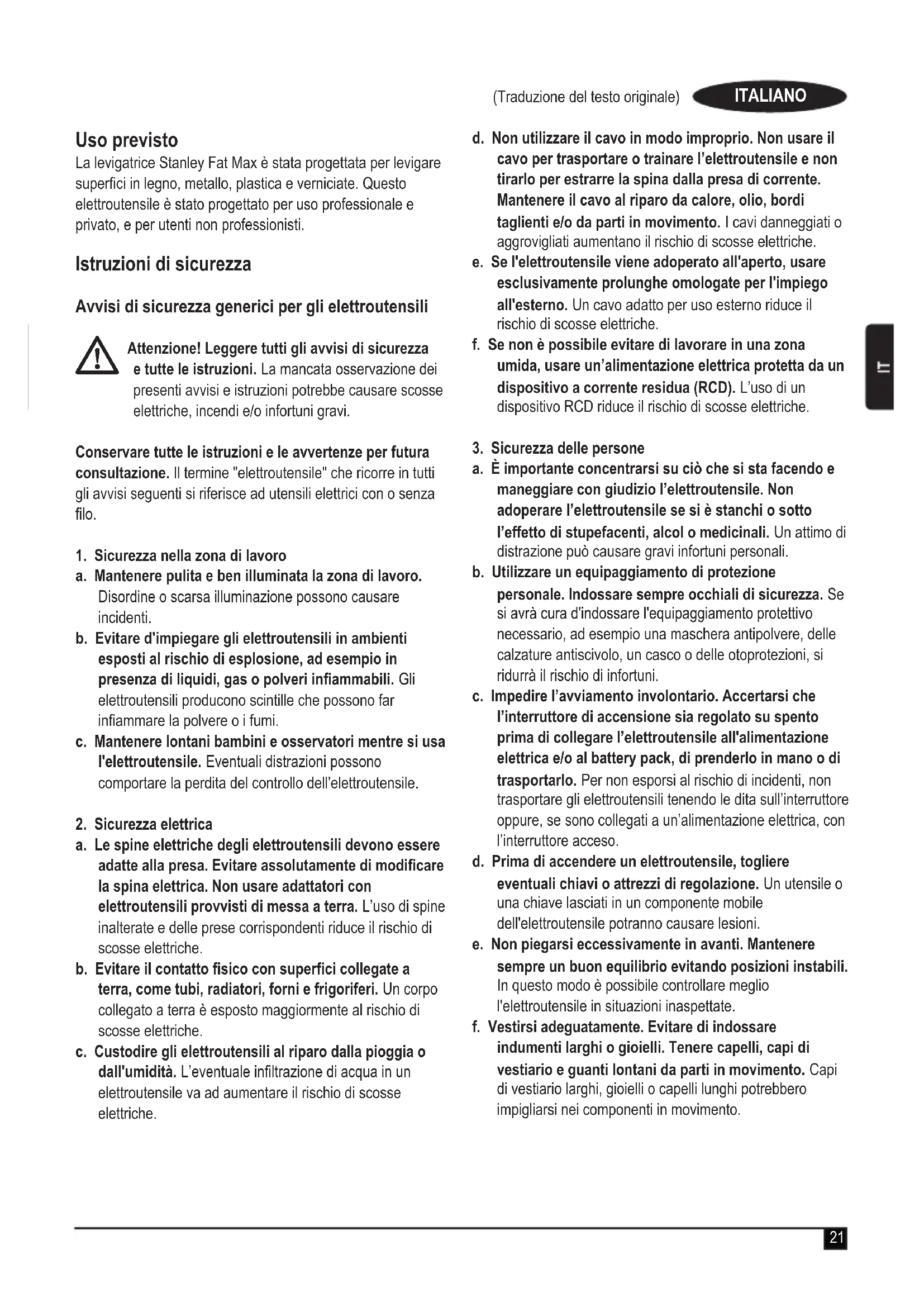Montaggio Attenzione! Prima di montare l'elettroutensile, assicurarsi che sia spento e scollegato dalla presa di corrente. Montaggio del disco di levigatura (g. A) u Appoggiare l’elettroutensile su di un tavolo, con il man- drino rivolto verso l’alto. u Posizionare il disco di levigatura (5) sul mandrino. u Fissare il disco di levigatura con le viti (6). Montaggio dei fogli abrasivi (g. B) Attenzione! Non utilizzare mai l'elettroutensile senza aver prima montato un foglio abrasivo o un accessorio. u Premere saldamente e in modo uniforme il foglio abrasivo sul disco di levigatura (5), vericando che i fori presenti sul foglio siano allineati a quelli della base.24 (Traduzione del testo originale) ITALIANO Montaggio e rimozione del sacchetto di raccolta della polvere (g. C) u Applicare il sacchetto di raccolta polvere (7) sull’apertura d’estrazione della polvere (4). u Per rimuovere il sacchetto di raccolta della polvere, stac- carlo dall’apertura di estrazione. Collegamento a un aspirapolvere (g. D) u Inserire il tubo dell'aspirapolvere (8) inlandolo nell'apertura di estrazione della polvere (4). Utilizzo Attenzione! Lasciare che l'elettroutensile funzioni al suo ritmo. Non sovraccaricarlo. Comando velocità variabile Il comando della velocità variabile consente di adattare la velocità dell’elettroutensile al materiale del pezzo. u Impostare il pomello di regolazione (3) sul valore richiesto. Usare una velocità alta per il legno, media per le impial- lacciature e i materiali sintetici e bassa per il plexiglas, i metalli non ferrosi e per eliminare la vernice. Accensione e spegnimento u Per accendere l’elettroutensile, premere l’interruttore di accensione (1). u Per il funzionamento continuo, premere il pulsante di bloc- caggio (2) e rilasciare l’interruttore di accensione. u Per spegnere l’elettroutensile, rilasciare l’interruttore di accensione. Per spegnere l’elettroutensile durante il funzionamento continuo, premere di nuovo l’interruttore di accensione e rilasciarlo. Sistema frenante automatico Questa caratteristica consente di limitare la velocità del disco quando l'elettroutensile non è a contatto della supercie di lavoro. Non appena l'elettroutensile è appoggiato sul pezzo, il disco raggiungerà la normale velocità d'esercizio. Svuotare il sacchetto di raccolta polvere Il sacchetto di raccolta della polvere deve essere svuotato ogni 10 minuti. u Scuotere il sacchetto di raccolta della polvere per svuo- tarlo dal contenuto Suggerimenti per un ottimo utilizzo (g. E) u Non esercitare una pressione eccessiva sull'elettroutensile. u Vericare regolarmente lo stato del foglio abrasivo. Sosti- tuirlo quando necessario. u Levigare sempre usando una grana analoga a quella del legno. u Quando si levigano strati di vernice nuova, adoperare carta a grana ne prima di applicare lo strato successivo di vernice. u Su superci rugose, o quando si rimuovono degli strati di vernice, iniziare a levigare con carta abrasiva a grana grossa. Su superci di altro tipo, cominciare con una grana media. In entrambi i casi, per ottenere una rinitura omogenea passare gradualmente a una grana sottile. u Consultare il rivenditore per ulteriori informazioni sugli accessori disponibili. Accessori Le prestazioni dell'elettroutensile dipendono dall'accessorio usato. Gli accessori Stanley Fat Max sono stati fabbricati in base a standard qualitativi elevati e sono stati progettati per ottenere le migliori prestazioni dall’elettroutensile. Usando questi accessori si otterrà il meglio dall'elettroutensile. Manutenzione Questo elettroutensile è stato progettato per funzionare a lungo con una manutenzione minima. Per ottenere prestazioni sempre soddisfacenti occorre avere cura dell'elettroutensile e sottoporlo a pulizia periodica. Avvertenza! Prima di eseguire operazioni di manutenzione, spegnere l'elettroutensile ed estrarre la spina dalla presa di corrente. u Le prese di ventilazione dell'elettroutensile devono essere pulite regolarmente con un pennello morbido o un panno asciutto. u Il vano del motore deve essere pulito regolarmente con un panno umido. Non usare materiali abrasivi o detergenti a base di solventi. Sostituzione della spina (solo Regno Unito e Irlanda) Se è necessario montare una nuova spina: u smaltire in tutta sicurezza quella vecchia. u Collegare il lo marrone al morsetto sotto tensione della nuova spina. u Collegare il lo blu al morsetto neutro. Attenzione! Non effettuare nessun collegamento sul morsetto di terra. Seguire le istruzioni fornite con le spine di buona qualità. Fusibile raccomandato: 5 A. Protezione dell’ambiente