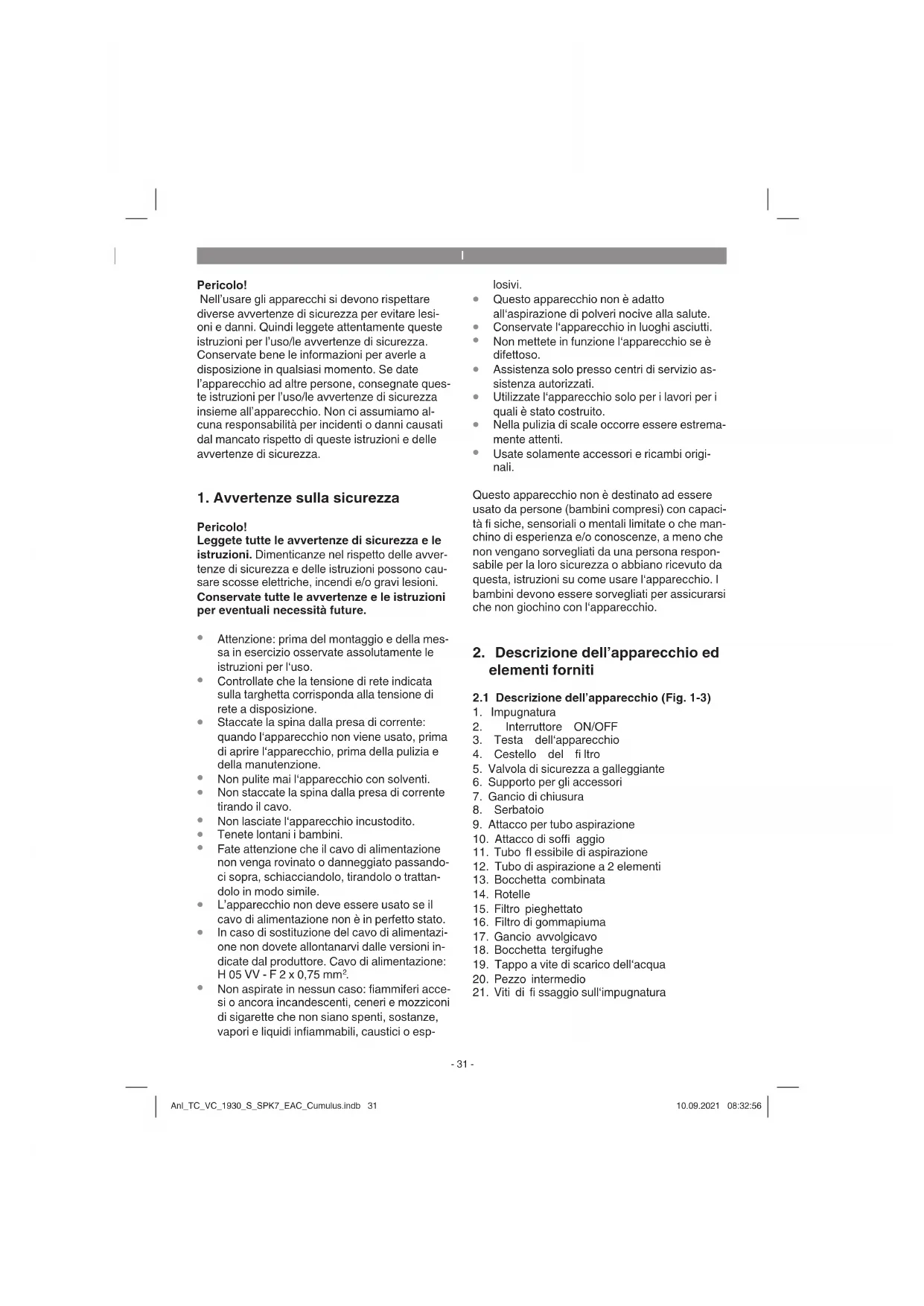 Solo per paesi membri dell’UE Non smaltite gli elettroutensili nei rifi uti domestici! Secondo la direttiva europea 2012/19/CE sui rifi uti di apparecchiature elettriche ed elettroniche e il suo recepimento nelle normative nazionali, gli elettroutensili usati devono venire raccolti separatamente e venire smaltiti in modo ecocompatibile. Alternativa di riciclaggio alla richiesta di restituzione: il proprietario dell’apparecchio elettrico è tenuto in alternativa, invece della restituzione, a collaborare in modo che lo smaltimento venga eseguito correttamente in caso ceda l’apparecchio. L’apparecchio vec- chio può anche venire consegnato ad un centro di raccolta che provvede poi allo smaltimento secondo le norme nazionali sul riciclaggio e sui rifi uti. Non ne sono interessati gli accessori e i mezzi ausiliari sen- za elementi elettrici forniti insieme ai vecchi apparecchi. La ristampa o l’ulteriore riproduzione, anche parziale, della documentazione o dei documenti d’accompagnamento dei prodotti è consentita solo con l’esplicita autorizzazione da parte della iSC GmbH. Con riserva di apportare modifi che tecniche Anl_TC_VC_1930_S_SPK7_EAC_Cumulus.indb 35Anl_TC_VC_1930_S_SPK7_EAC_Cumulus.indb 35 10.09.2021 08:32:5610.09.2021 08:32:56I