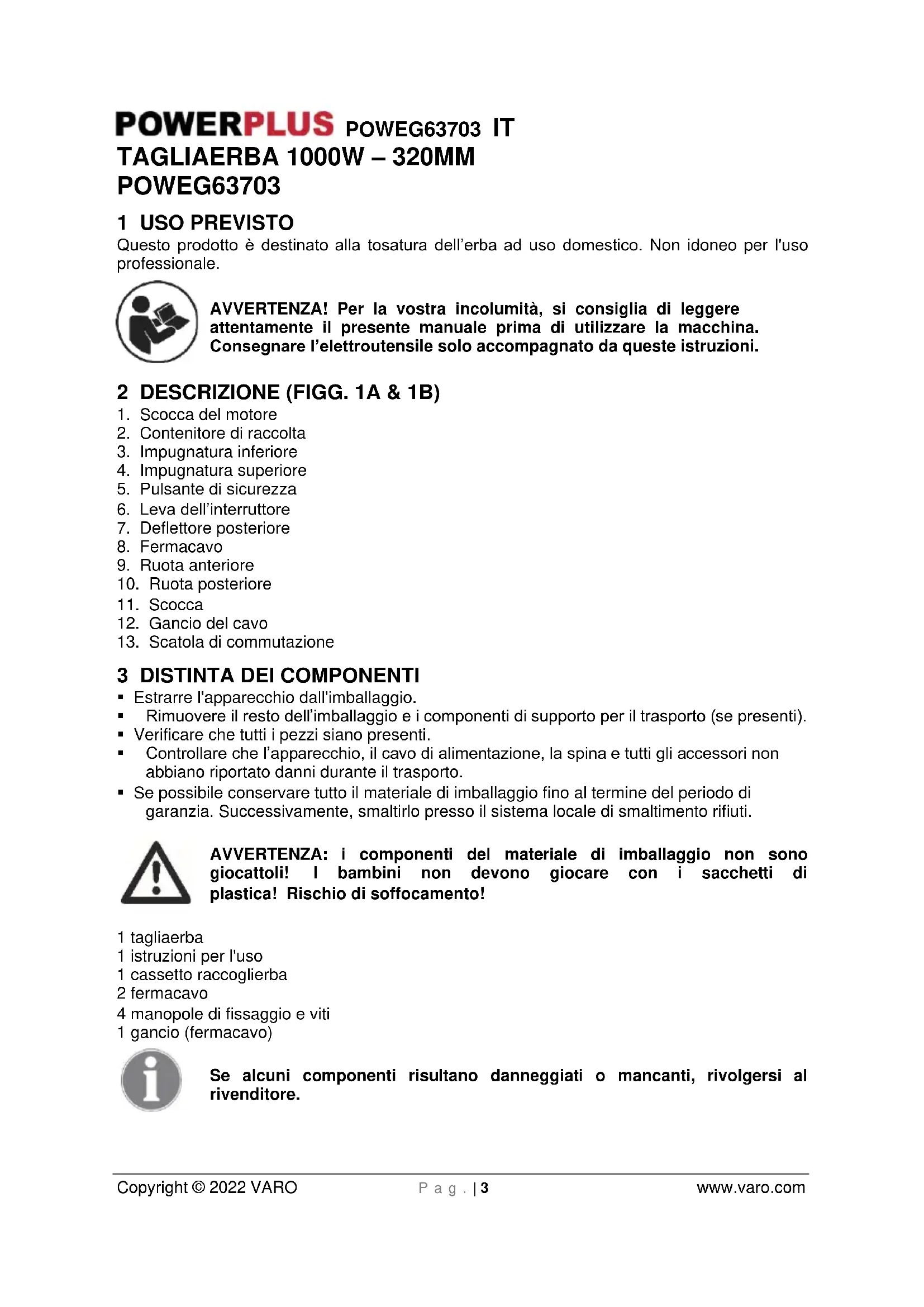 POWEG63703 1 USO PREVISTO Questo prodotto è destinato alla tosatura dell’erba ad uso domestico. Non idoneo per l'uso professionale. AVVERTENZA! Per la vostra incolumità, si consiglia di leggere attentamente il presente manuale prima di utilizzare la macchina. Consegnare l’elettroutensile solo accompagnato da queste istruzioni. 2 DESCRIZIONE (FIGG. 1A & 1B)