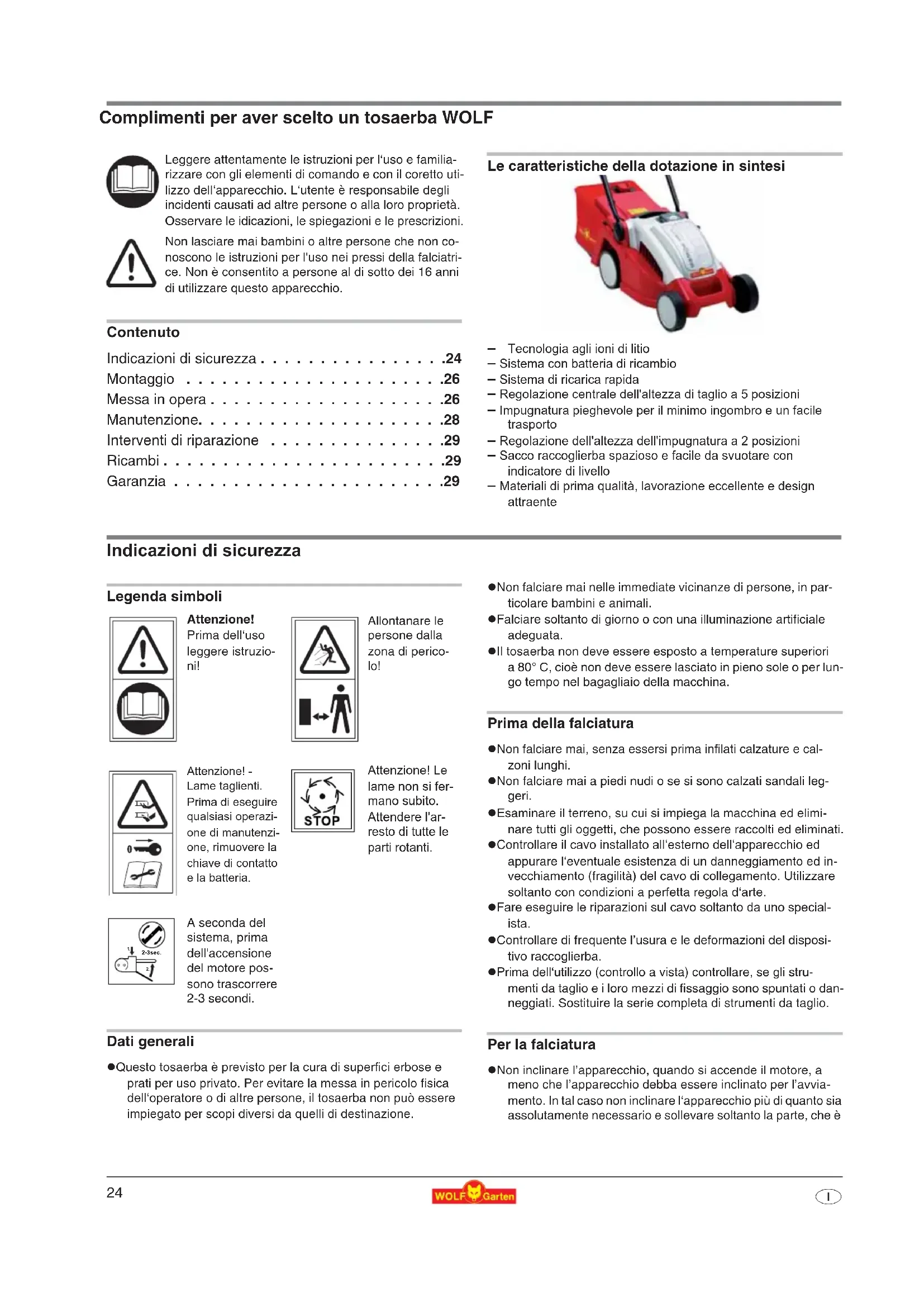 distante dall‘operatore. Verificare sempre che le due mani si trovino in posizione di lavoro, prima di ricollocare l‘apparec- chio sul terreno. z Mantenere la distanza di sicurezza imposta dalla tiranteria. z Accendere il motore solo quando i piedi si trovano a distanza sicura dagli utensili di taglio z Controllare che l'appoggio sia sicuro. Non correre. Procedere con calma. z Taglio dell'erba su pendii: – Tagliare l'erba trasversalmente rispetto al pendio, mai in sa- lita o in discesa. – Prestare un'attenzione particolare nel cambiare direzione. – Non tagliare l'erba su pendii ripidi. z Usare particolare cautela nel procedere all'indietro tirando il tosaerba verso di sé. z Attenzione, non toccare le lame in funzionamento. z Non sostare davanti all'apertura di espulsione dell'erba. z Non aprire mai il coperchio di protezione se il motore è ancora in funzionamento. z Non procedere sulla ghiaia se il motore è in funzionamento – sussiste il rischio di essere colpiti da pietre. z Se possibile, non tagliare erba bagnata. z Nelle seguenti circostanze, è necessario spegnere l'apparecchio, estrarre la chiave di contatto e attendere l'arresto: – quando il tosaerba viene lasciato incustodito – per liberare una lama bloccata – per regolare l'altezza di taglio – per svuotare il sacco raccoglierba – in caso d'impatto con un corpo estraneo (accertarsi innanzitutto di eventuali danni al tosaerba o agli utensili da taglio. Quindi, per prima cosa, riparare il danno) – se il tosaerba vibra molto a causa dello squilibrio (spegnere subito e cercare la causa) – se il cavo di collegamento ha subito danni durante l'uso – per sollevare o spostare il tosaerba – per ribaltare o trasportare il tosaerba (p. es dal prato/verso il prato o su strada) La manutenzione 1 Attenzione! Lama rotante Prima di effettuare qualsiasi manutenzione e pulizia: z Rimuovere la chiave di contatto e la batteria. z Non toccate lame in movimento. z Controllare regolarmente che tutte le viti di fissaggio ed i dadi visibili siano ben serrati, specialmente nella barra portalama; serrarli se necessario. z Non riporre il tosaerba in ambienti umidi. z Per motivi di sicurezza, sostituire le parti usurate o danneg- giate. z Utilizzare solo ricambi originali WOLF; in caso contrario non è possibile garantire che il tosaerba sia conforme alle disposizi- oni in materia di sicurezza. Caricabatterie z Questo carica batterie deve essere usato solo per i tosaerba WOLF modello LI-ION POWER 34. z Non riporre o usare il caricabatterie in luoghi umidl o bagnati ma solo in ambienti asciutti. z Scollegare il caricabatterie dalla relativa presa afferrando lo spinotto ed evitando di tirare il cavo poichè si potrebbero cau- sare dei danni alle con nessioni interne che renderebbero in- servibile il caricabatterie stesso. z Non utilizzare mai il caricabatterie se il cavo, la spina o qual- che altro componente del tosaerba siano guasti. Ogni ripara- zione dovrà essere effet-tuata esclusivamente da personale qualifi cato. z Assicurarsi che il raffreddamento del caricaricabatterie sia sempre garantito tenendo pulita e libera la griglia di raffredda- mento. Non utilizzare il caricabatterie nelle vicinanze di sor- genti di ca lore. z Non tentare di smontare il caricabatterie o di aprire. z Utilizzare solo ricambi originali WOLF; in caso contrario non è possibile garantire che il tosaerba sia conforme alle disposizi- oni in materia di sicurezza. Batterie z In caso di errata applicazione, il liquido più fuoriuscire dalla batteria. Evitare il contatto. In caso di contatto accidentale, sciacquare con acqua. Se il liquido entra in contatto con gli oc- chi, si prega contattare immediatamente un medico per le cure del caso. Il liquido fuoriuscito dalla batteira più provocare irritazione della pelle o ustioni. z Se il pacco batteria è danneggiato e se viene utilizzato in modo improprio potrebbe verificarsi una fuoriuscita di vapori. In tal caso, cambiare l‘aria e consultare un medico in caso di disturbi. I vapori potrebbero irritare le vie respiratorie. 1 Pericolo di incendio! z Non caricare mai le batterie vicino ad acidi e materiali facilmente infiammabili. z Caricare la batteria solo a temperature ambiente comprese tra 0 e + 40 °C. In caso di forte sollecitazione, far raffreddare le batterie. 1 Pericolo di esplosione! Proteggere la batteria dal surriscaldamento e dal fuoco. z Non deporle su radiatori ed evitare un'esposizione prolungata ai raggi solari. z Utilizzare l'apparecchio solo a temperature ambiente comprese tra 0 °C e + 40 °C. 1 Pericolo di corto circuito z Per lo smaltimento, il trasporto o lo stoccaggio è neces- sario imballare la batteria (sacchetto di plastica o scato- la) o coprire i contatti con nastro adesivo. z Il pacco batteria non deve essere aperto. Smaltire le batteria in modo ecologico z Gli accumulatori WOLF sono accumulatori al Li-ION e quindi soggetti a smaltimento. Gli ac- cumulatori difettosi devono essere smaltiti da ditte specializzate. Gli accumulatori devono essere rimossi dall’apparecchio, prima di es- sere rottamati. z Gli accumulatori WOLF sono per lo più adatti secondo l’attuale stato della tecnica all’ali- mentazione di energia di apparecchi elettrici indipendenti dalla rete della corrente. Le celle al Li-ION sono dannose per l’ambiente, se vengono smaltite insieme agli altri rifiuti urba- ni. z Il WOLF-Garten potrebbe richiedere un com- portamento ecologico da parte degli utenti. In collaborazione con Voi e i concessionari della WOLF garantiamo la restituzione e il riciclag- gio delle batterie consumate.26