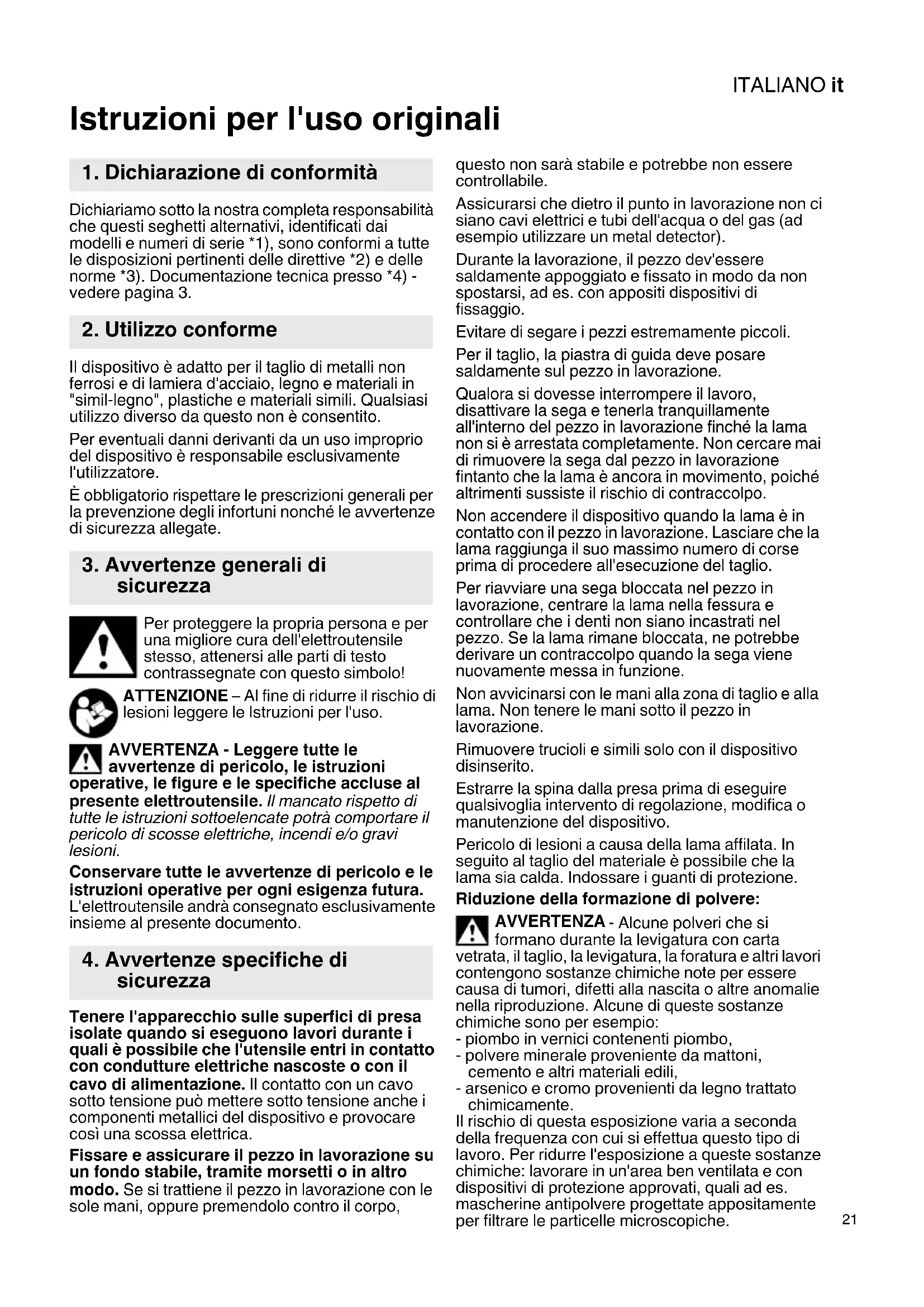 Istruzioni per l'uso originali Dichiariamo sotto la nostra completa responsabilità che questi seghetti alternativi, identificati dai modelli e numeri di serie *1), sono conformi a tutte le disposizioni pertinenti delle direttive *2) e delle norme *3). Documentazione tecnica presso *4) - vedere pagina 3. Il dispositivo è adatto per il taglio di metalli non ferrosi e di lamiera d'acciaio, legno e materiali in "simil-legno", plastiche e materiali simili. Qualsiasi utilizzo diverso da questo non è consentito. Per eventuali danni derivanti da un uso improprio del dispositivo è responsabile esclusivamente l'utilizzatore. È obbligatorio rispettare le prescrizioni generali per la prevenzione degli infortuni nonché le avvertenze di sicurezza allegate. Per proteggere la propria persona e per una migliore cura dell'elettroutensile stesso, attenersi alle parti di testo contrassegnate con questo simbolo! ATTENZIONE – Al fine di ridurre il rischio di lesioni leggere le Istruzioni per l'uso. AVVERTENZA - Leggere tutte le avvertenze di pericolo, le istruzioni operative, le figure e le specifiche accluse al presente elettroutensile. Il mancato rispetto di tutte le istruzioni sottoelencate potrà comportare il pericolo di scosse elettriche, incendi e/o gravi lesioni. Conservare tutte le avvertenze di pericolo e le istruzioni operative per ogni esigenza futura. L'elettroutensile andrà consegnato esclusivamente insieme al presente documento. Tenere l'apparecchio sulle superfici di presa isolate quando si eseguono lavori durante i quali è possibile che l'utensile entri in contatto con condutture elettriche nascoste o con il cavo di alimentazione. Il contatto con un cavo sotto tensione può mettere sotto tensione anche i componenti metallici del dispositivo e provocare così una scossa elettrica. Fissare e assicurare il pezzo in lavorazione su un fondo stabile, tramite morsetti o in altro modo. Se si trattiene il pezzo in lavorazione con le sole mani, oppure premendolo contro il corpo, questo non sarà stabile e potrebbe non essere controllabile. Assicurarsi che dietro il punto in lavorazione non ci siano cavi elettrici e tubi dell'acqua o del gas (ad esempio utilizzare un metal detector). Durante la lavorazione, il pezzo dev'essere saldamente appoggiato e fissato in modo da non spostarsi, ad es. con appositi dispositivi di fissaggio. Evitare di segare i pezzi estremamente piccoli. Per il taglio, la piastra di guida deve posare saldamente sul pezzo in lavorazione. Qualora si dovesse interrompere il lavoro, disattivare la sega e tenerla tranquillamente all'interno del pezzo in lavorazione finché la lama non si è arrestata completamente. Non cercare mai di rimuovere la sega dal pezzo in lavorazione fintanto che la lama è ancora in movimento, poiché altrimenti sussiste il rischio di contraccolpo. Non accendere il dispositivo quando la lama è in contatto con il pezzo in lavorazione. Lasciare che la lama raggiunga il suo massimo numero di corse prima di procedere all'esecuzione del taglio. Per riavviare una sega bloccata nel pezzo in lavorazione, centrare la lama nella fessura e controllare che i denti non siano incastrati nel pezzo. Se la lama rimane bloccata, ne potrebbe derivare un contraccolpo quando la sega viene nuovamente messa in funzione. Non avvicinarsi con le mani alla zona di taglio e alla lama. Non tenere le mani sotto il pezzo in lavorazione. Rimuovere trucioli e simili solo con il dispositivo disinserito. Estrarre la spina dalla presa prima di eseguire qualsivoglia intervento di regolazione, modifica o manutenzione del dispositivo. Pericolo di lesioni a causa della lama affilata. In seguito al taglio del materiale è possibile che la lama sia calda. Indossare i guanti di protezione. Riduzione della formazione di polvere: AVVERTENZA - Alcune polveri che si formano durante la levigatura con carta vetrata, il taglio, la levigatura, la foratura e altri lavori contengono sostanze chimiche note per essere causa di tumori, difetti alla nascita o altre anomalie nella riproduzione. Alcune di queste sostanze chimiche sono per esempio: - piombo in vernici contenenti piombo, - polvere minerale proveniente da mattoni, cemento e altri materiali edili, - arsenico e cromo provenienti da legno trattato chimicamente. Il rischio di questa esposizione varia a seconda della frequenza con cui si effettua questo tipo di lavoro. Per ridurre l'esposizione a queste sostanze chimiche: lavorare in un'area ben ventilata e con dispositivi di protezione approvati, quali ad es. mascherine antipolvere progettate appositamente per filtrare le particelle microscopiche.