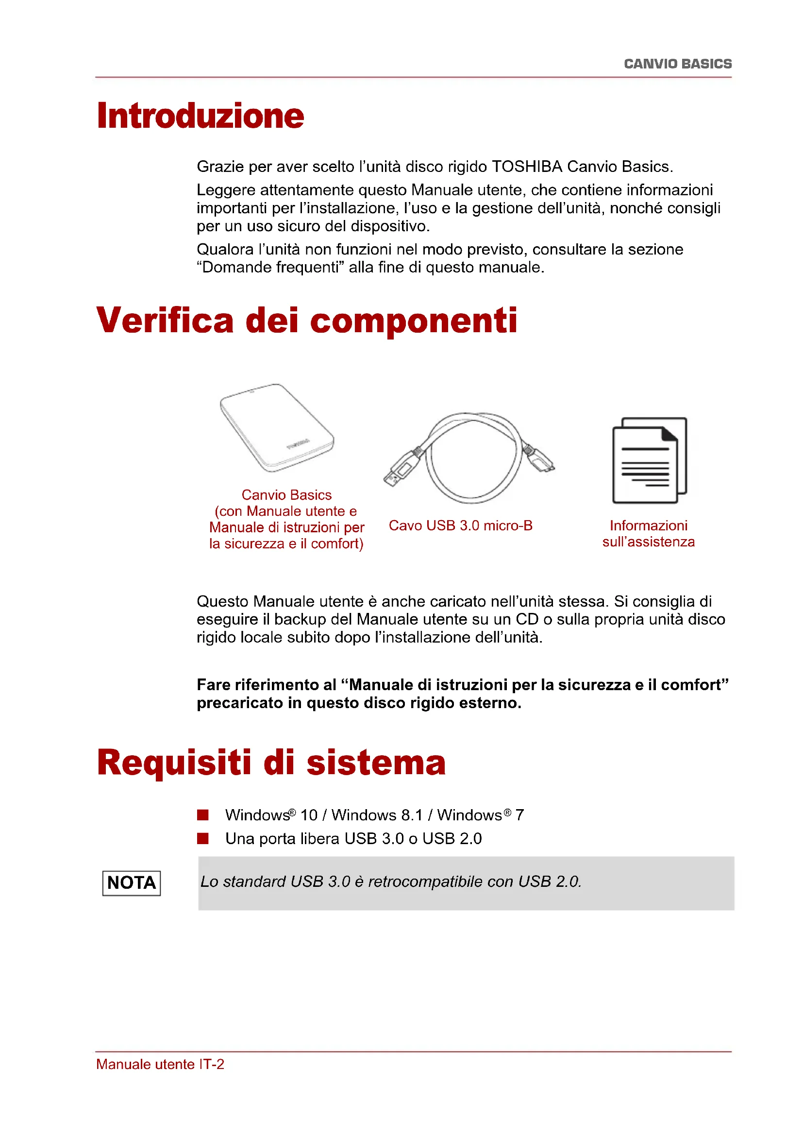 è inferiore a quella delle specifiche? R: La differenza si spiega con il differente metodo di calcolo della capacità. I produttori di dischi rigidi calcolano la capacità utilizzando il sistema decimale, mentre il sistema operativo usa il sistema binario. Esempio decimale: 1 TB = 1.000 GB 1 GB = 1.000 MB = 1.000.000 KB = 1.000.000.000 byte Esempio binario: 1 GB = 1.024 MB = 1.048.576 KB = 1.073.741.824 byte Di conseguenza, un disco rigido da 1 TB (valore decimale) viene indicato in Windows con una capacità di soli 931 GB (valore binario). D: È possibile utilizzare l’unità per copiare un sistema operativo da un computer a un altro? R: No, occorre seguire le istruzioni di installazione specifiche del sistema operativo. Una semplice operazione di copiatura non può funzionare. D: Toshiba offre servizi di recupero dati? R: Sì, Toshiba offre un Servizio di recupero dati per le unità disco rigido esterne. Per maggiori informazioni, visitare il sito web www.toshiba-europe.com/services.Manuale utente IT-6 CANVIO BASICS Risoluzione dei problemi Il computer non riconosce l’unità disco. ■ Verificare tutte le connessioni. ■ Se l’unità è collegata tramite un hub USB, assicurarsi che questo disponga di un proprio alimentatore. ■ Se si usa una scheda add-on, verificare che funzioni correttamente e aggiornarne il software/firmware. È pericoloso che l’unità si scaldi durante il funzionamento? R: È del tutto normale e non presenta alcun rischio. L’unità riporta l’errore “Device cannot start” (Impossibile avviare il dispositivo). R: Vi sono due motivi possibili. Può trattarsi di un problema di alimentazione, nel qual caso occorre controllare i collegamenti, oppure di un malfunzionamento che richiede un intervento di assistenza. L’unità non è visualizzata in “Risorse del computer”, ma appare correttamente in Gestione dispositivi. R: Seguire queste istruzioni: