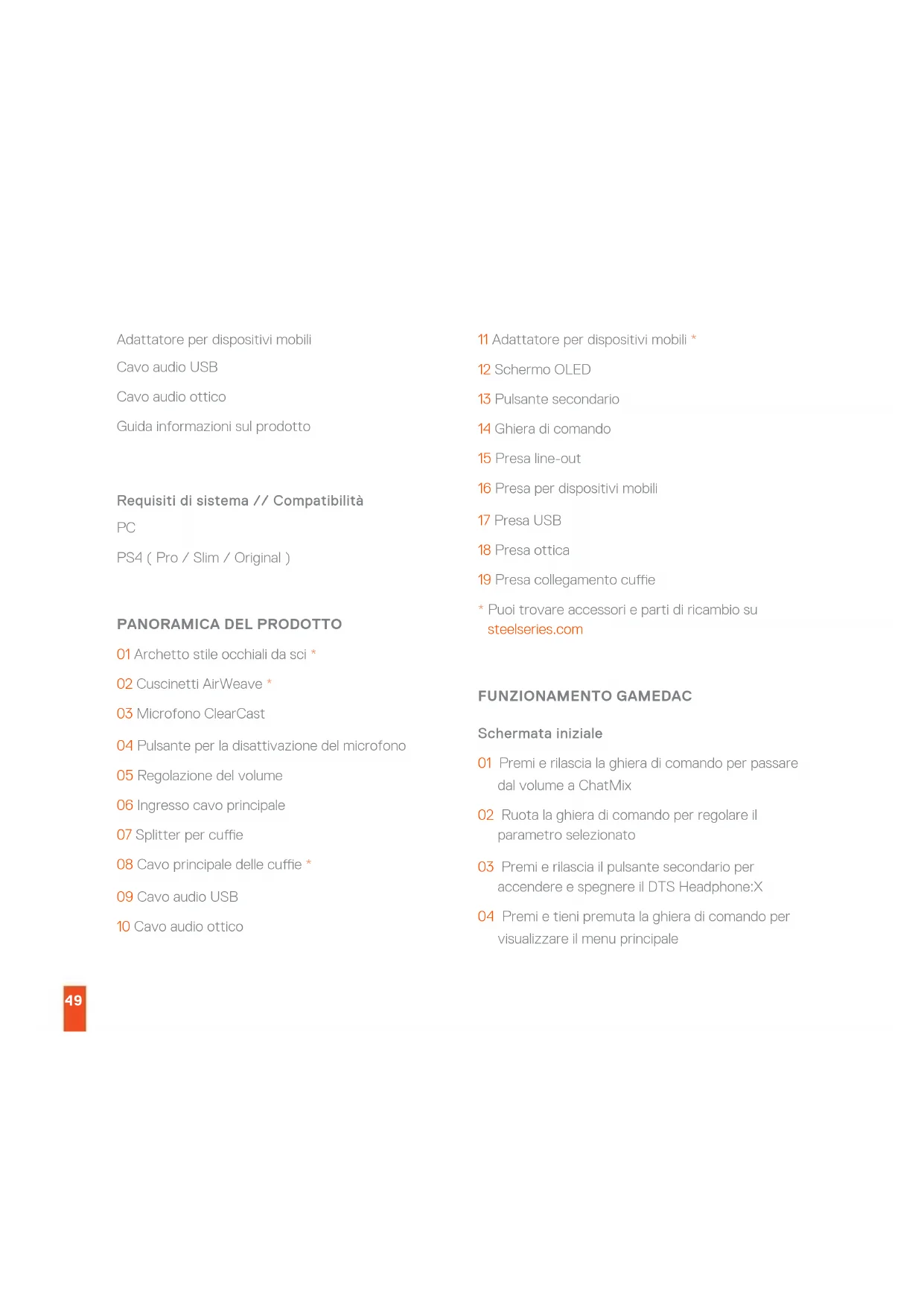 - Puoi trovare accessori e parti di ricambio su steelseries.com FUNZIONAMENTO GAMEDAC Schermata iniziale 01 Premi e rilascia la ghiera di comando per passare dal volume a ChatMix 02 Ruota la ghiera di comando per regolare il parametro selezionato 03 Premi e rilascia il pulsante secondario per accendere e spegnere il DTS Headphone:X 04 Premi e tieni premuta la ghiera di comando per visualizzare il menu principale50 Menu principale 01 Ruota la ghiera di comando per passare in rassegna le voci del menu 02 Premi e rilascia la ghiera di comando per selezionare 03 Premi e rilascia il pulsante secondario per tornare al menu
