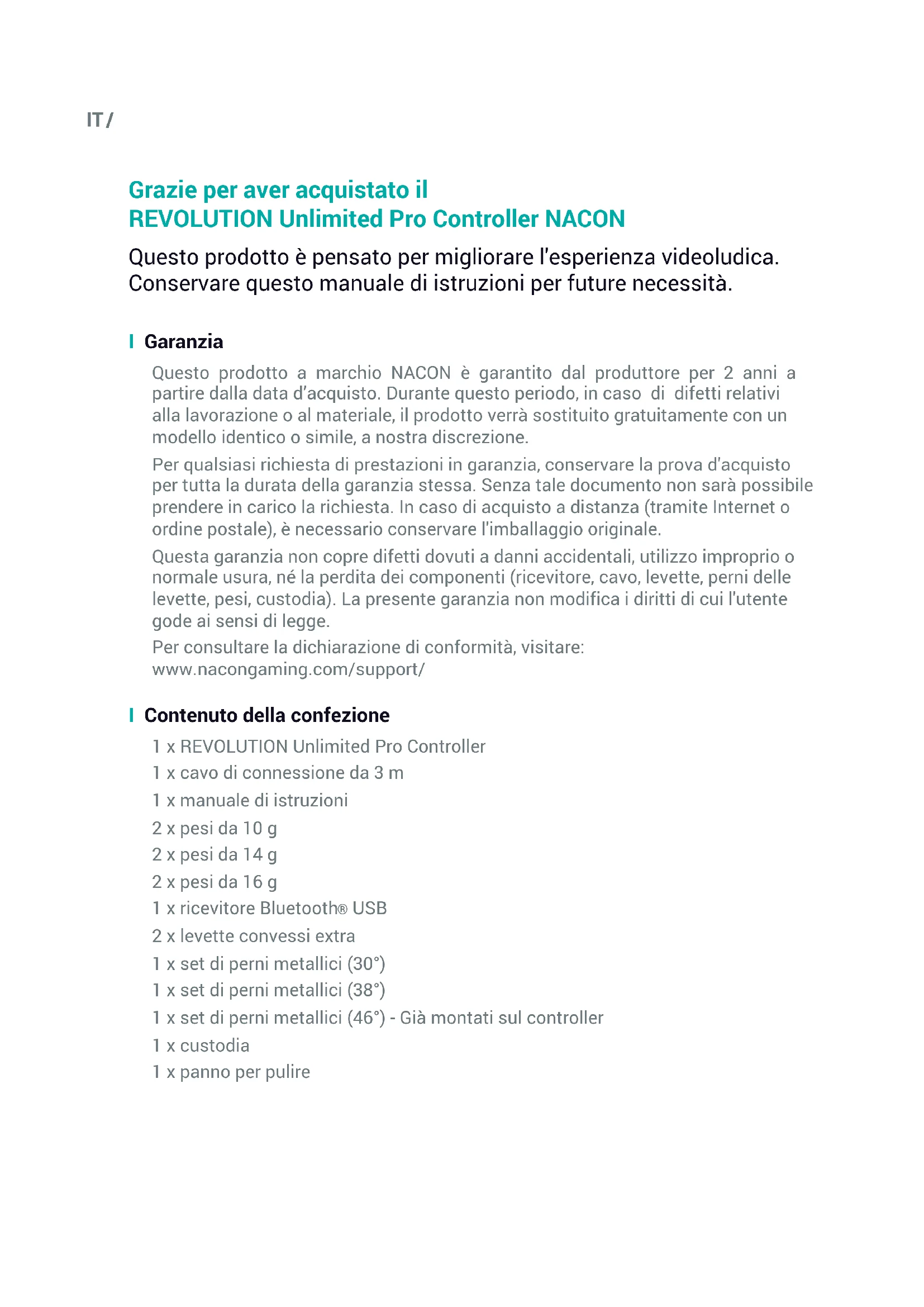 Grazie per aver acquistato il REVOLUTION Unlimited Pro Controller NACON Questo prodotto è pensato per migliorare l'esperienza videoludica. Conservare questo manuale di istruzioni per future necessità. I Garanzia Questo prodotto a marchio NACON è garantito dal produttore per 2 anni a partire dalla data d’acquisto. Durante questo periodo, in caso di difetti relativi alla lavorazione o al materiale, il prodotto verrà sostituito gratuitamente con un modello identico o simile, a nostra discrezione. Per qualsiasi richiesta di prestazioni in garanzia, conservare la prova d'acquisto per tutta la durata della garanzia stessa. Senza tale documento non sarà possibile prendere in carico la richiesta. In caso di acquisto a distanza (tramite Internet o ordine postale), è necessario conservare l'imballaggio originale. Questa garanzia non copre difetti dovuti a danni accidentali, utilizzo improprio o normale usura, né la perdita dei componenti (ricevitore, cavo, levette, perni delle levette, pesi, custodia). La presente garanzia non modifica i diritti di cui l'utente gode ai sensi di legge. Per consultare la dichiarazione di conformità, visitare: www.nacongaming.com/support/ I Contenuto della confezione 1 x REVOLUTION Unlimited Pro Controller 1 x cavo di connessione da 3 m 1 x manuale di istruzioni 2 x pesi da 10 g 2 x pesi da 14 g 2 x pesi da 16 g 1 x ricevitore Bluetooth ® USB 2 x levette convessi extra 1 x set di perni metallici (30°) 1 x set di perni metallici (38°) 1 x set di perni metallici (46°) - Già montati sul controller 1 x custodia 1 x panno per pulireIT / I Descrizione dei componenti