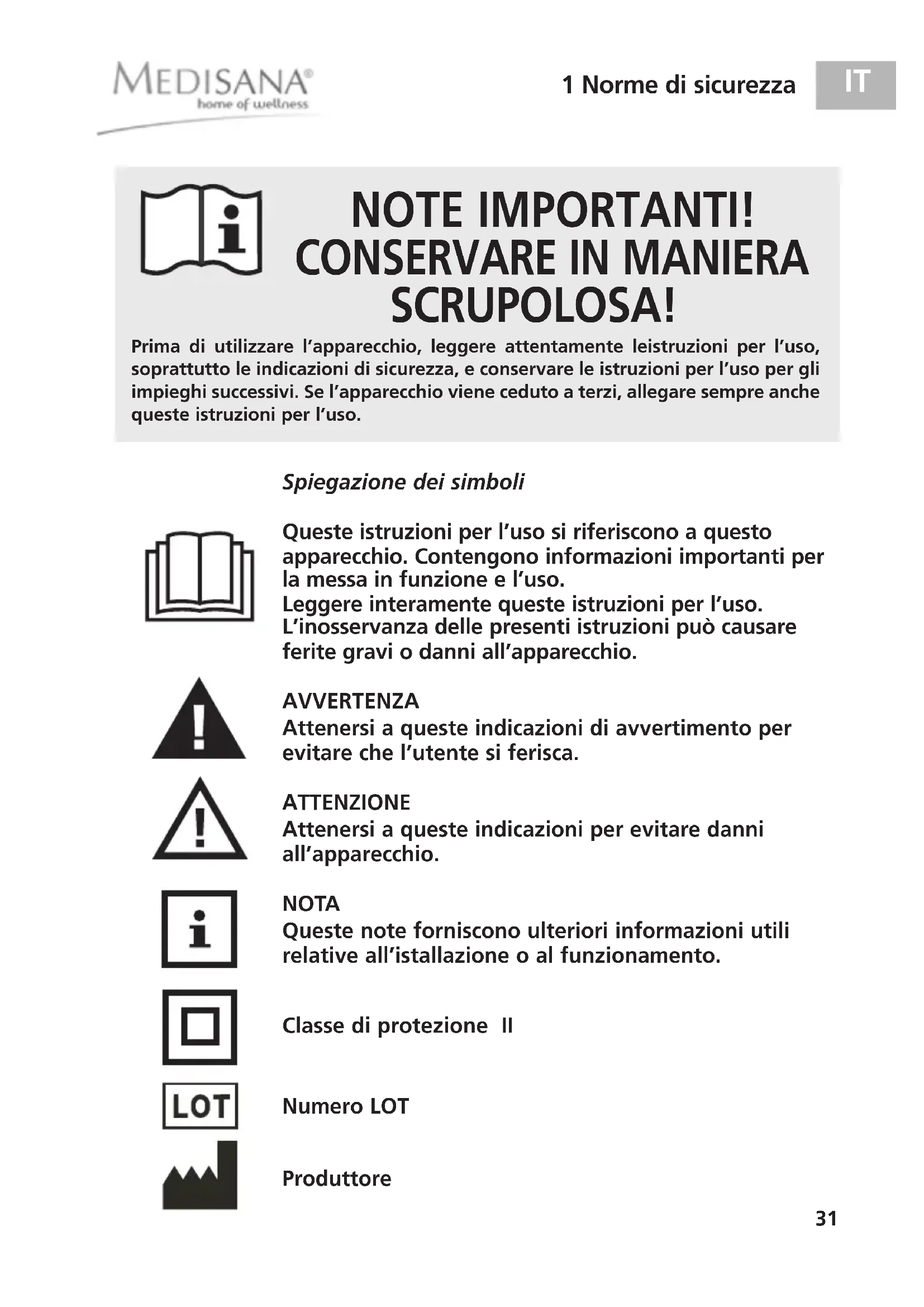 SCRUPOLOSA! Queste istruzioni per l’uso si riferiscono a questo apparecchio. Contengono informazioni importanti per la messa in funzione e l’uso. Leggere interamente queste istruzioni per l’uso. L’inosservanza delle presenti istruzioni può causare ferite gravi o danni all’apparecchio. AVVERTENZA Attenersi a queste indicazioni di avvertimento per evitare che l’utente si ferisca. ATTENZIONE Attenersi a queste indicazioni per evitare danni all’apparecchio. NOTA Queste note forniscono ulteriori informazioni utili relative all’istallazione o al funzionamento. Classe di protezione II Numero LOT Produttore Prima di utilizzare l’apparecchio, leggere attentamente leistruzioni per l’uso,soprattutto le indicazioni di sicurezza, e conservare le istruzioni per l’uso per gliimpieghi successivi. Se l’apparecchio viene ceduto a terzi, allegare sempre anchequeste istruzioni per l’uso. Spiegazione dei simboli 88930_MCN_WEST_Final_aktual.qxd:Massagesitz 31.03.2011 10:42 Uhr Seite 3132 1 Norme di sicurezza