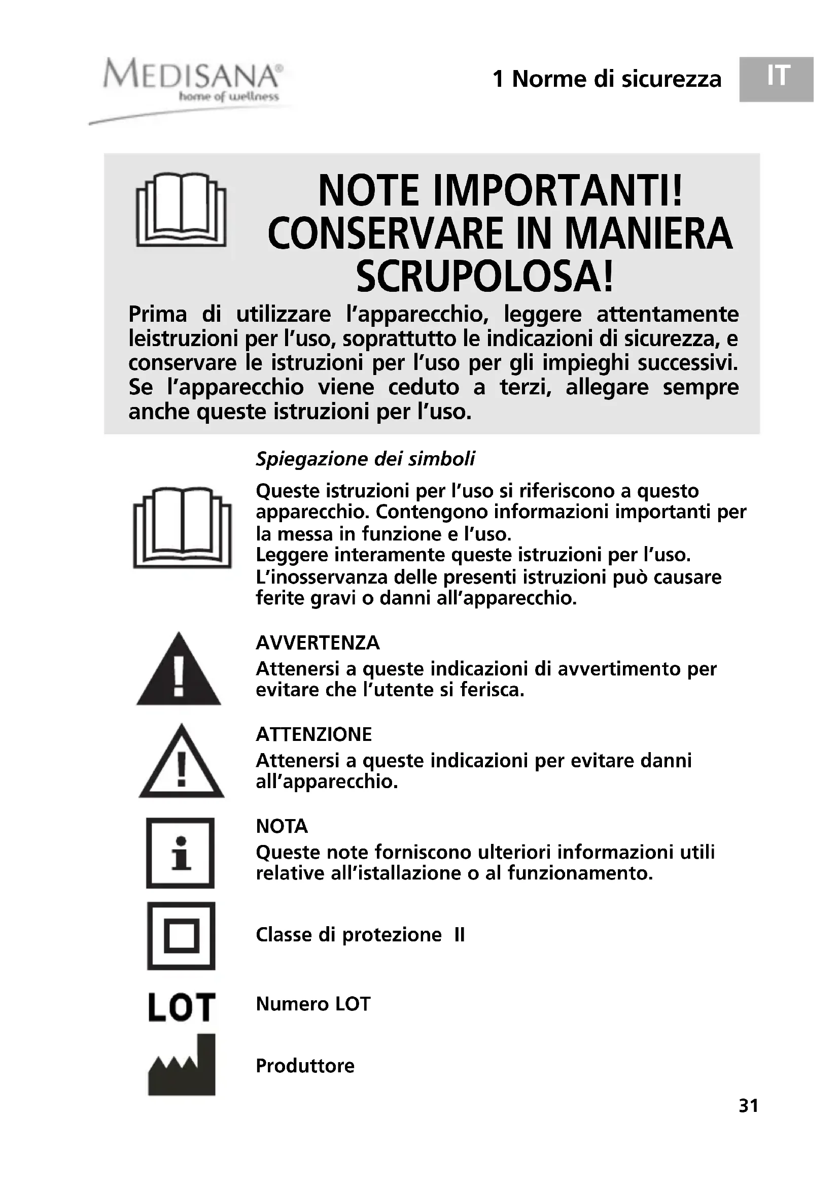 SCRUPOLOSA! Queste istruzioni per l’uso si riferiscono a questoapparecchio. Contengono informazioni importanti perla messa in funzione e l’uso. Leggere interamente queste istruzioni per l’uso. L’inosservanza delle presenti istruzioni può causareferite gravi o danni all’apparecchio.AVVERTENZAAttenersi a queste indicazioni di avvertimento per evitare che l’utente si ferisca.ATTENZIONEAttenersi a queste indicazioni per evitare danniall’apparecchio. NOTA Queste note forniscono ulteriori informazioni utili relative all’istallazione o al funzionamento.Classe di protezione IINumero LOTProduttore Spiegazione dei simboli Prima di utilizzare l’apparecchio, leggere attentamente leistruzioni per l’uso, soprattutto le indicazioni di sicurezza, e conservare le istruzioni per l’uso per gli impieghi successivi. Se l’apparecchio viene ceduto a terzi, allegare sempre anche queste istruzioni per l’uso.32 1 Norme di sicurezza