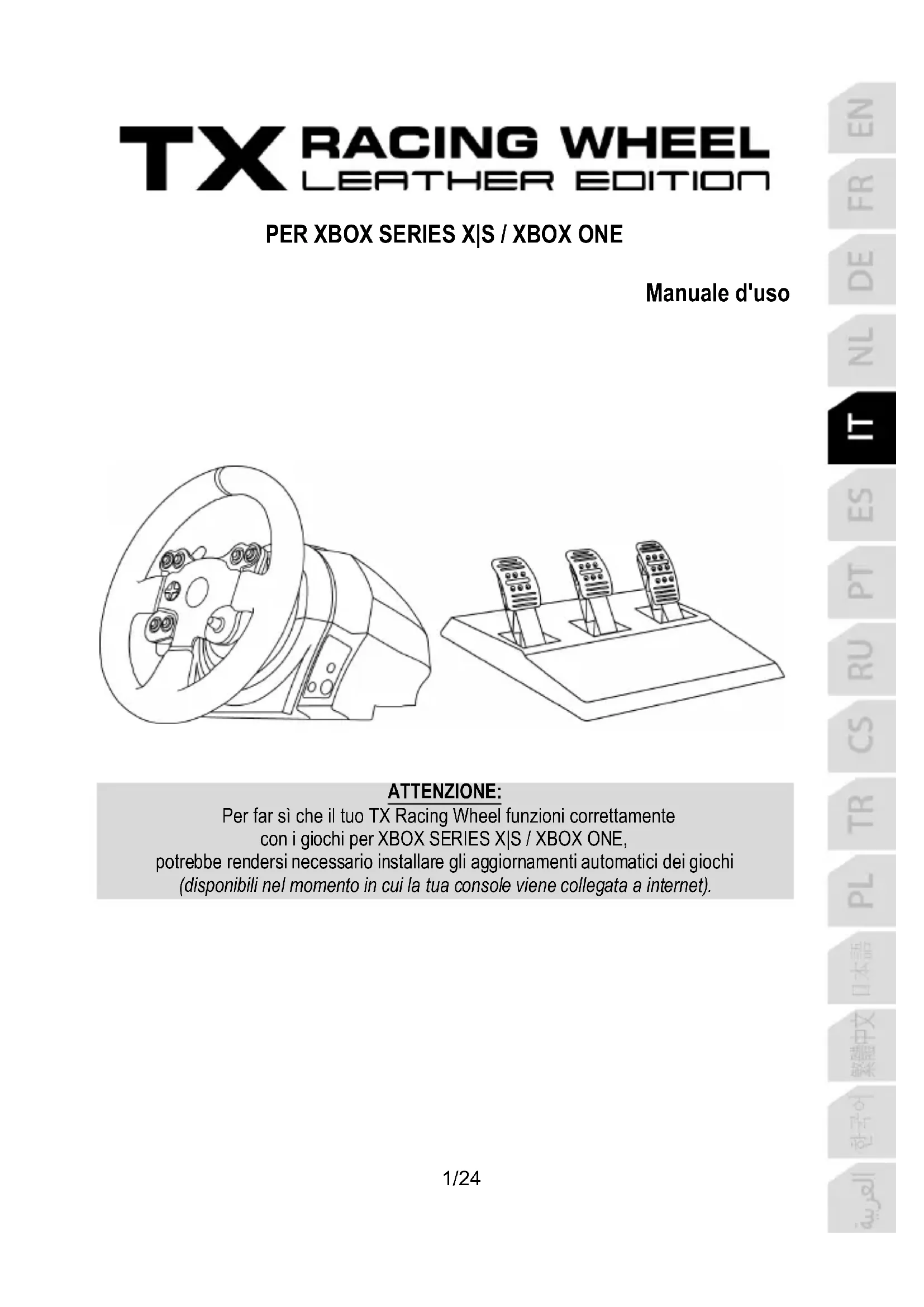 ATTENZIONE: Per far sì che il tuo TX Racing Wheel funzioni correttamente con i giochi per XBOX SERIES X|S / XBOX ONE, potrebbe rendersi necessario installare gli aggiornamenti automatici dei giochi (disponibili nel momento in cui la tua console viene collegata a internet).2/24 CARATTERISTICHE TECNICHE 1 Base del volante 2 Volante 3 2 leve del cambio sequenziali (Up & Down) 4 D-Pad multidirezionale 5 Pulsante (3 posizioni) 6 Pulsante MODE + led Rosso/Verde 7 Pulsante Xbox Guide 8 Led bianco 9 Ampia foro filettato (per sistema di aggancio e vite di fissaggio) 10 Sistema di aggancio 11 Vite di fissaggio in metallo