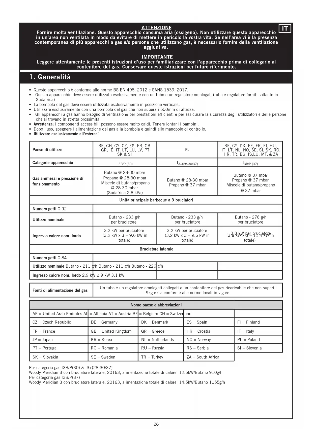 BE, CY, DK, EE, FR, FI, HU, IT, LT, NL, NO, SE, SI, SK, RO, HR, TR, BG, IS,LU, MT, & ZA Categorie apparecchio I 3B/P (30) 3+(28-30/37) 3B/P (37) Gas ammessi e pressione di funzionamento Butano @ 28-30 mbar Propano @ 28-30 mbar Miscele di butano/propano @ 28-30 mbar (Sudafrica 2,8 kPa) Butano @ 28-30 mbar Propano @ 37 mbar Butano @ 37 mbar Propano @ 37 mbar Miscele di butano/propano @ 37 mbar Unità principale barbecue a 3 bruciatori Numero getti 0.92 Utilizzo nominale Butano - 233 g/h per bruciatore Butano - 233 g/h per bruciatore Butano - 276 g/h per bruciatore Ingresso calore nom. lordo 3,2 kW per bruciatore (3,2 kW x 3 = 9,6 kW in totale) 3,2 kW per bruciatore (3,2 kW x 3 = 9,6 kW in totale) 3,8 kW per bruciatore (3,8 kW x 3 = 11.4 kW in totale) Bruciatore laterale Numero getti 0.84 Utilizzo nominale Butano - 211 g/h Butano - 211 g/h Butano - 226 g/h Ingresso calore nom. lordo 2.9 kW 2.9 kW 3.1 kW Nome paese e abbreviazioni AE = United Arab Emirates AL = Albania AT = Austria BE = Belgium CH = Switzerland CZ = Czech Republic DE = Germany DK = Denmark ES = Spain FI = Finland FR = France GB = United Kingdom GR = Greece HR = Croatia IT = Italy JP = Japan KR = Korea NL = Netherlands NO = Norway PL = Poland PT = Portugal RO = Romania RU = Russia RS = Serbia SI = Slovenia SK = Slovakia SE = Sweden TR = Turkey ZA = South Africa Per categoria gas I3B/P(30) & I3+(28-30/37) Woody Meridian 3 con bruciatore laterale, 20163, alimentazione totale di calore: 12.5kW/Butano 910g/h Per categoria gas I3B/P(37) Woody Meridian 3 con bruciatore laterale, 20163, alimentazione totale di calore: 14.5kW/Butano 1055g/h2727