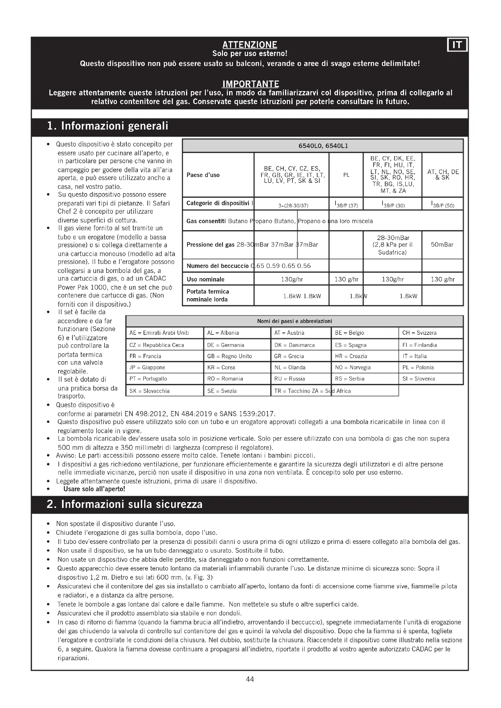 - Usare solo all’aperto! 6540L0, 6540L1Paese d’usoBE, CH, CY, CZ, ES, FR, GB, GR, IE, IT, LT, LU, LV, PT, SK & SI BE, CY, DK, EE, FR, FI, HU, IT, LT, NL, NO, SE, SI, SK, RO, HR, TR, BG, IS,LU, MT, & ZAAT, CH, DE & SKCategorie di dispositivi I3+(28-30/37) 3B/P (37) 3B/P (30) 3B/P (50)Gas consentiti Butano Propano Butano, Propano o una loro miscelaPressione del gas 28-30mBar 37mBar 37mBar28-30mBar(2,8 kPa per il Sudafrica)50mBarNumero del beccuccio 0.65 0.59 0.65 0.56 Uso nominale 130g/hr 130 g/hr 130g/hr 130 g/hr Portata termica nominale lorda1.8kW 1.8kW 1.8kW 1.8kWNomi dei paesi e abbreviazioni AE = Emirati Arabi Uniti AL = Albania AT = Austria BE = Belgio CH = Svizzera CZ = Repubblica Ceca DE = Germania DK = Danimarca ES = Spagna FI = Finlandia FR = Francia GB = Regno Unito GR = Grecia HR = Croazia IT = Italia JP = Giappone KR = Corea NL = Olanda NO = Norvegia PL = Polonia PT = Portogallo RO = Romania RU = Russia RS = Serbia SI = Slovenia SK = Slovacchia SE = Svezia TR = Tacchino ZA = Sud Africa