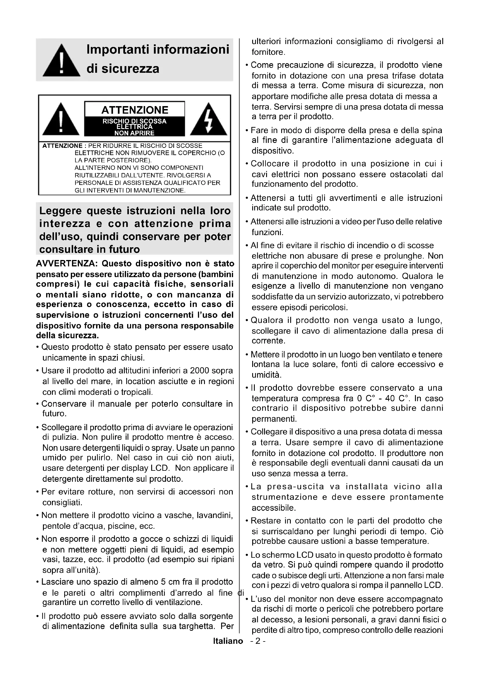 - Al ne di evitare il rischio di incendio o di scosse elettriche non abusare di prese e prolunghe. Non aprire il coperchio del monitor per eseguire interventi di manutenzione in modo autonomo. Qualora le esigenze a livello di manutenzione non vengano soddisfatte da un servizio autorizzato, vi potrebbero essere episodi pericolosi.