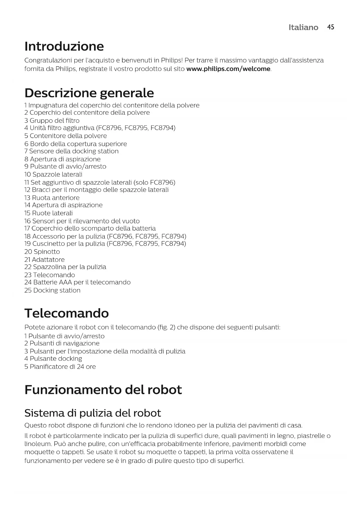 FrançaisItaliano Introduzione Congratulazioni per l'acquisto e benvenuti in Philips! Per trarre il massimo vantaggio dall'assistenza fornita da Philips, registrate il vostro prodotto sul sito www.philips.com/welcome. Descrizione generale 1 Impugnatura del coperchio del contenitore della polvere 2 Coperchio del contenitore della polvere 3 Gruppo del filtro 4 Unità filtro aggiuntiva (FC8796, FC8795, FC8794) 5 Contenitore della polvere 6 Bordo della copertura superiore 7 Sensore della docking station 8 Apertura di aspirazione 9 Pulsante di avvio/arresto 10 Spazzole laterali 11 Set aggiuntivo di spazzole laterali (solo FC8796) 12 Bracci per il montaggio delle spazzole laterali 13 Ruota anteriore 14 Apertura di aspirazione 15 Ruote laterali 16 Sensori per il rilevamento del vuoto 17 Coperchio dello scomparto della batteria 18 Accessorio per la pulizia (FC8796, FC8795, FC8794) 19 Cuscinetto per la pulizia (FC8796, FC8795, FC8794) 20 Spinotto 21 Adattatore 22 Spazzolina per la pulizia 23 Telecomando 24 Batterie AAA per il telecomando 25 Docking station Telecomando Potete azionare il robot con il telecomando (fig. 2) che dispone dei seguenti pulsanti: 1 Pulsante di avvio/arresto 2 Pulsanti di navigazione 3 Pulsanti per l'impostazione della modalità di pulizia 4 Pulsante docking 5 Pianificatore di 24 ore Funzionamento del robot Sistema di pulizia del robot Questo robot dispone di funzioni che lo rendono idoneo per la pulizia dei pavimenti di casa. Il robot è particolarmente indicato per la pulizia di superfici dure, quali pavimenti in legno, piastrelle o linoleum. Può anche pulire, con un'efficacia probabilmente inferiore, pavimenti morbidi come moquette o tappeti. Se usate il robot su moquette o tappeti, la prima volta osservatene il funzionamento per vedere se è in grado di pulire questo tipo di superfici.