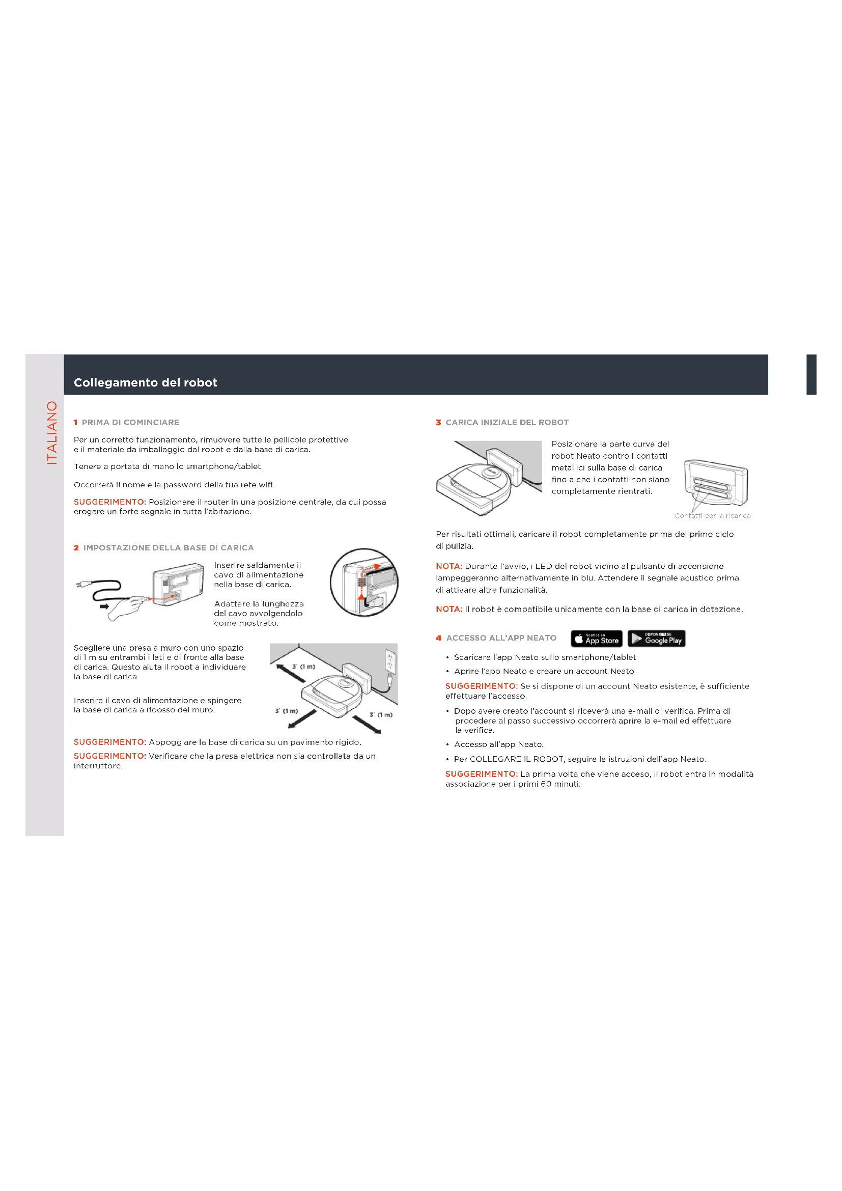 - Batteries: tous les 12 à 18mois Utilisez le guide d'utilisateur disponible sur www.NeatoRobotics.com/UG Regardez le tutoriel vidéo disponible sur www.NeatoRobotics.com/support.1 PRIMA DI COMINCIARE Per un corretto funzionamento, rimuovere tutte le pellicole protettive eilmateriale da imballaggio dal robot e dalla base di carica. Tenere a portata di mano lo smartphone/tablet. Occorrerà il nome e la password della tua rete wifi. SUGGERIMENTO: Posizionare il router in una posizione centrale, da cui possa erogare un forte segnale in tutta l’abitazione.