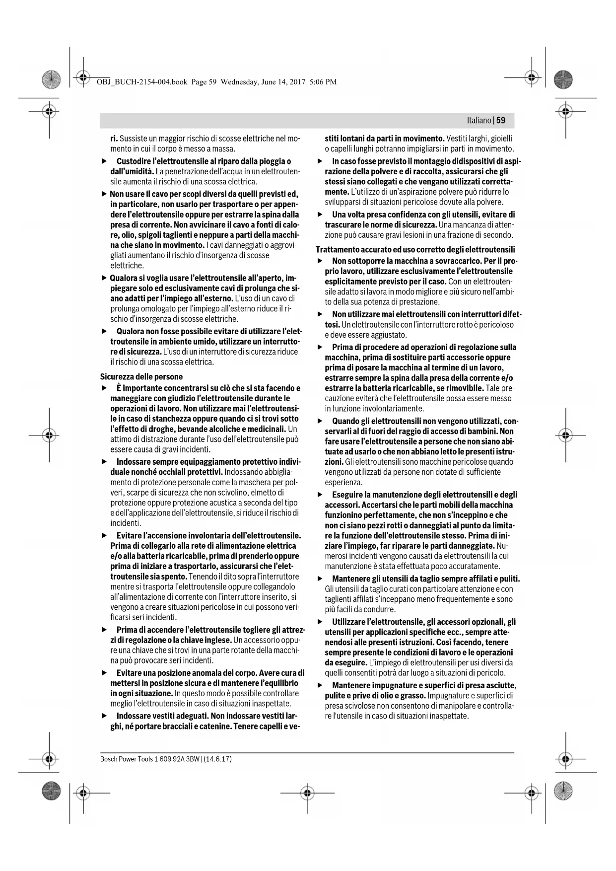 Leggere tutte le avvertenze di pe- ricolo, le istruzioni operative, le fi- gure e le specifiche accluse al presente elettroutensile. Il mancato rispetto di tutte le istruzioni sottoelencate potrà comportare il pericolo di scosse elettriche, incendi e/o gravi lesioni. Conservare tutte le avvertenze di pericolo e le istruzioni operative per ogni esigenza futura. Il termine «elettroutensile» utilizzato nelle avvertenze di peri- colo si riferisce ad utensili elettrici alimentati dalla rete (con cavo) e ad utensili elettrici alimentati a batteria (senza cavo). Durante l’uso di elettroutensili de- vono essere osservate le seguenti misure di sicurezza fondamentali per la protezione contro scosse elettriche, pericolo di lesioni ed incendio. Leggere tutte queste indicazioni prima di utilizzare il pre- sente elettroutensile e conservare accuratamente le indi- cazioni di sicurezza. Sicurezza della postazione di lavoro Tenere la postazione di lavoro sempre pulita e ben illu- minata. Il disordine oppure zone della postazione di lavoro non illuminate possono essere causa di incidenti. Evitare d’impiegare l’elettroutensile in ambienti sog- getti al rischio di esplosioni nei quali si abbia presenza di liquidi, gas o polveri infiammabili. Gli elettroutensili producono scintille che possono far infiammare la polvere o i gas. Tenere lontani i bambini ed altre persone durante l’im- piego dell’elettroutensile. Eventuali distrazioni potranno comportare la perdita del controllo sull’elettroutensile. Sicurezza elettrica La spina di allacciamento alla rete dell’elettroutensile deve essere adatta alla presa. Evitare assolutamente di apportare modifiche alla spina. Non impiegare spine adattatrici assieme ad elettroutensili dotati di collega- mento a terra. Le spine non modificate e le prese adatte allo scopo riducono il rischio di scosse elettriche. Evitare il contatto fisico con superfici collegate a terra, come tubi, riscaldamenti, cucine elettriche e frigorife- N.° do produto Sargento 1 609 B04 224 Placas de alimentação 1 609 B05 242 Saco de pó 1 609 B05 010 Lâminas de serra para madeira e materiais de placas, pai- néis e tramelas Lâmina de serra 216 x 30 mm, 48 dentes 2 608 640 641 Lâminas de serra para plástico e metais não-ferrosos Lâmina de serra 216 x 30 mm, 80 dentes 2 608 640 447 Lâminas de serra para todos os tipos de piso laminado Lâmina de serra 216 x 30 mm, 60 dentes 2 608 642 133 AVVERTENZA AVVERTENZA OBJ_BUCH-2154-004.book Page 58 Wednesday, June 14, 2017 5:06 PMItaliano | 59 Bosch Power Tools 1 609 92A 3BW | (14.6.17) ri. Sussiste un maggior rischio di scosse elettriche nel mo- mento in cui il corpo è messo a massa. Custodire l’elettroutensile al riparo dalla pioggia o dall’umidità. La penetrazione dell’acqua in un elettrouten- sile aumenta il rischio di una scossa elettrica. Non usare il cavo per scopi diversi da quelli previsti ed, in particolare, non usarlo per trasportare o per appen- dere l’elettroutensile oppure per estrarre la spina dalla presa di corrente. Non avvicinare il cavo a fonti di calo- re, olio, spigoli taglienti e neppure a parti della macchi- na che siano in movimento. I cavi danneggiati o aggrovi- gliati aumentano il rischio d’insorgenza di scosse elettriche. Qualora si voglia usare l’elettroutensile all’aperto, im- piegare solo ed esclusivamente cavi di prolunga che si- ano adatti per l’impiego all’esterno. L’uso di un cavo di prolunga omologato per l’impiego all’esterno riduce il ri- schio d’insorgenza di scosse elettriche. Qualora non fosse possibile evitare di utilizzare l’elet- troutensile in ambiente umido, utilizzare un interrutto- re di sicurezza. L’uso di un interruttore di sicurezza riduce il rischio di una scossa elettrica. Sicurezza delle persone È importante concentrarsi su ciò che si sta facendo e maneggiare con giudizio l’elettroutensile durante le operazioni di lavoro. Non utilizzare mai l’elettroutensi- le in caso di stanchezza oppure quando ci si trovi sotto l’effetto di droghe, bevande alcoliche e medicinali. Un attimo di distrazione durante l’uso dell’elettroutensile può essere causa di gravi incidenti. Indossare sempre equipaggiamento protettivo indivi- duale nonché occhiali protettivi. Indossando abbiglia- mento di protezione personale come la maschera per pol- veri, scarpe di sicurezza che non scivolino, elmetto di protezione oppure protezione acustica a seconda del tipo e dell’applicazione dell’elettroutensile, si riduce il rischio di incidenti. Evitare l’accensione involontaria dell’elettroutensile. Prima di collegarlo alla rete di alimentazione elettrica e/o alla batteria ricaricabile, prima di prenderlo oppure prima di iniziare a trasportarlo, assicurarsi che l’elet- troutensile sia spento. Tenendo il dito sopra l’interruttore mentre si trasporta l’elettroutensile oppure collegandolo all’alimentazione di corrente con l’interruttore inserito, si vengono a creare situazioni pericolose in cui possono veri- ficarsi seri incidenti. Prima di accendere l’elettroutensile togliere gli attrez- zi di regolazione o la chiave inglese. Un accessorio oppu- re una chiave che si trovi in una parte rotante della macchi- na può provocare seri incidenti. Evitare una posizione anomala del corpo. Avere cura di mettersi in posizione sicura e di mantenere l’equilibrio in ogni situazione. In questo modo è possibile controllare meglio l’elettroutensile in caso di situazioni inaspettate. Indossare vestiti adeguati. Non indossare vestiti lar- ghi, né portare bracciali e catenine. Tenere capelli e ve- stiti lontani da parti in movimento. Vestiti larghi, gioielli o capelli lunghi potranno impigliarsi in parti in movimento. In caso fosse previsto il montaggio didispositivi di aspi- razione della polvere e di raccolta, assicurarsi che gli stessi siano collegati e che vengano utilizzati corretta- mente. L’utilizzo di un’aspirazione polvere può ridurre lo svilupparsi di situazi