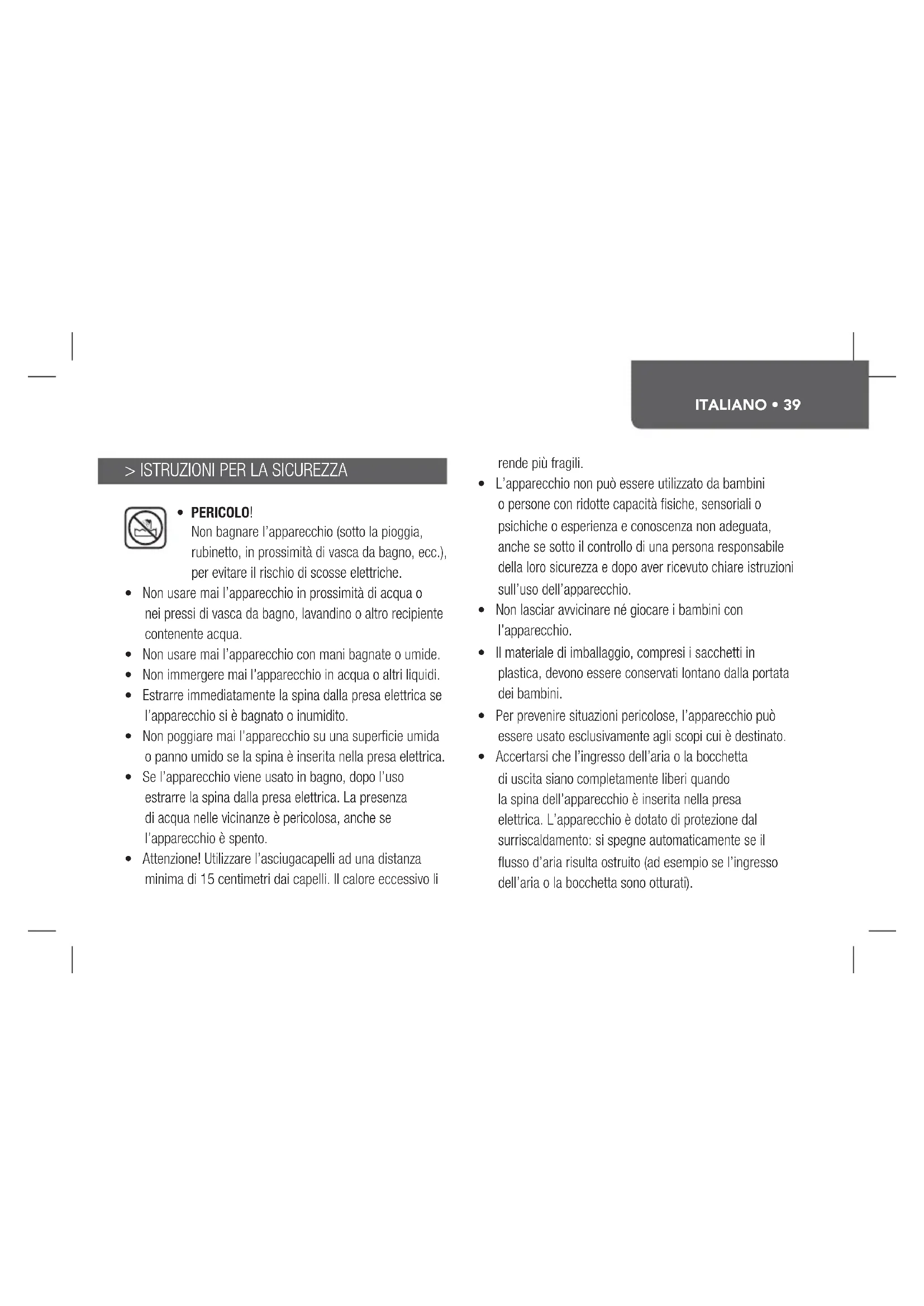 - Se l'apparecchio viene usato in bagno, après l'uso estrarre la spina dalla presa elettrica. La presenza di acqua nelle vicinanze è pericolosa,anche se l'apparecchio è spento.