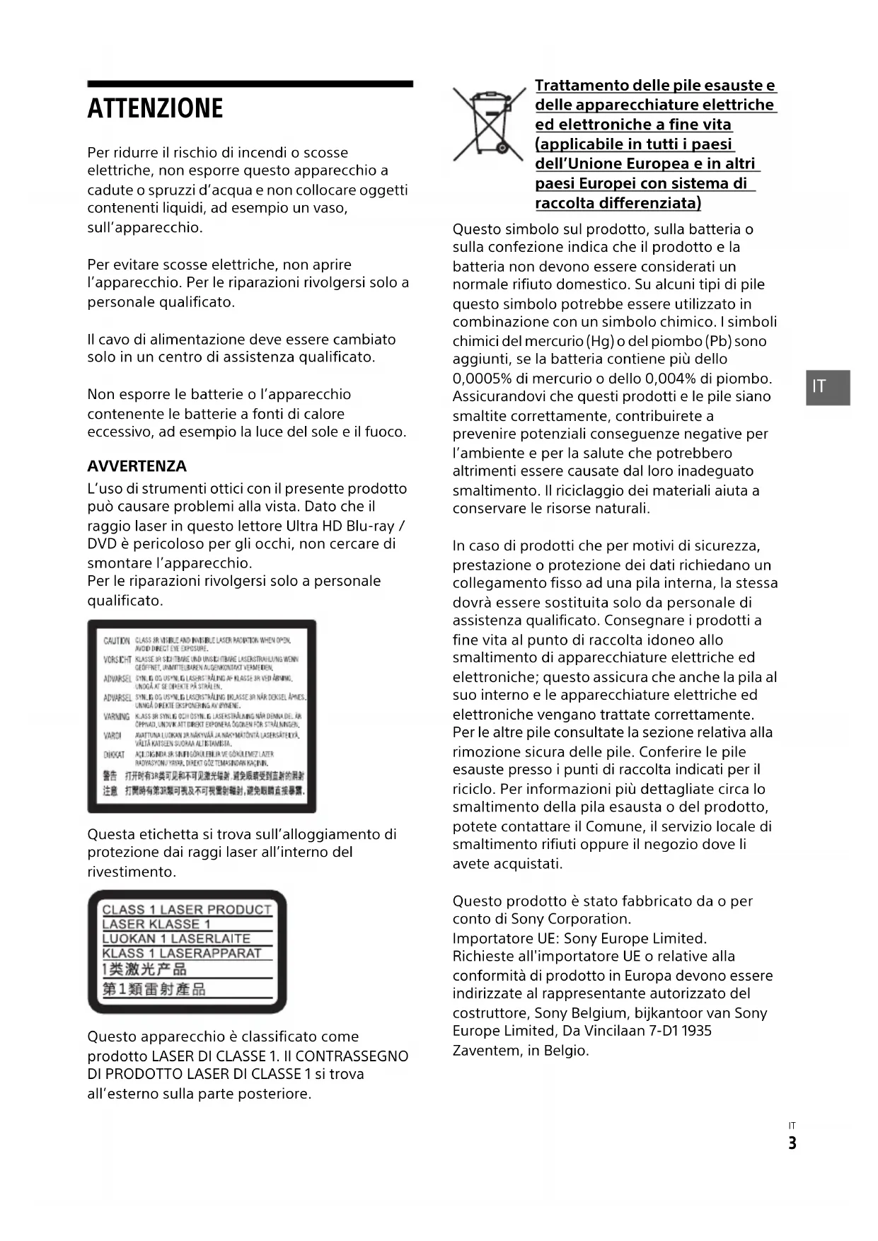 ATTENZIONE Per ridurre il rischio di incendi o scosse elettriche, non esporre questo apparecchio a cadute o spruzzi d’acqua e non collocare oggetti contenenti liquidi, ad esempio un vaso, sull’apparecchio. Per evitare scosse elettriche, non aprire l’apparecchio. Per le riparazioni rivolgersi solo a personale qualificato. Il cavo di alimentazione deve essere cambiato solo in un centro di assistenza qualificato. Non esporre le batterie o l’apparecchio contenente le batterie a fonti di calore eccessivo, ad esempio la luce del sole e il fuoco. AVVERTENZA L’uso di strumenti ottici con il presente prodotto può causare problemi alla vista. Dato che il raggio laser in questo lettore Ultra HD Blu-ray / DVD è pericoloso per gli occhi, non cercare di smontare l’apparecchio. Per le riparazioni rivolgersi solo a personale qualificato. Questa etichetta si trova sull’alloggiamento di protezione dai raggi laser all’interno del rivestimento. Questo apparecchio è classificato come prodotto LASER DI CLASSE 1. Il CONTRASSEGNO DI PRODOTTO LASER DI CLASSE 1 si trova all’esterno sulla parte posteriore. Trattamento delle pile esauste e delle apparecchiature elettriche ed elettroniche a fine vita (applicabile in tutti i paesi dell’Unione Europea e in altri paesi Europei con sistema di raccolta differenziata) Questo simbolo sul prodotto, sulla batteria o sulla confezione indica che il prodotto e la batteria non devono essere considerati un normale rifiuto domestico. Su alcuni tipi di pile questo simbolo potrebbe essere utilizzato in combinazione con un simbolo chimico. I simboli chimici del mercurio (Hg) o del piombo (Pb) sono aggiunti, se la batteria contiene più dello 0,0005% di mercurio o dello 0,004% di piombo. Assicurandovi che questi prodotti e le pile siano smaltite correttamente, contribuirete a prevenire potenziali conseguenze negative per l’ambiente e per la salute che potrebbero altrimenti essere causate dal loro inadeguato smaltimento. Il riciclaggio dei materiali aiuta a conservare le risorse naturali. In caso di prodotti che per motivi di sicurezza, prestazione o protezione dei dati richiedano un collegamento fisso ad una pila interna, la stessa dovrà essere sostituita solo da personale di assistenza qualificato. Consegnare i prodotti a fine vita al punto di raccolta idoneo allo smaltimento di apparecchiature elettriche ed elettroniche; questo assicura che anche la pila al suo interno e le apparecchiature elettriche ed elettroniche vengano trattate correttamente. Per le altre pile consultate la sezione relativa alla rimozione sicura delle pile. Conferire le pile esauste presso i punti di raccolta indicati per il riciclo. Per informazioni più dettagliate circa lo smaltimento della pila esausta o del prodotto, potete contattare il Comune, il servizio locale di smaltimento rifiuti oppure il negozio dove li avete acquistati. Questo prodotto è stato fabbricato da o per conto di Sony Corporation. Importatore UE: Sony Europe Limited. Richieste all'importatore UE o relative alla conformità di prodotto in Europa devono essere indirizzate al rappresentante autorizzato del costruttore, Sony Belgium, bijkantoor van Sony Europe Limited, Da Vincilaan 7-D1 1935 Zaventem, in Belgio. IT4