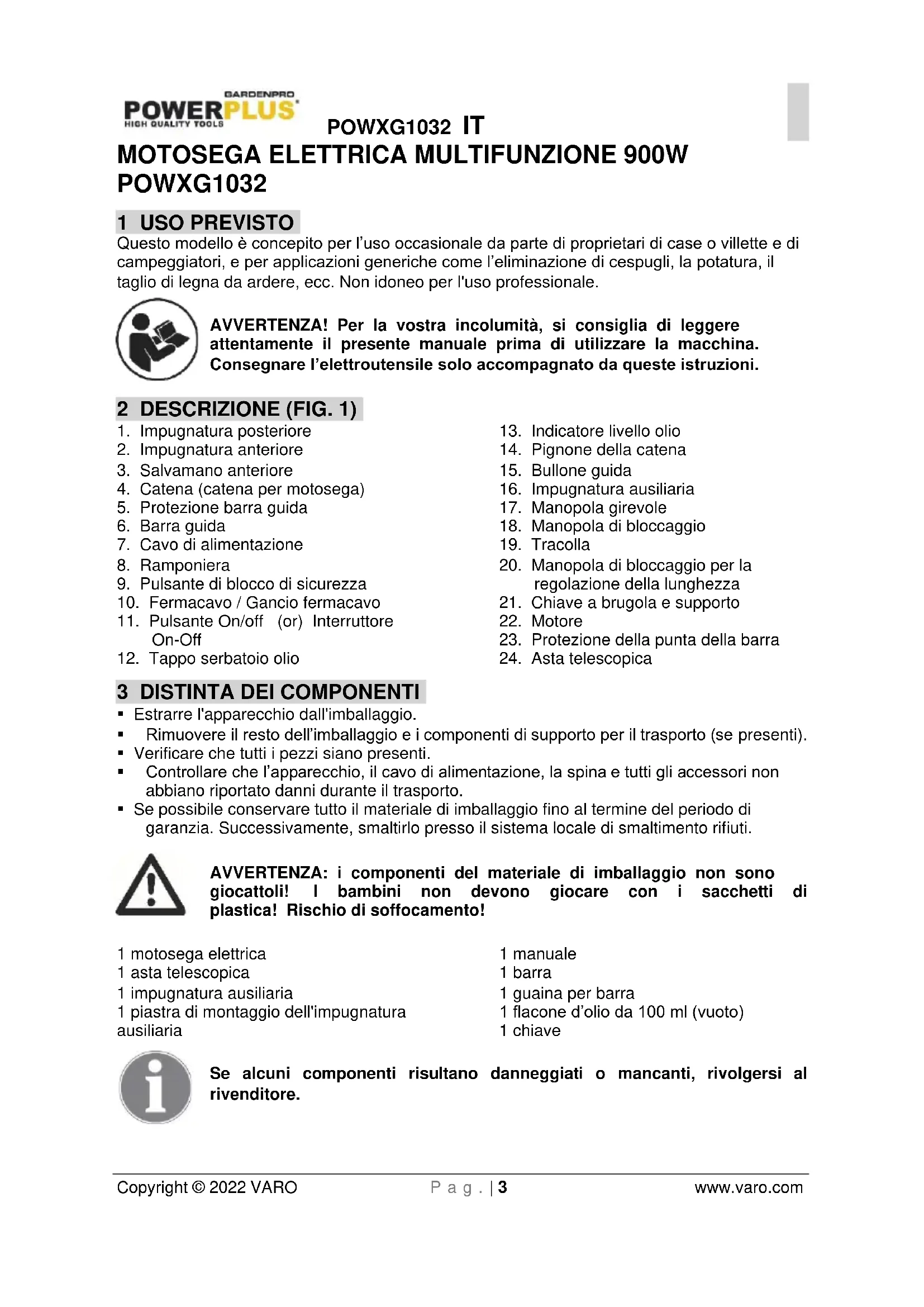 - Quando si avvia la motosega, accertarsi che non venga a contatto con nulla.POWXG1032 IT Copyright © 2022 VARO P a g . | 7 www.varo.com