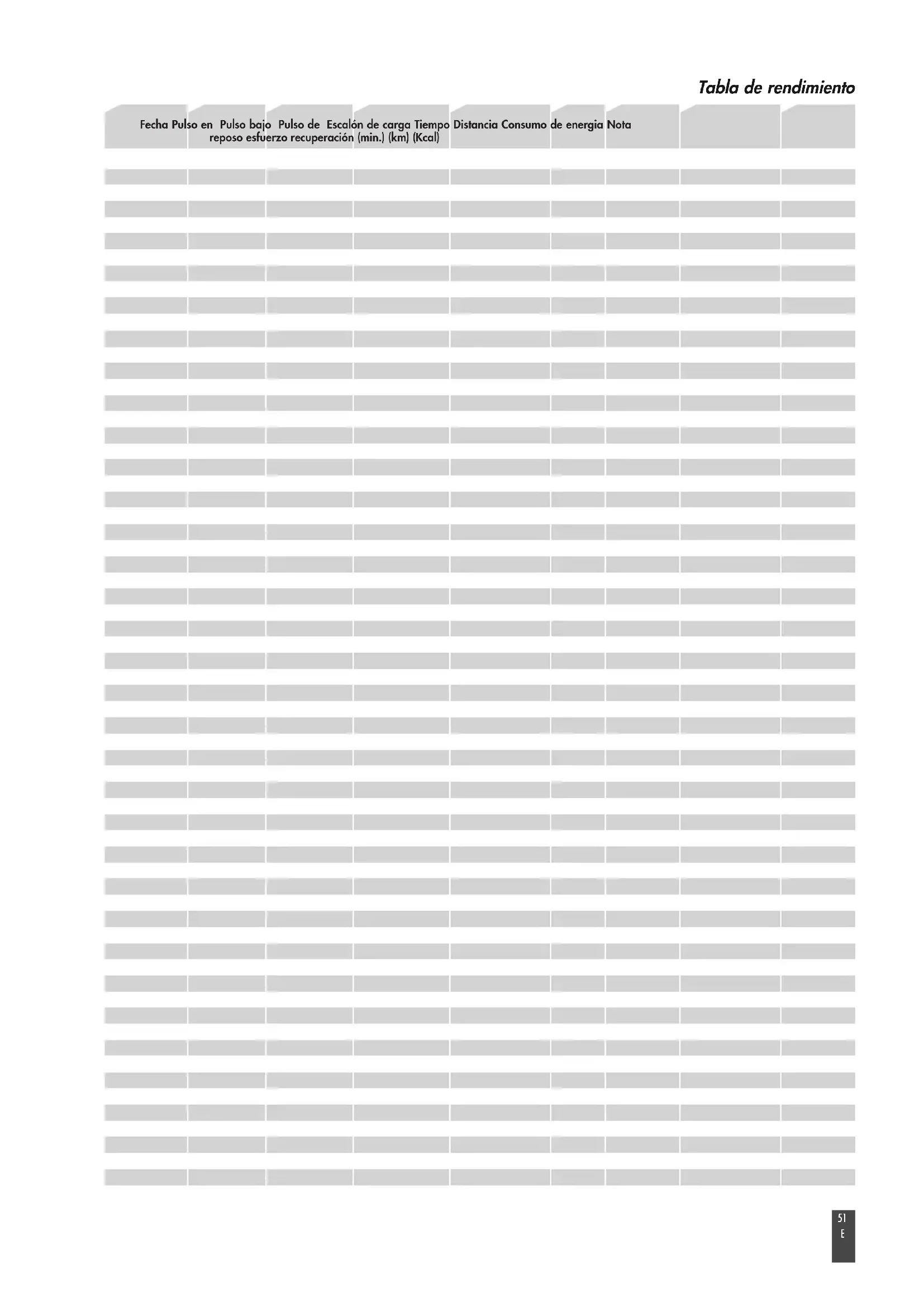 Pulsazioni Fitness (75 % delle pulsa. max.) Pulsazioni max. (220 meno l’etą) Istruzioni per l'allenamento Per la vostra sicurezza ■ Prima di iniziare l'allenamento chiarite con il vostro medico di fiducia se il vostro stato fisico si adatta ad effettuare un allenamento con questo attrezzo. Il reperto medico dovreb- be essere la base per il vostro programma di allenamento. Un allenamento sbagliato o esagerato può causare proble- mi di salute. Questo apparecchio è stato sviluppato in particolare per que- lle persone che praticano attività sportive nel tempo libero. Si adatta ottimamente al miglioramento del sistema cardiaco. Si deve programmare l’allenamento in maniera metodica secondo i principi dell’allenamento alla resistenza. Quindi sono necessarie modifiche e adattamenti al proprio sistema cardiaco. Si comprendono l’abbassamento della frequenza delle pulsazioni a riposo e delle pulsazioni in fase di affatica- mento. Il cuore ha così più tempo a disposizione per riempire i ven- tricoli e per l’irrorazione sanguigna dei muscoli cardiaci (attra- verso i vasi coronari. Inoltre aumentano la profondità di res- pirazione e la quantità di aria inspirata (capacità vitale. Altri cambiamenti positivi si rilevano nel sistema metabolico. Per raggiungere questi cambiamenti positivi bisogna pianificare l’allenamento secondo linee ben precise. Configurazione e programmazione dell’allenamento Il punto di riferimento da tenere presente nella programma- zione dell'allenamento è la condizione fisica individuale del singolo utente. Sottoponendosi ad un test di resistenza fisica il proprio medico di famiglia può diagnosticare la capacità di rendimento individuale su cui impostare l’allenamento.Se non viene eseguito un test di resistenza fisica è sconsigliabile sot- toporre l’organismo a sforzi troppo elevati. Il seguente princi- pio deve essere rispettato in fase di configurazione: l’allena- mento di resistenza viene programmato sia attraverso la dura- ta che per mezzo dell’altezza/intensità dell’esercizio. Intensità di esercizio Nel corso dell’allenamento l’intensità dello sforzo dovrebbe essere tenuta sotto controllo in base ai valori della frequenza cardiaca. La frequenza cardiaca massima al minuto > 220 meno l’età – non deve essere superata. La frequenza cardia- ca ottimale risulta dall’età indicata e dal traguardo impostato. Obiettivo dell’allenamento: bruciare i grassi/ridurre il peso La frequenza cardiaca ottimale viene empiricamente calcolata con la formula (220 – età x 0,65. Indicazioni: l’organismo produce l’energia necessaria per la combustione dei grassi solo dopo un allenamento di almeno 30 minuti.Tabla de rendimiento