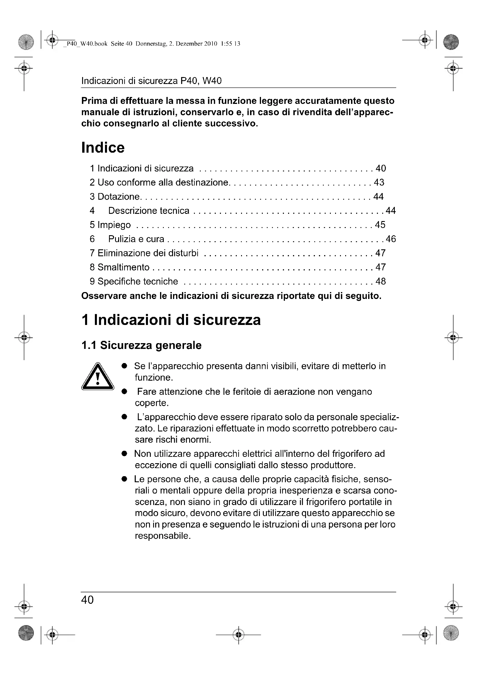 z Collegare l’apparecchio solo nel modo seguente: – con il cavo di allacciamento CC (fig. 1 2, pagina 3) alla spina CC del veicolo (ad es. accendisigari) – oppure con il cavo di allacciamento da 230 V (fig. 1 3, pagina 3) alla rete di alimentazione in corrente alternata da 230 V z Non estrarre mai la spina dalla presa tirando il cavo di allaccia- mento. z Se il cavo di allacciamento è danneggiato, deve essere sostitu- ito con un cavo dello stesso tipo e con le stesse specifiche. z Staccare l'apparecchio dalla rete – prima di effettuare la pulizia e la cura – dopo ogni utilizzo z Quando il frigorifero è collegato ad un presa da CC: interrompe- re il collegamento o spegnere il frigorifero se il motore viene spento. Altrimenti la batteria si può scaricare. z Per imbarcazioni: con il collegamento alla rete fare sempre in modo che l’alimentazione elettrica sia sempre controllata da un interruttore differenziale! Pericolo di morte! z Staccare il frigorifero e le altre utenze dalla batteria prima di col- legare il caricabatterie rapido! z Confrontare i dati della tensione riportati sulla targhetta con quelli delle prese e degli attacchi disponibili. _P40_W40.book Seite 41 Donnerstag, 2. Dezember 2010 1:55 13Indicazioni di sicurezza P40, W40