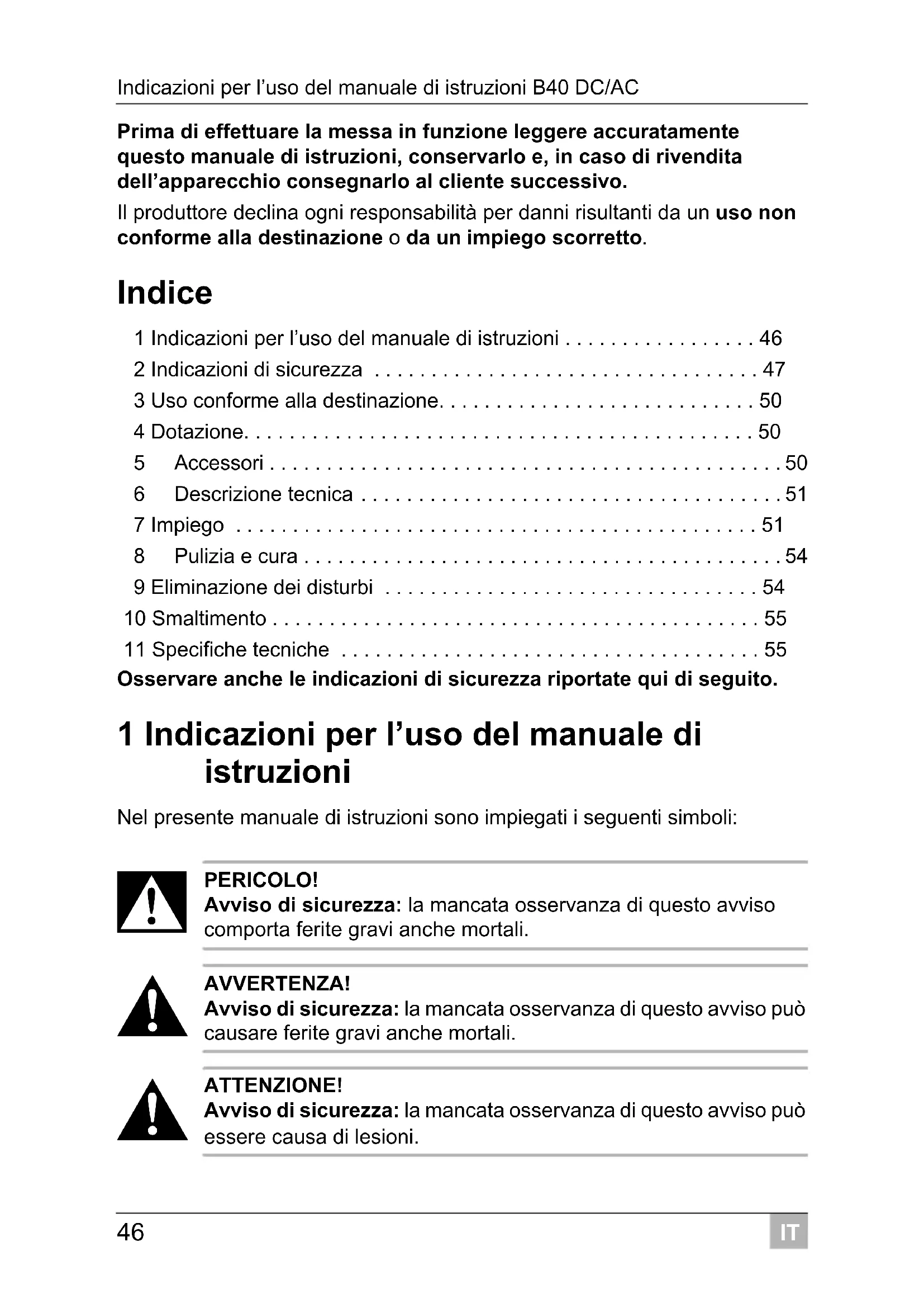 ATTENZIONE! Avviso di sicurezza: la mancata osservanza di questo avviso può essere causa di lesioni. _B40.book Seite 46 Mittwoch, 20. April 2011 3:28 15IT B40 DC/AC Indicazioni di sicurezza
