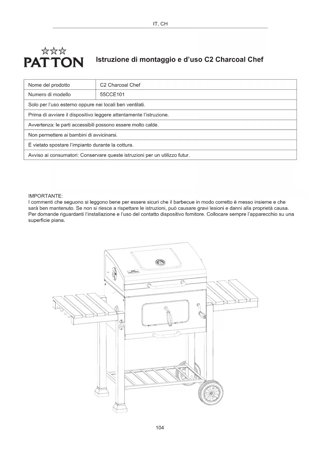 PRIMA DI MONTARE O UTILIZZARE IL NUovo PATTON C2 CHARCOAL CHEF, LA CURA COMPLETAMENTE LEGGERE IL MANUALE DI ISTRUZIONI E TUTTO LA SICUREZZA