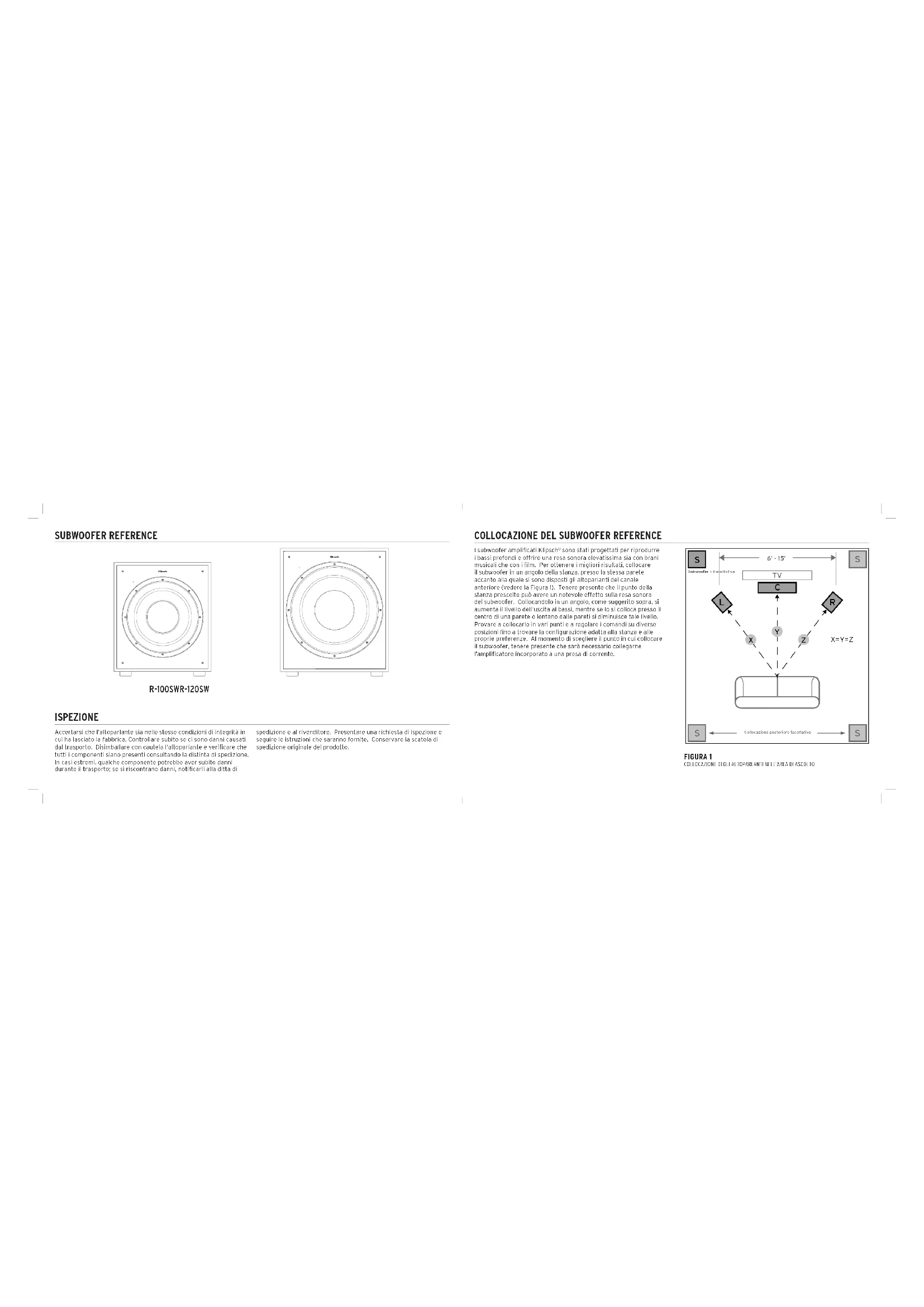 FIGURA 1 COLLOCAZIONE DEGLI ALTOPARLANTI NELL’AREA DI ASCOLTOAccertarsi che l’altoparlante sia nelle stesse condizioni di integrità in cui ha lasciato la fabbrica. Controllare subito se ci sono danni causati dal trasporto. Disimballare con cautela l’altoparlante e verificare che tutti i componenti siano presenti consultando la distinta di spedizione. In casi estremi, qualche componente potrebbe aver subito danni durante il trasporto; se si riscontrano danni, notificarli alla ditta di spedizione e al rivenditore. Presentare una richiesta di ispezione e seguire le istruzioni che saranno fornite. Conservare la scatola di spedizione originale del prodotto. ISPEZIONE 6’ - 15’Subwoofer + FacoltativaCollocazione posteriore facoltativaLINE IN L/LFE LINE IN L/LFE PRE • OUT LFE
