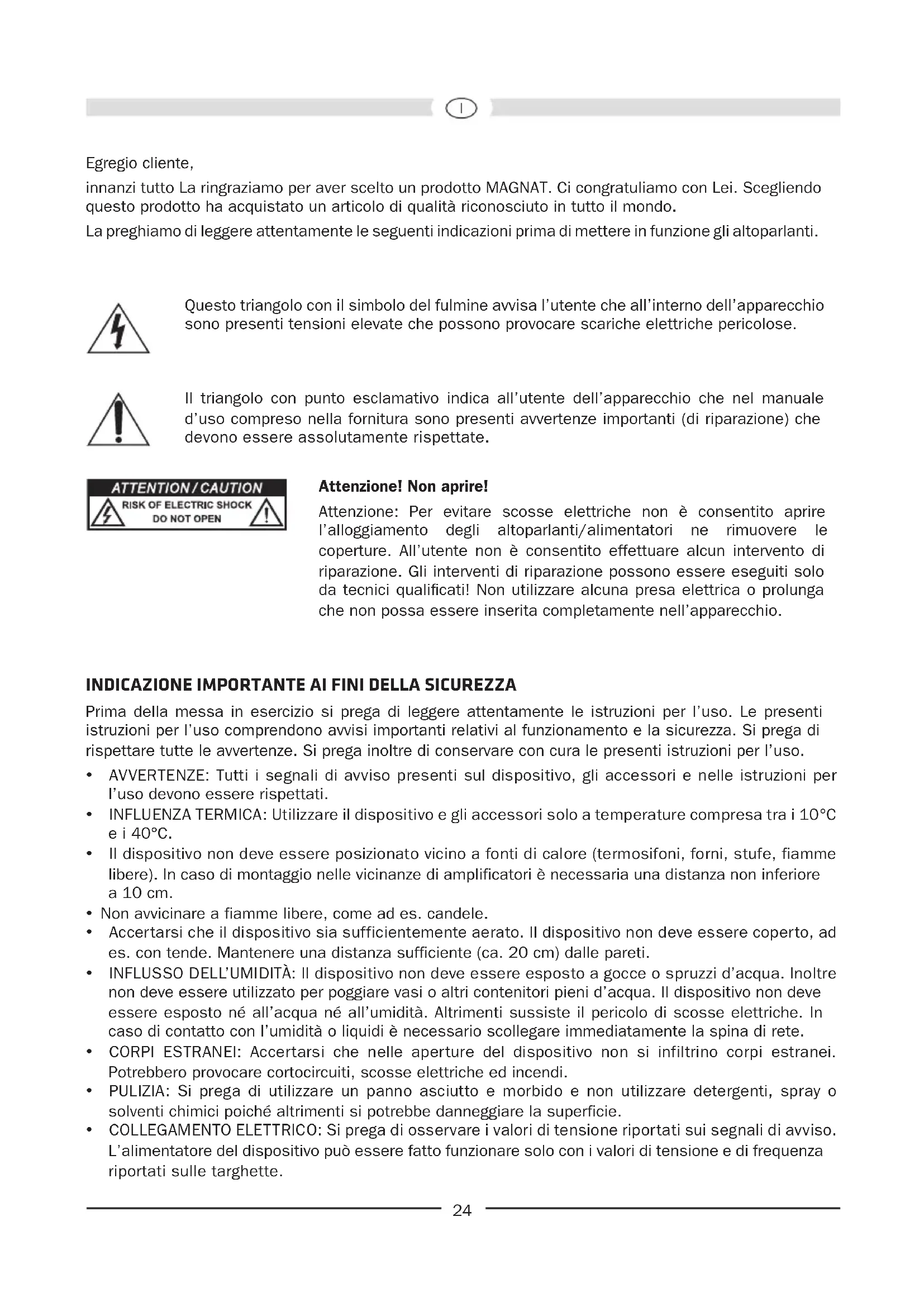 Egregio cliente, innanzi tutto La ringraziamo per aver scelto un prodotto MAGNAT. Ci congratuliamo con Lei. Scegliendo questo prodotto ha acquistato un articolo di qualità riconosciuto in tutto il mondo. La preghiamo di leggere attentamente le seguenti indicazioni prima di mettere in funzione gli altoparlanti. Questo triangolo con il simbolo del fulmine avvisa l’utente che all’interno dell’apparecchio sono presenti tensioni elevate che possono provocare scariche elettriche pericolose. Il triangolo con punto esclamativo indica all’utente dell’apparecchio che nel manuale d’uso compreso nella fornitura sono presenti avvertenze importanti (di riparazione) che devono essere assolutamente rispettate. Attenzione! Non aprire! Attenzione: Per evitare scosse elettriche non è consentito aprire l’alloggiamento degli altoparlanti/alimentatori ne rimuovere le coperture. All’utente non è consentito effettuare alcun intervento di riparazione. Gli interventi di riparazione possono essere eseguiti solo da tecnici qualicati! Non utilizzare alcuna presa elettrica o prolunga che non possa essere inserita completamente nell’apparecchio.