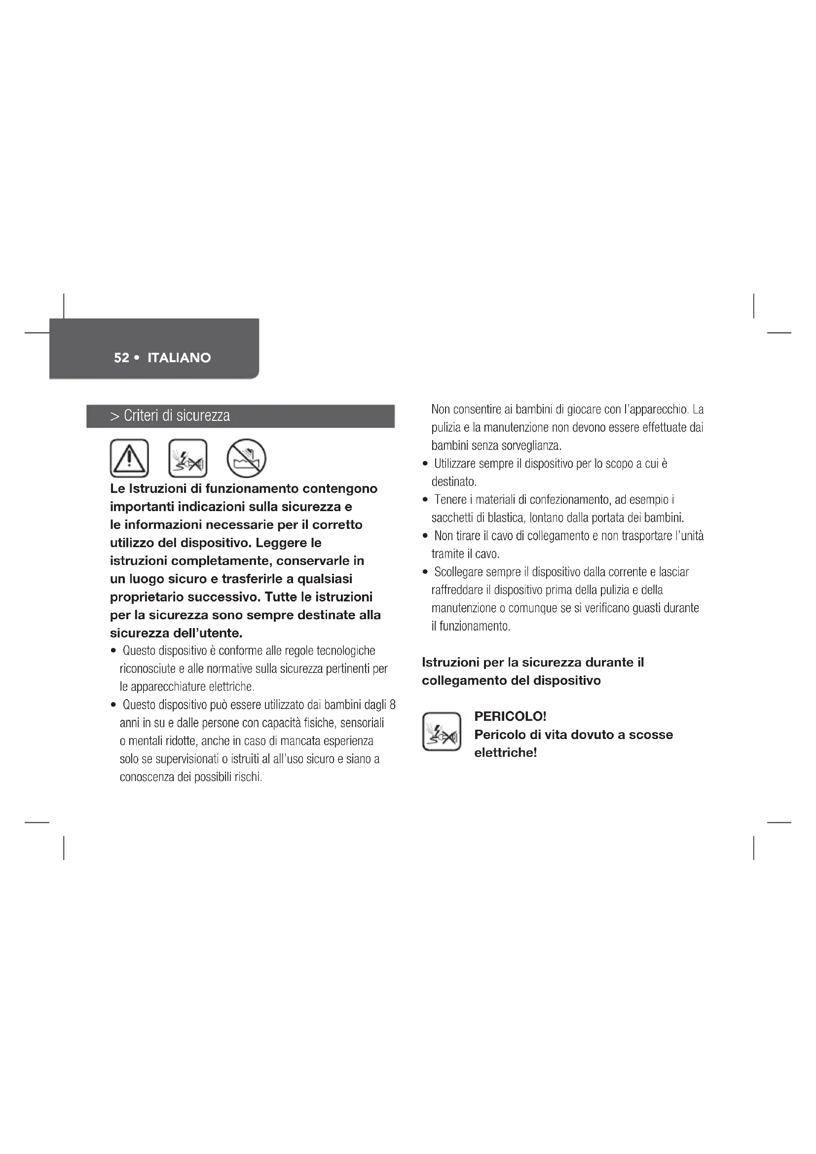 Esiste un pericolo di vita se il dispositorio acceso viene aicontatto con l'acqua. Pertanto, osservare le seguenti istruzioni per la sicurezza: