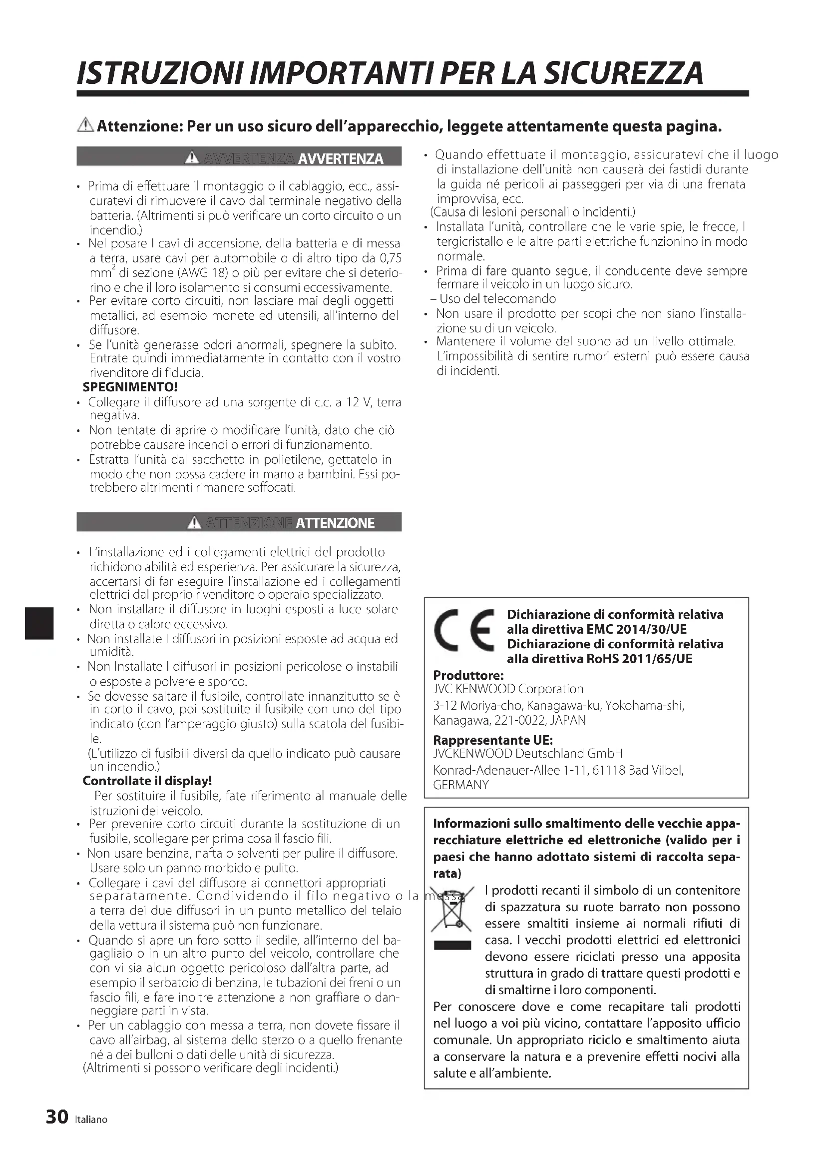 - Mantenere il volume del suono ad un livello ottimale. L’impossibilità di sentire rumori esterni può essere causa di incidenti. Informazioni sullo smaltimento delle vecchie appa- recchiature elettriche ed elettroniche (valido per i paesi che hanno adottato sistemi di raccolta sepa- rata) I prodotti recanti il simbolo di un contenitore di spazzatura su ruote barrato non possono essere smaltiti insieme ai normali rifiuti di casa. I vecchi prodotti elettrici ed elettronici devono essere riciclati presso una apposita struttura in grado di trattare questi prodotti e di smaltirne i loro componenti. Per conoscere dove e come recapitare tali prodotti nel luogo a voi più vicino, contattare l’apposito ufficio comunale. Un appropriato riciclo e smaltimento aiuta a conservare la natura e a prevenire effetti nocivi alla salute e all’ambiente. Dichiarazione di conformità relativa alla direttiva EMC 2014/30/UE Dichiarazione di conformità relativa alla direttiva RoHS 2011/65/UE Produttore: JVC KENWOOD Corporation 3-12 Moriya-cho, Kanagawa-ku, Yokohama-shi, Kanagawa, 221-0022, JAPAN Rappresentante UE: JVCKENWOOD Deutschland GmbH Konrad-Adenauer-Allee 1-11, 61118 Bad Vilbel, GERMANY 5ITJ.indd305ITJ.indd30 2017/12/2818:502017/12/2818:50Italiano