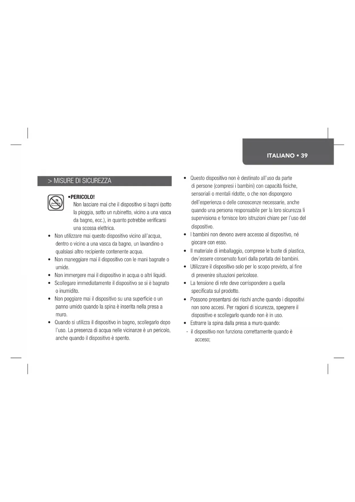 - Quando si utilizes il disposativo in bagno, scollegarlo after o'uso. La presenza di acqua nelle vicinanze è un pericolo, ande quando il disposativo è spento.