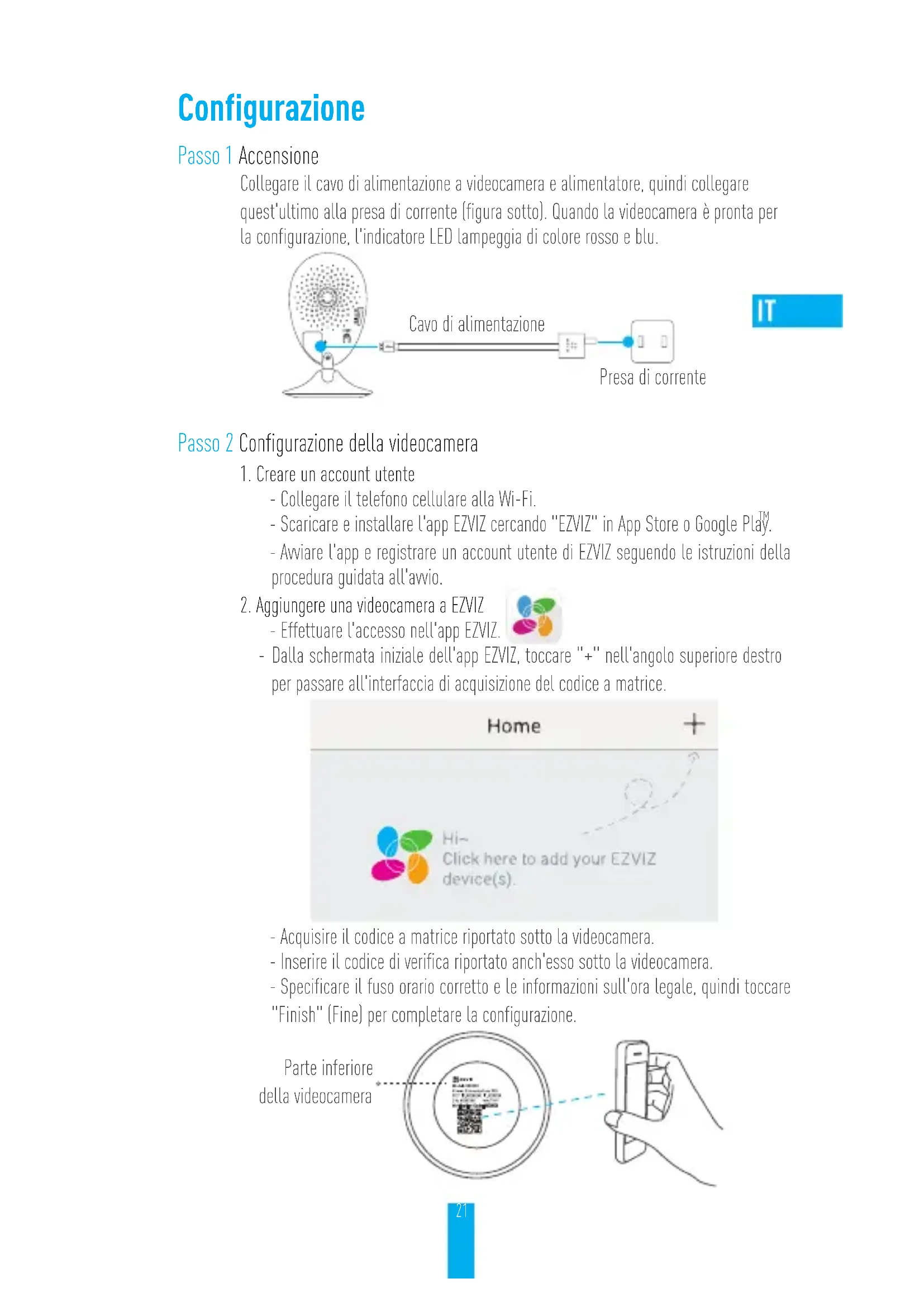 Il est conseillé d’utiliser l’adaptateur d’alimentation EZVIZ standard pour fournir une tension électrique stable. Pour plus d’informations, veuillez visiter le site Web www.ezvizlife.com.21 Configurazione Passo 1 Accensione Collegare il cavo di alimentazione a videocamera e alimentatore, quindi collegare quest'ultimo alla presa di corrente (figura sotto). Quando la videocamera è pronta per la configurazione, l'indicatore LED lampeggia di colore rosso e blu. Cavo di alimentazione Presa di corrente Passo 2 Configurazione della videocamera